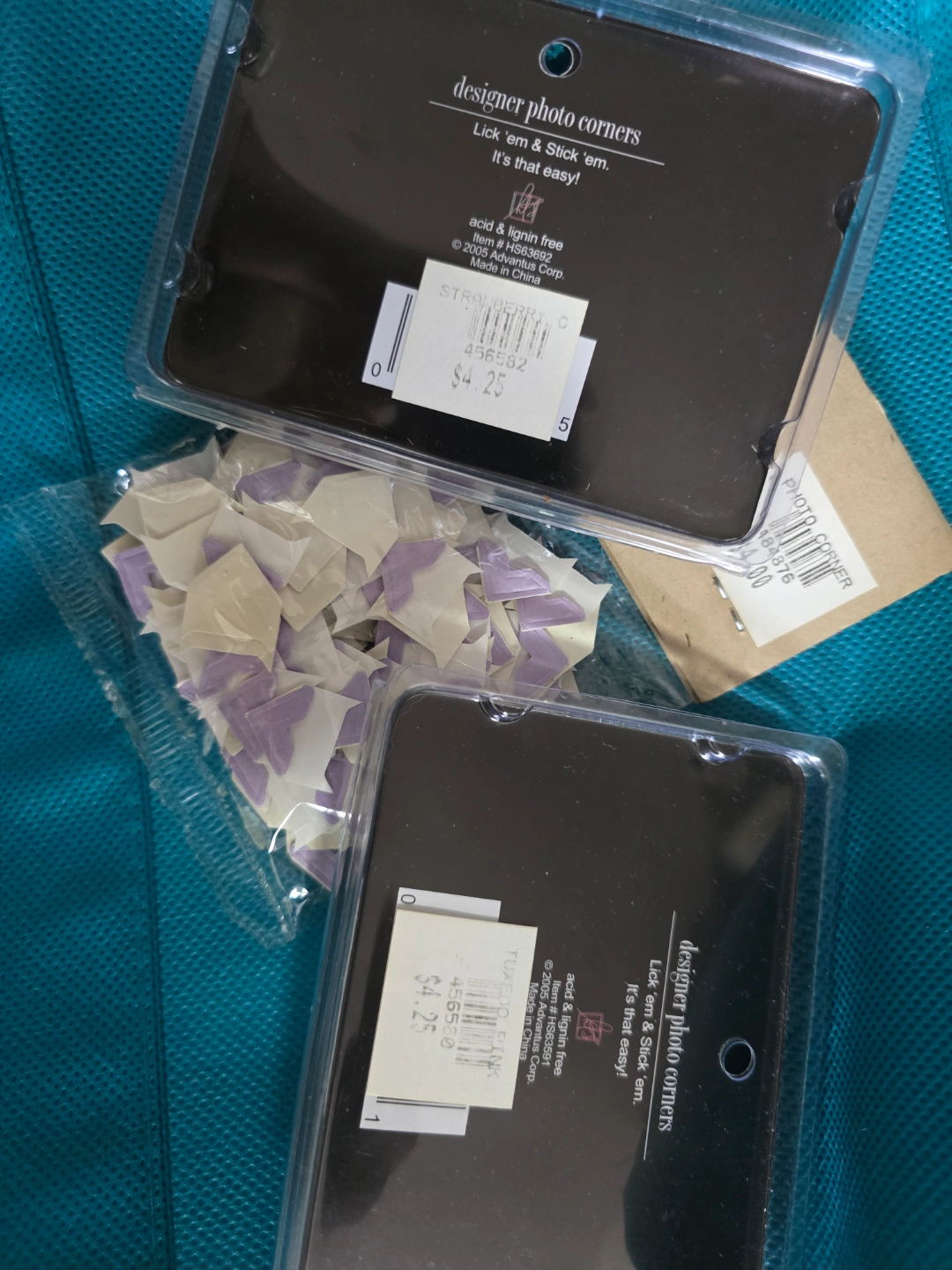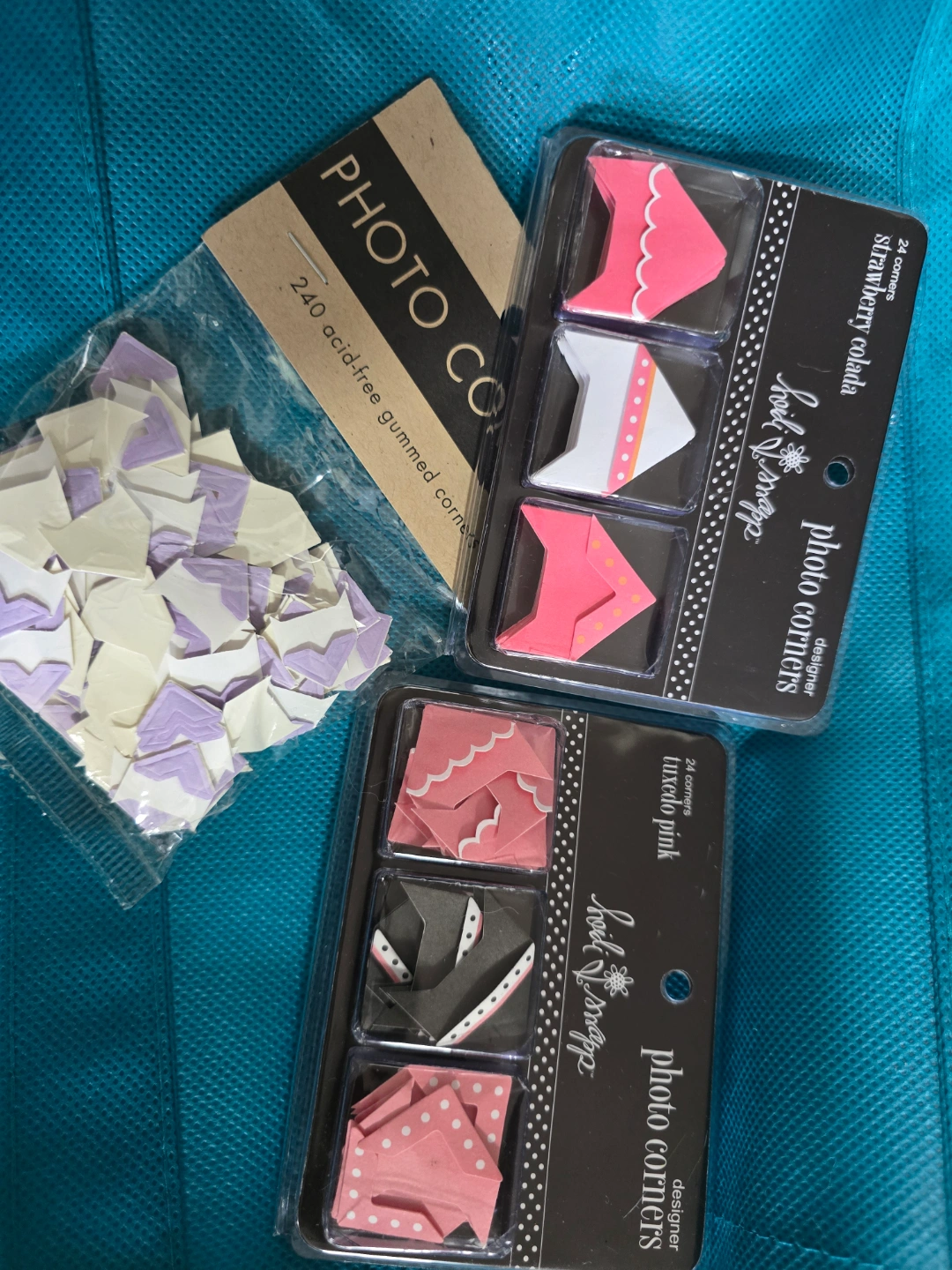 3 packs of decorative photo corners. One pack contains 240 acid-free, gummed corners. Great for scrapbooking and other crafting projects. One pack is a light purple and white color scheme and the other is pink and black polka dots.