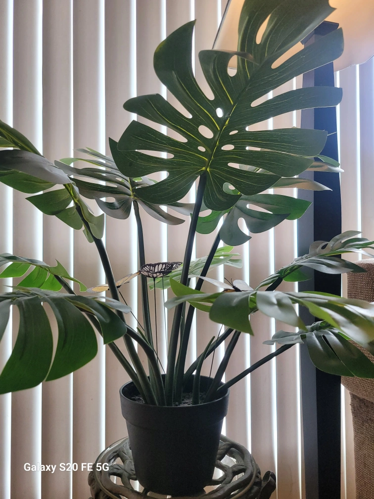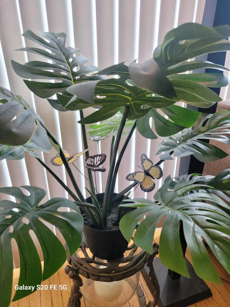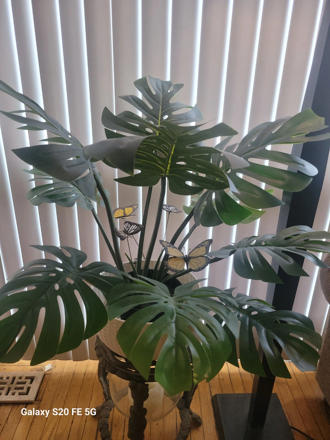 Medium artificial Monstera deliciosa plant. Planted in a black sturdy pot. Decorated with artificial butterflies that can be removed. Looks great inside other pots.