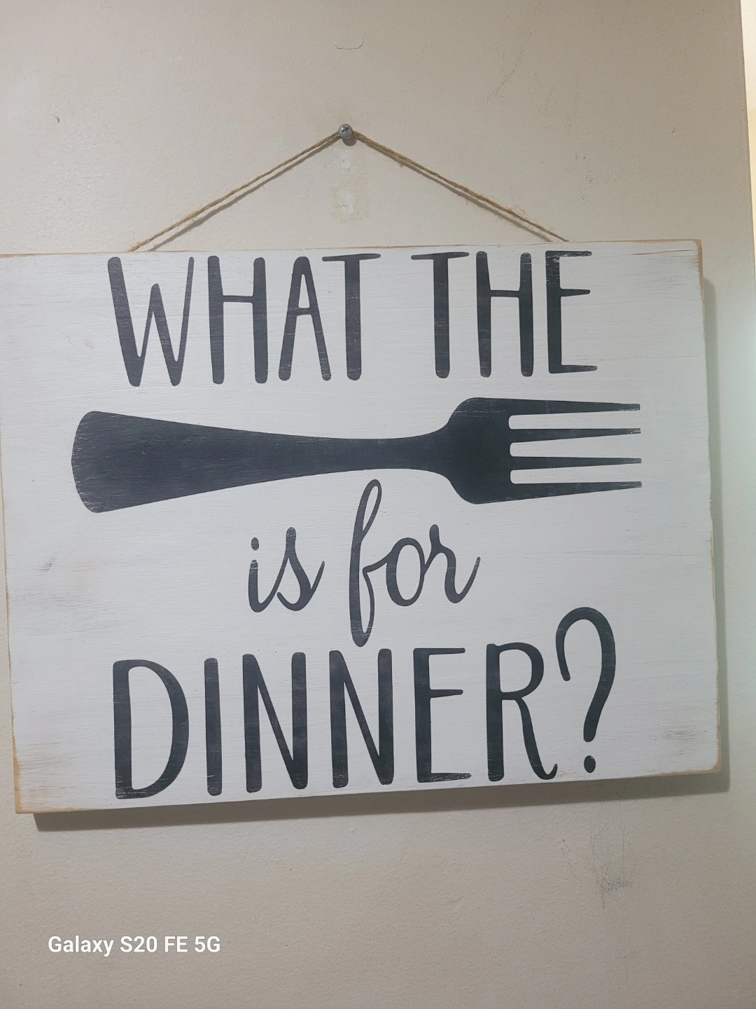 Cute kitchen sign. Features a fork and the phrase "What the Fork is for Dinner?" Whitewashed wood. Perfect addition to your kitchen.