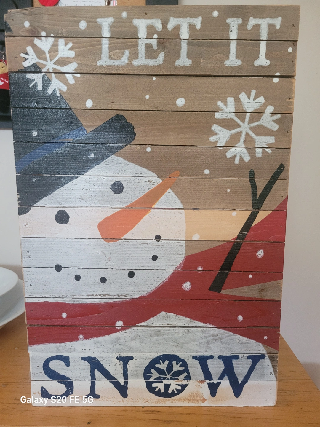 Rustic wooden sign featuring a snowman design. Let it Snow text. Perfect winter decor. Hand-painted and unique.