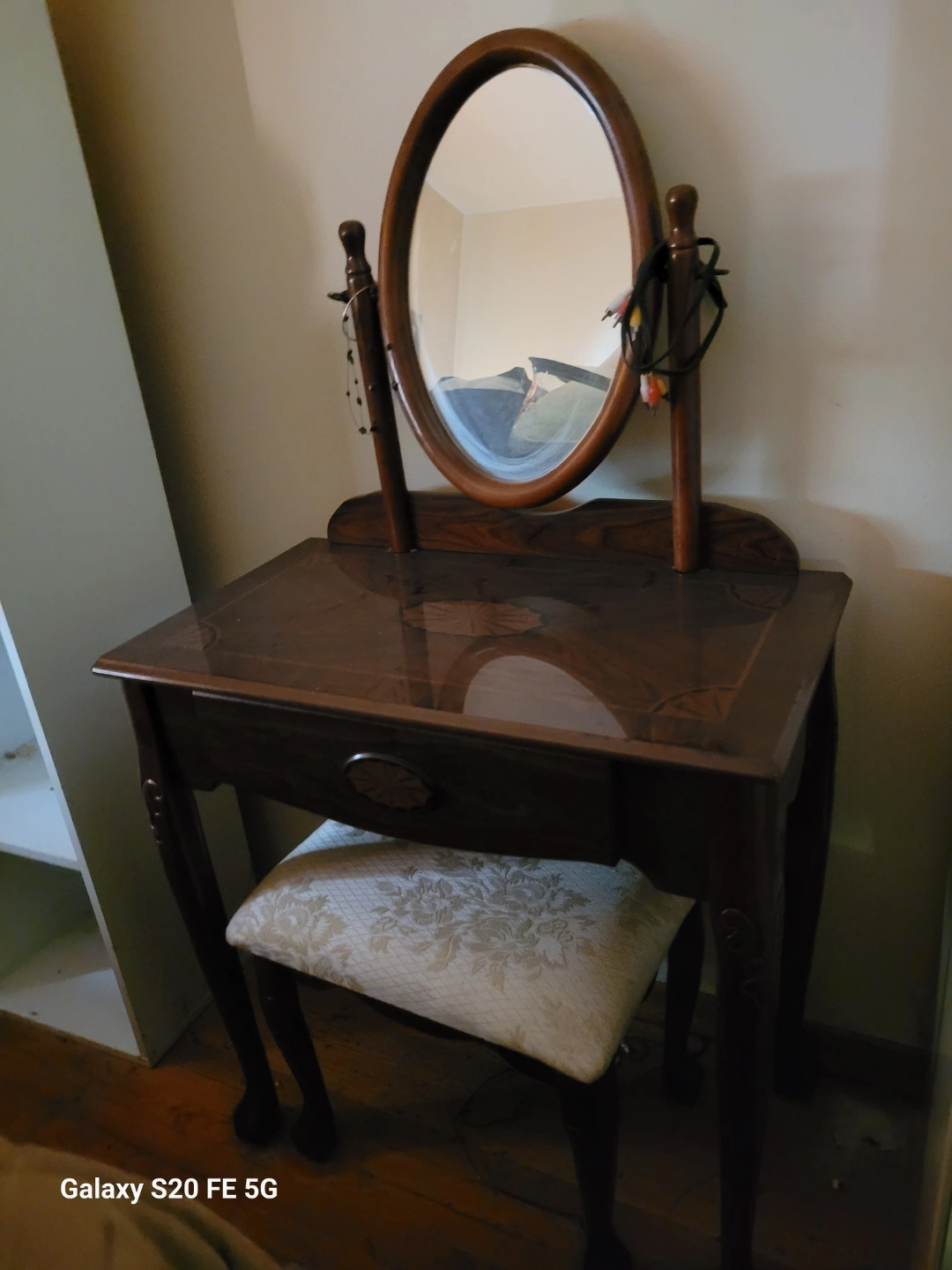 Dark wood vanity set, features an oval mirror and a cushioned stool. Includes a small drawer. Excellent for bedroom use.