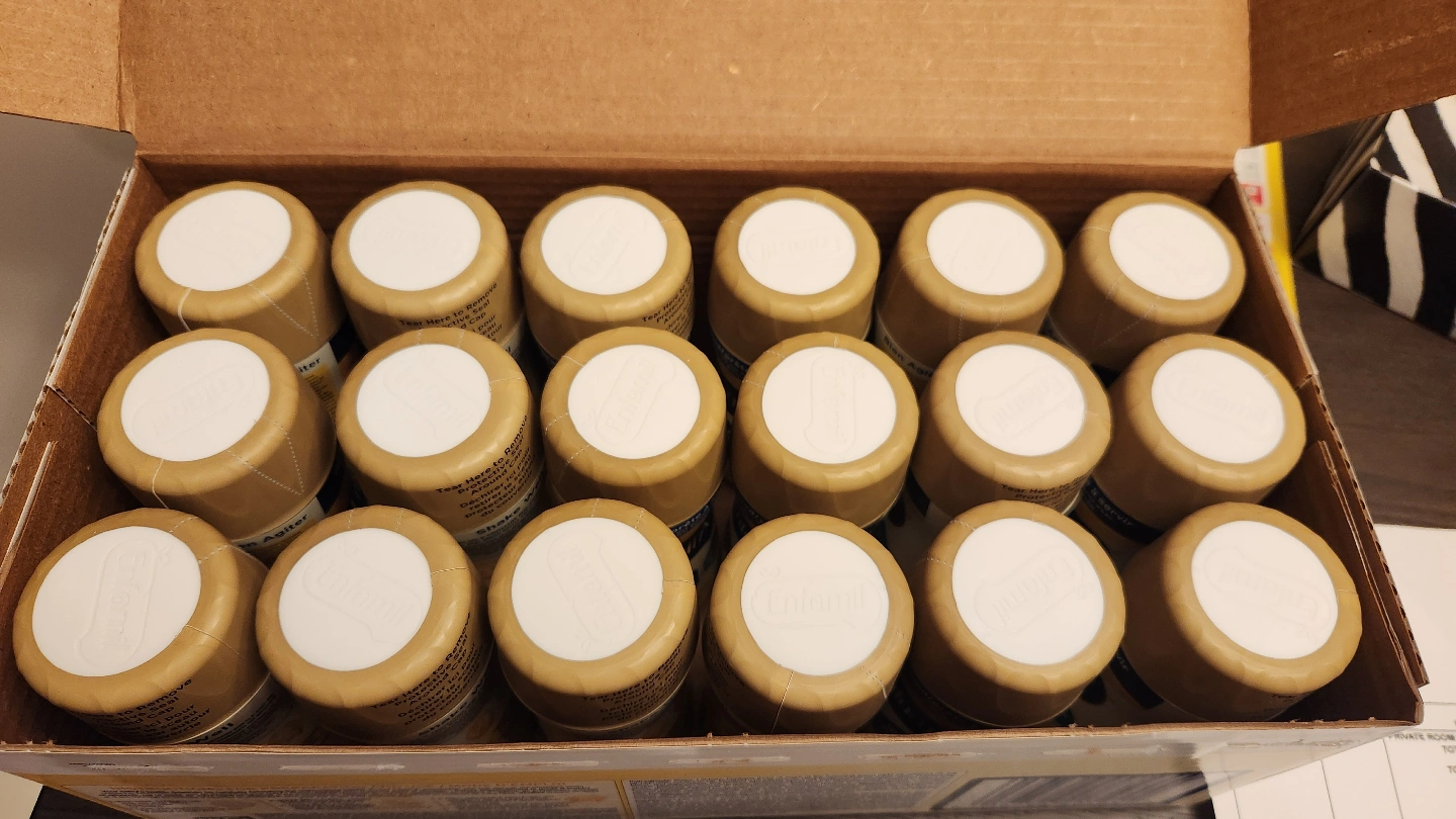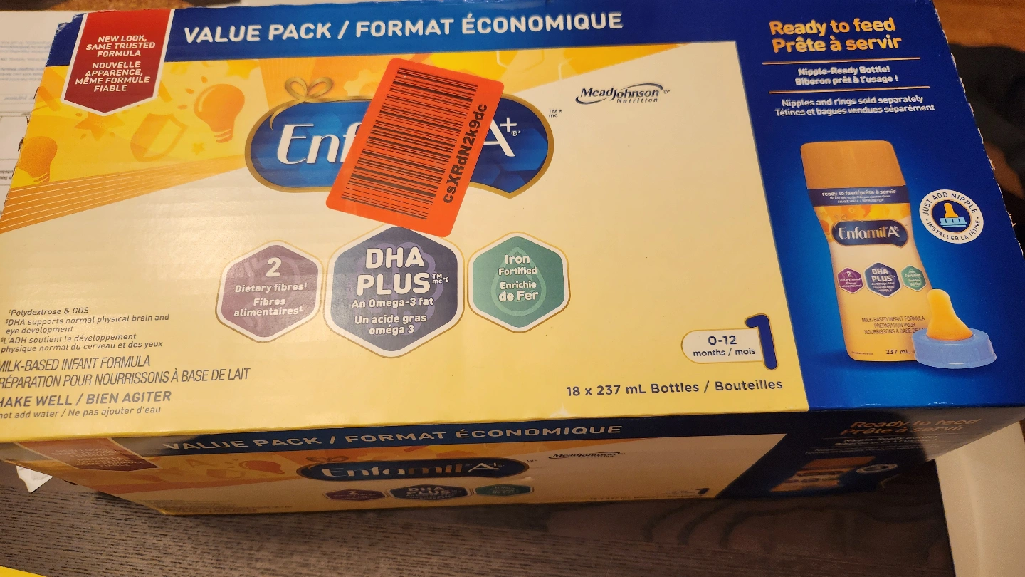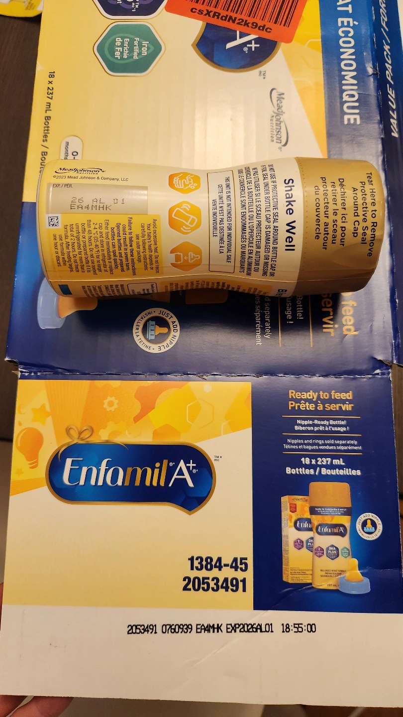 New look, value pack of Enfamil A+ ready-to-feed infant formula. 18 bottles, 237ml each. 0-12 months. DHA and iron fortified. Milk-based. Ready to serve. Bottles and rings sold separately.