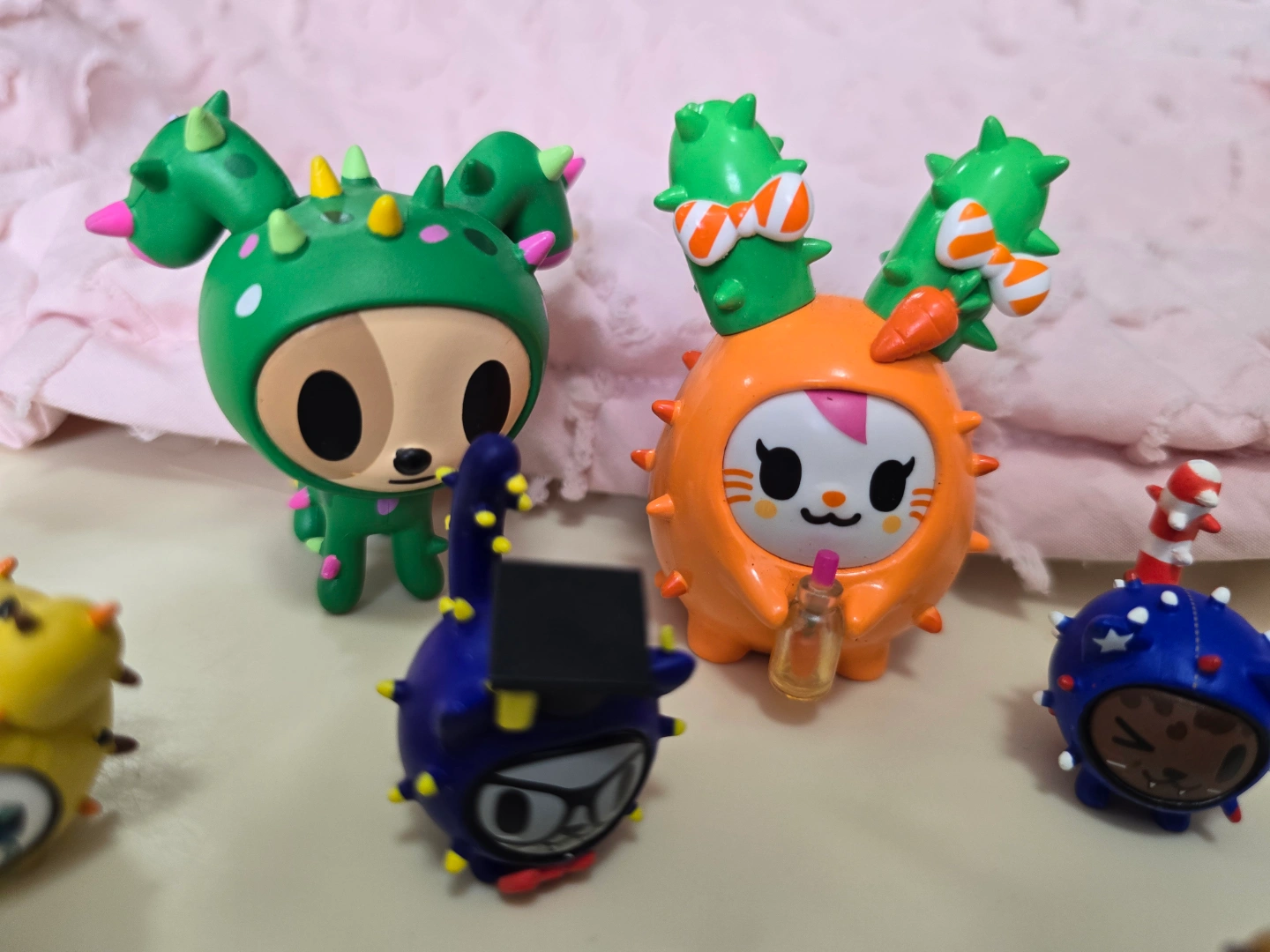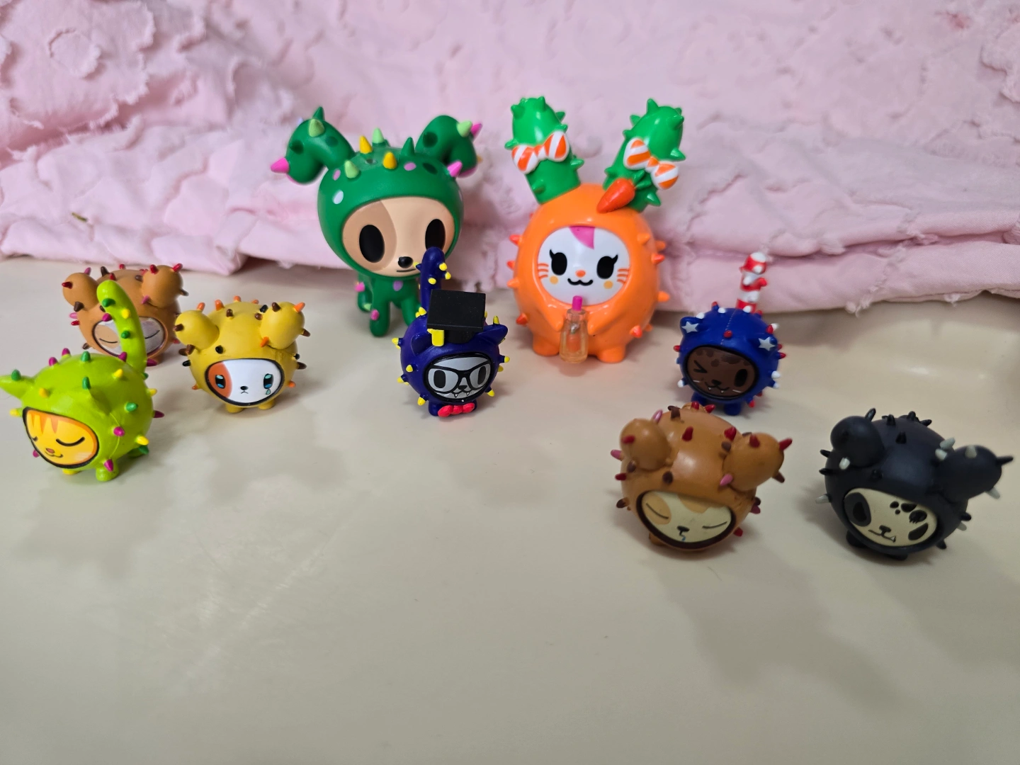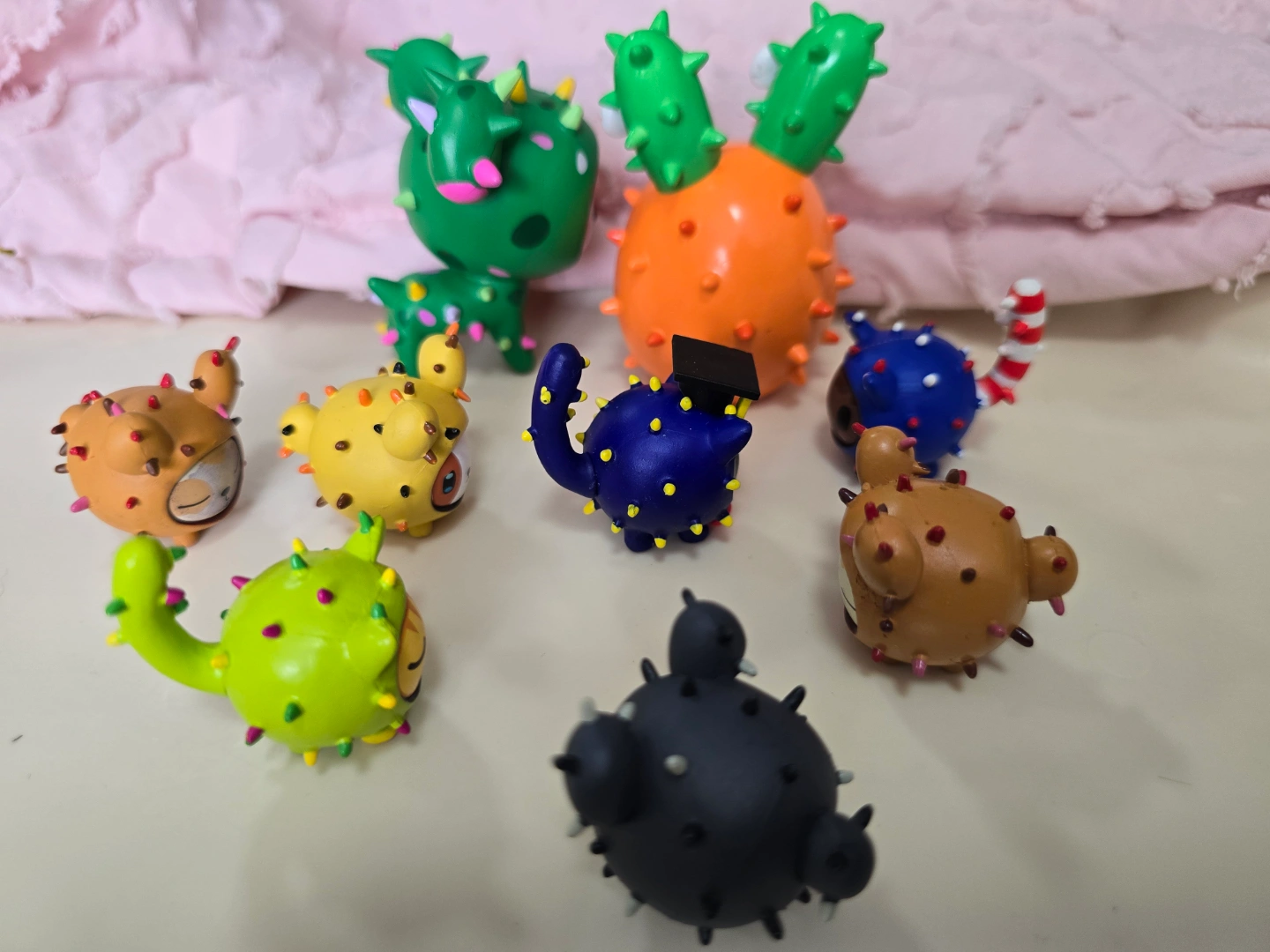collectible cactus figures. Variety of colors and designs. Small size, perfect for collectors or display.