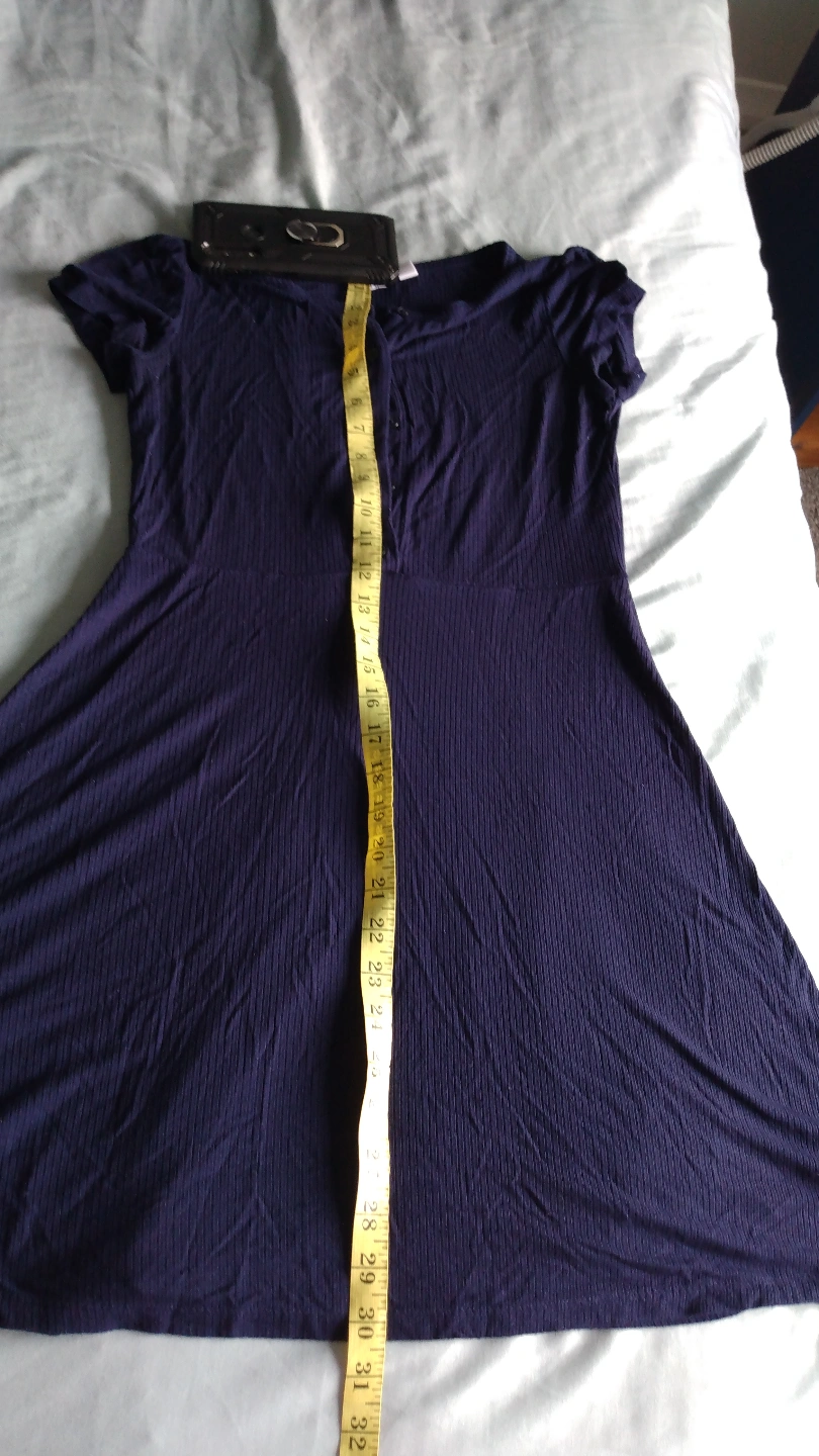 Navy blue ribbed knit dress. Size XL. Short sleeves. Button-down front. A-line silhouette. Casual style.