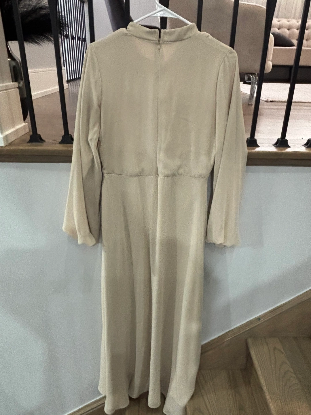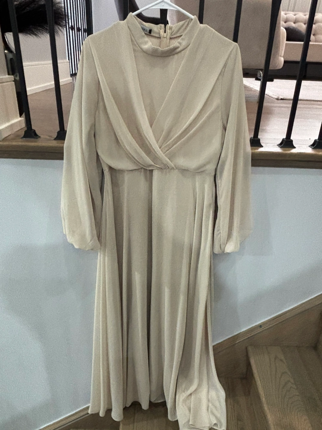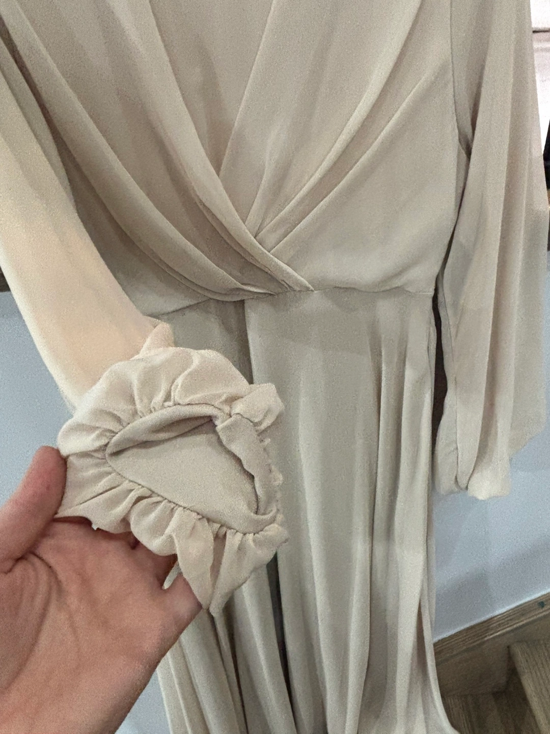 Elegant beige midi dress. Features long sleeves with ruffles at the cuffs and a wrap-style bodice. Hidden zipper closure at the back. Perfect for a special occasion or a day out.