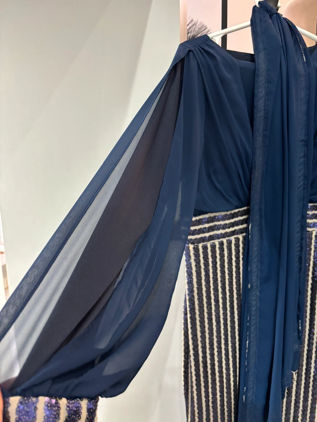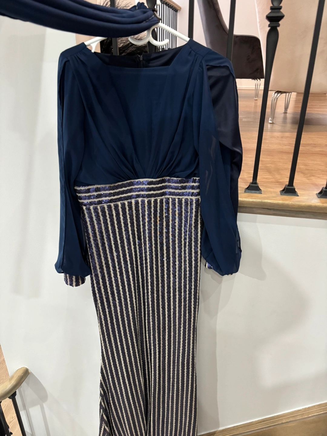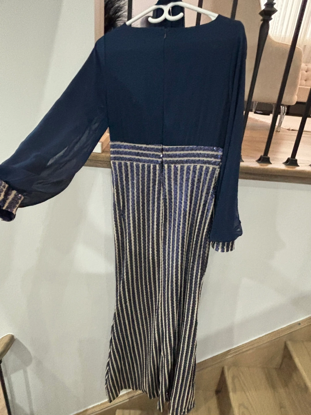 Stunning floor-length gown. Features a navy blue chiffon bodice and sequined striped skirt. Long sleeves with sheer fabric. Perfect for special occasions.