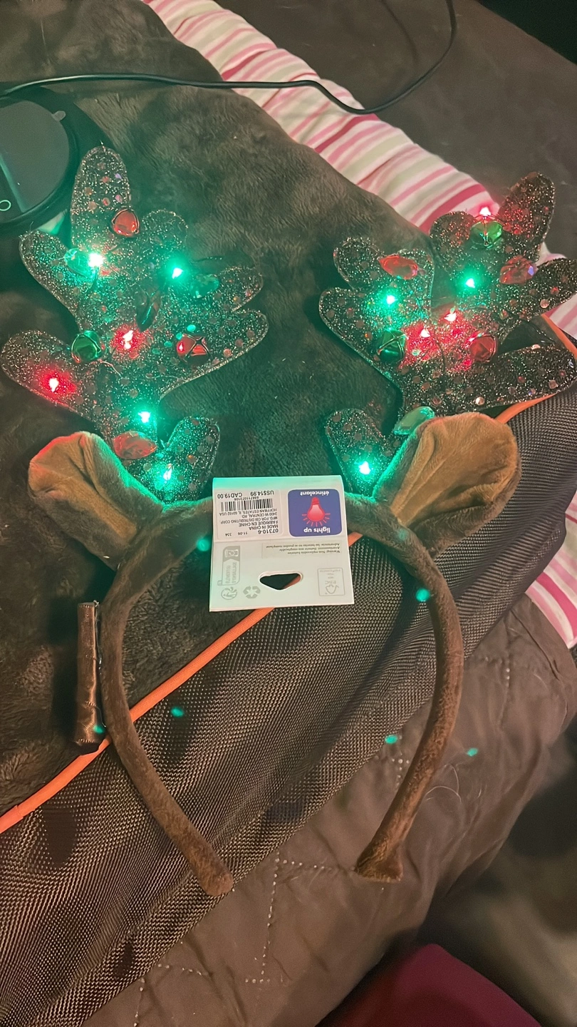 Christmas headband. Brown antlers with glitter and red and green lights. Battery operated (included) from Claire’s.