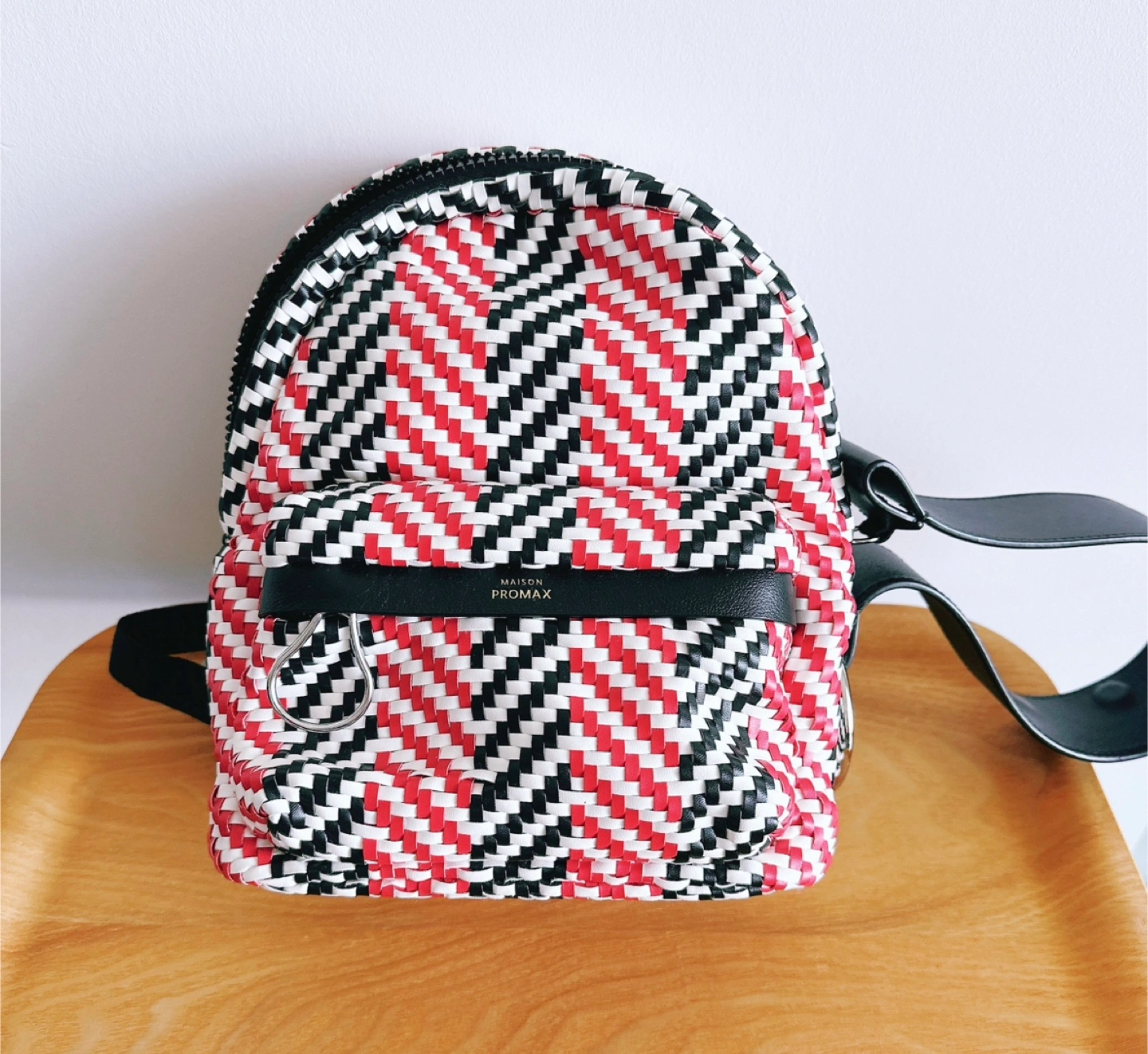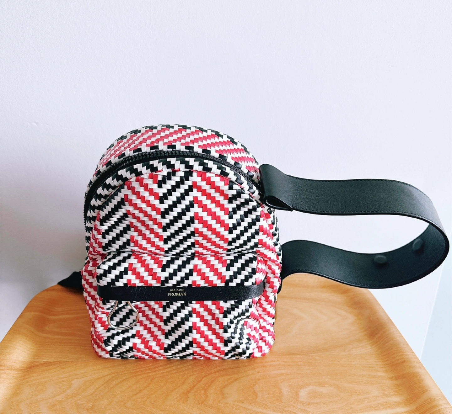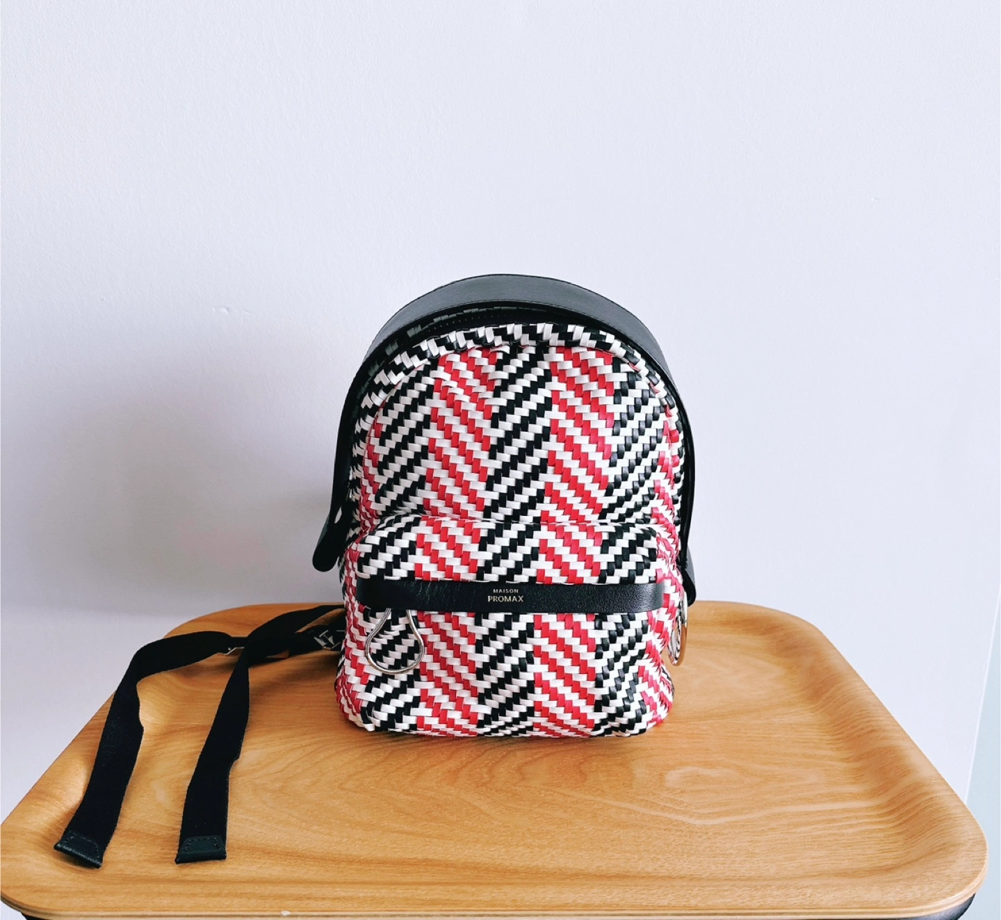The HENRI MINI WOVEN series showcases a beautifully crafted design, woven from multicolored artificial leather in striking geometric patterns. Classic long leather strips, highlighted with an "acne" hue and refined oil-edged detailing, add a charming and playful touch to the HENRI aesthetic.
