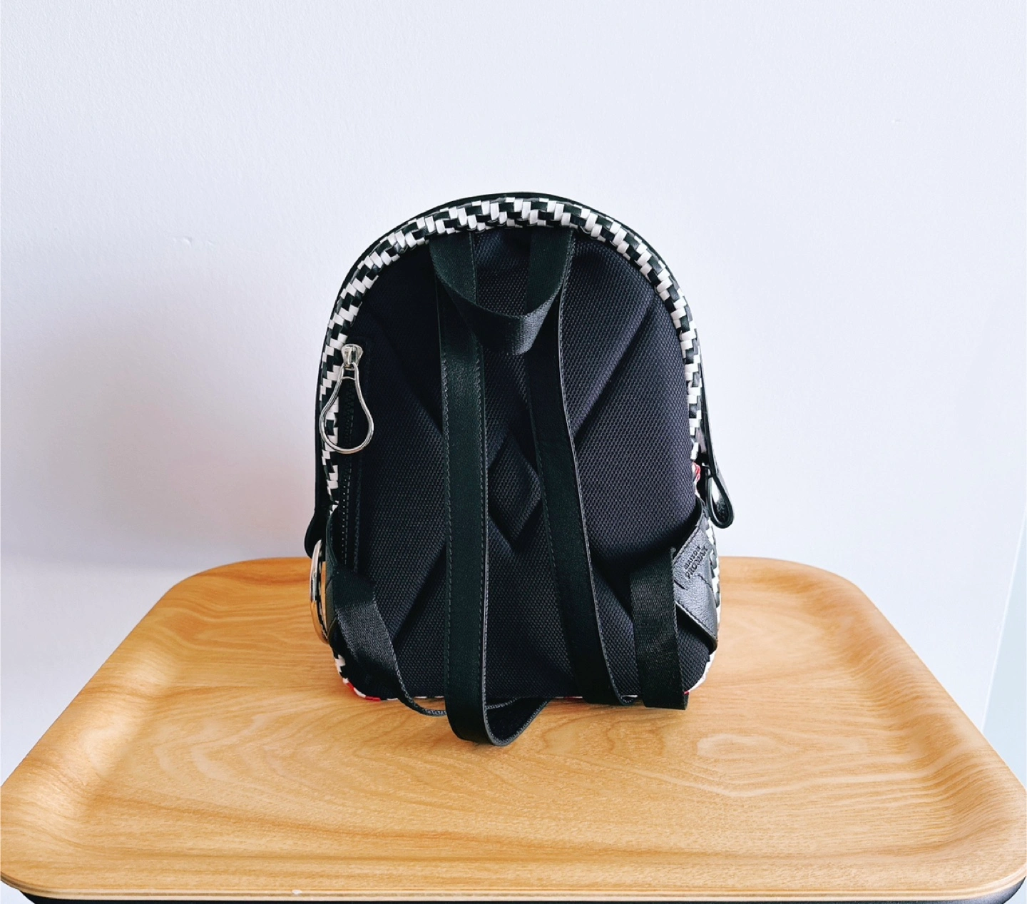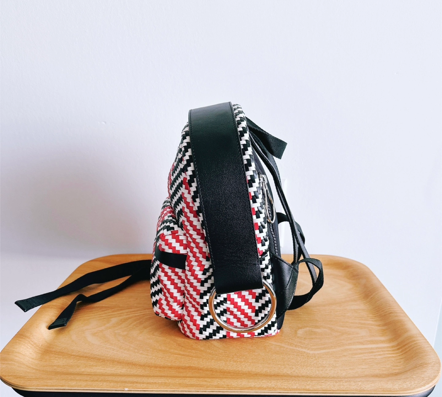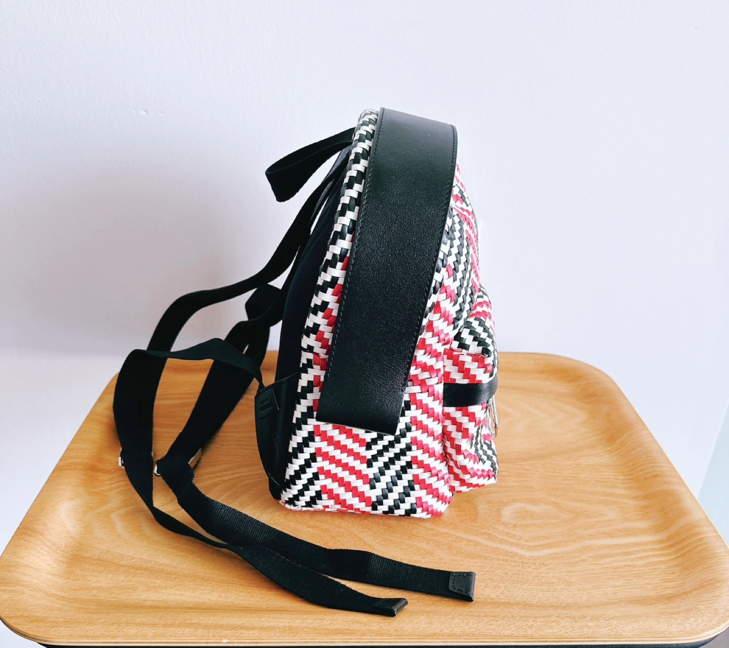 The HENRI MINI WOVEN series showcases a beautifully crafted design, woven from multicolored artificial leather in striking geometric patterns. Classic long leather strips, highlighted with an "acne" hue and refined oil-edged detailing, add a charming and playful touch to the HENRI aesthetic.