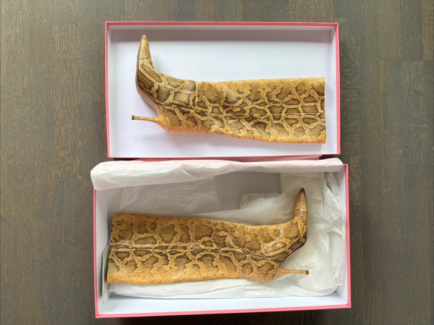 Snakeskin print. Pointed-toe. Stiletto heels. Come in original box.