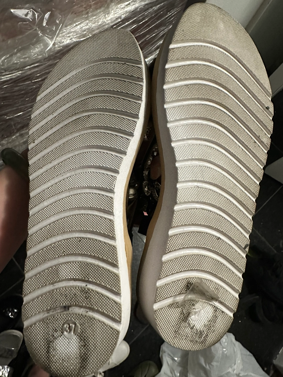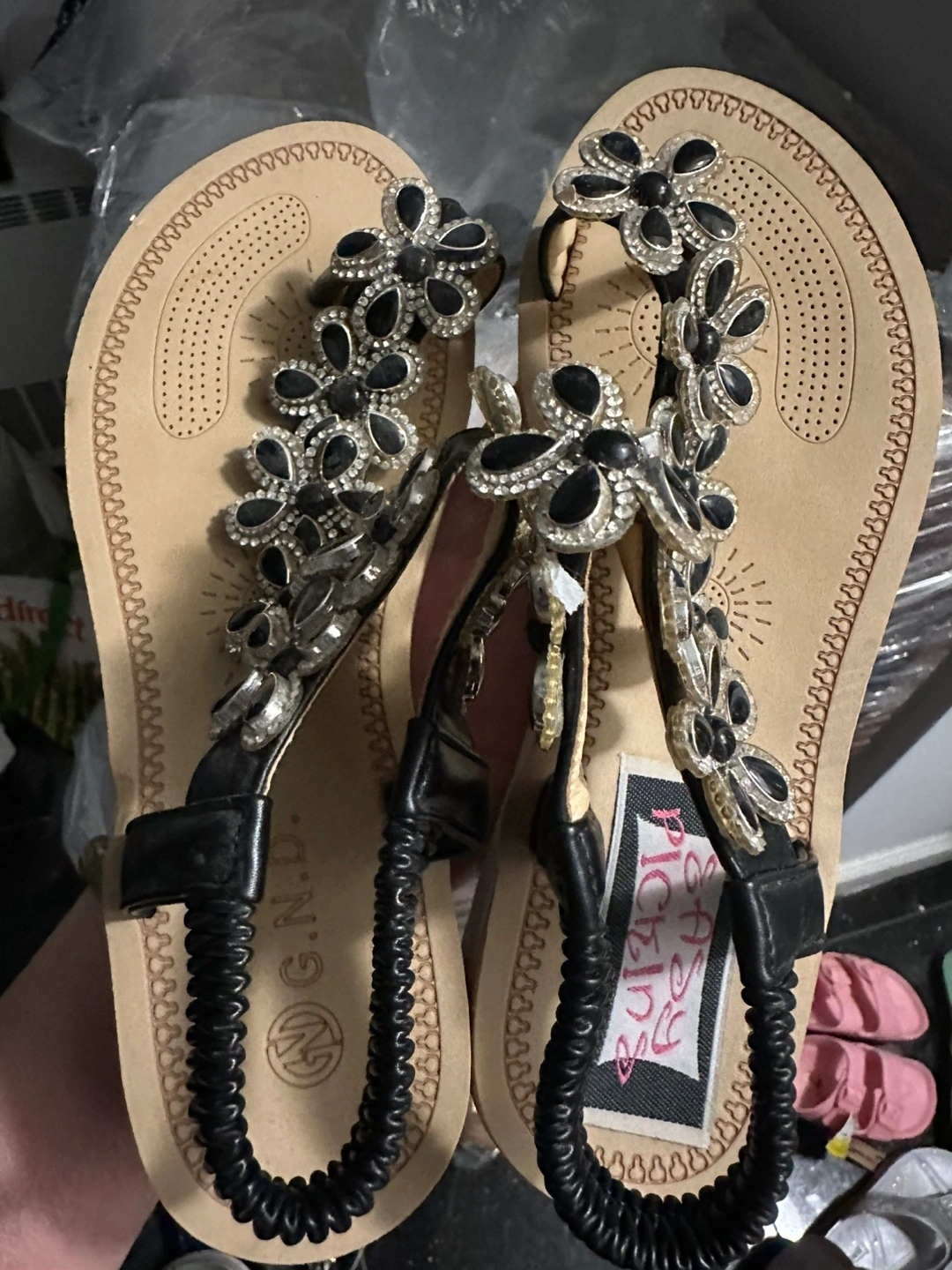 Black jeweled flower sandals. Size 8. Beige soles. Some wear. Clean up my closet.