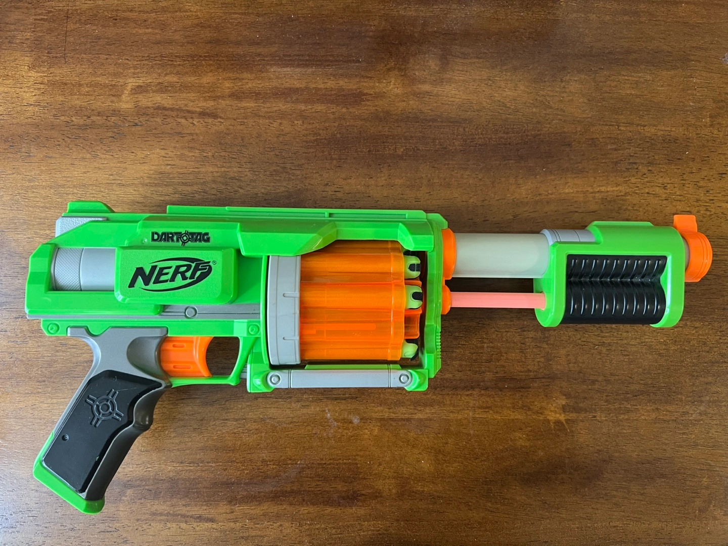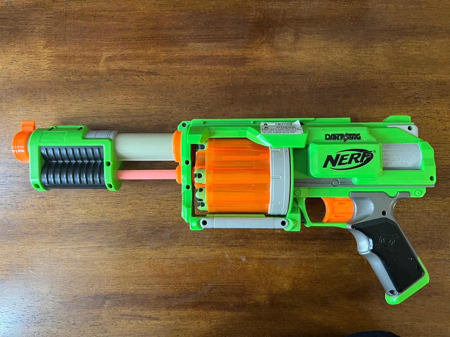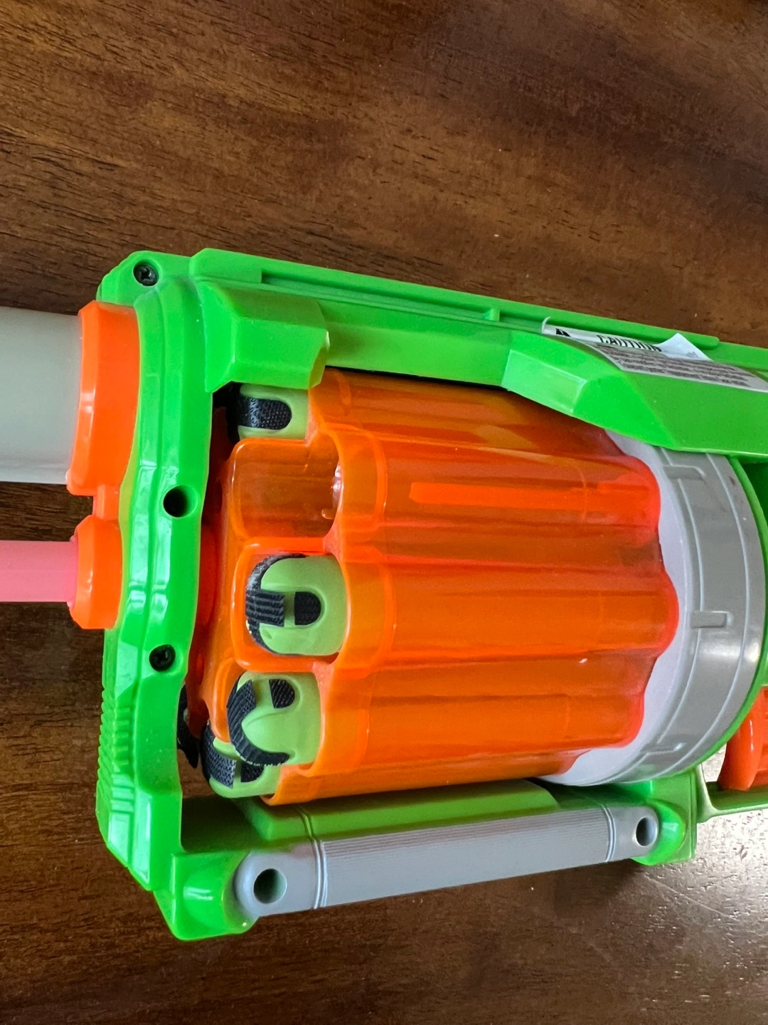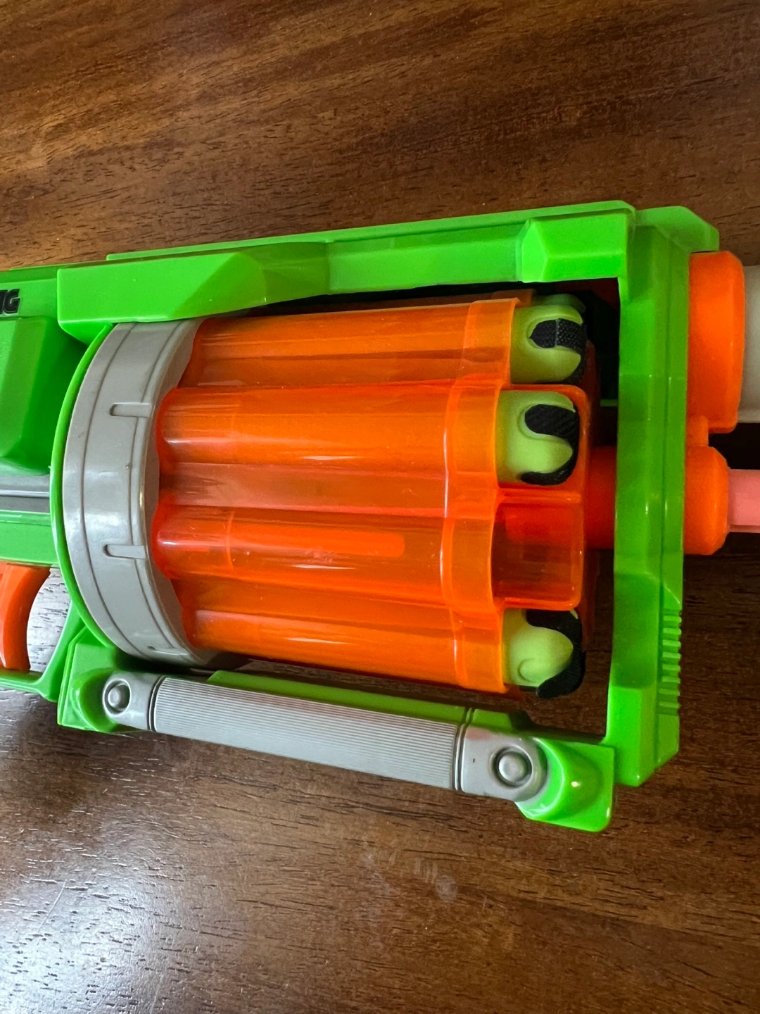 This Nerf blaster in green and orange features a rotating cylinder that holds darts. It is missing 2 bulletproof darts.