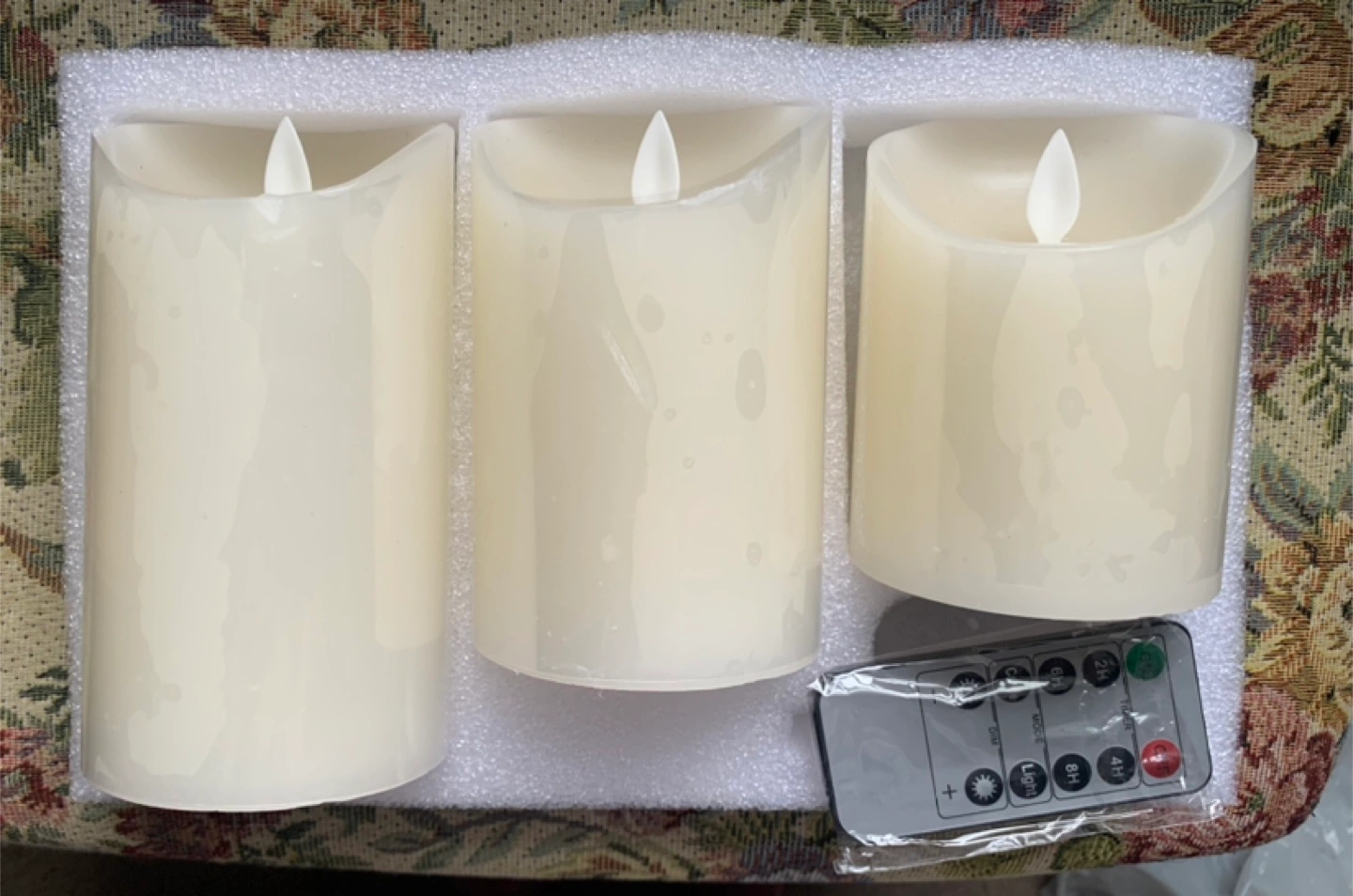 Real wax 3 ivory LED pillar candles flickering flame effect. Includes remote control. Perfect for ambiance.