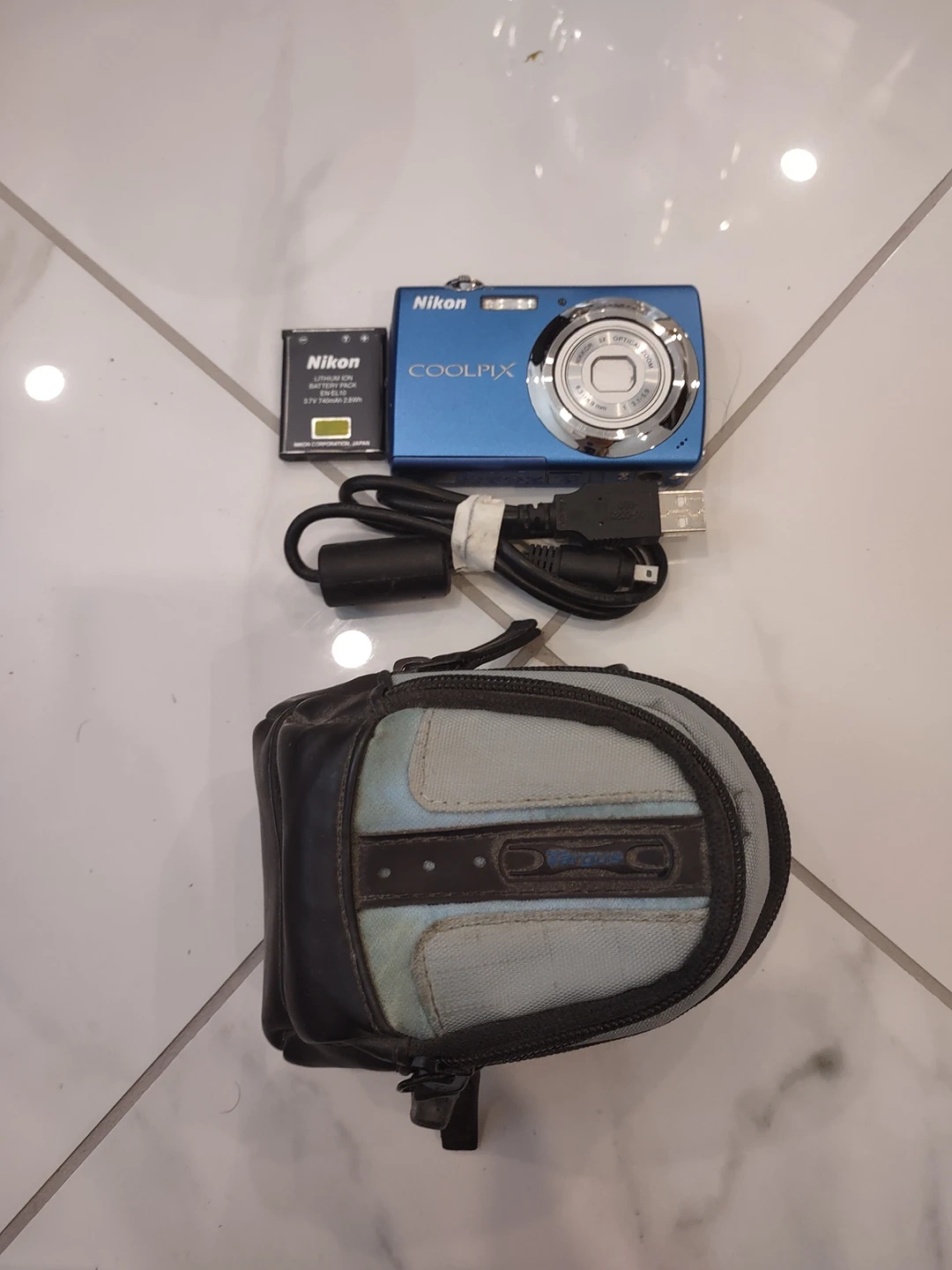 Nikon Coolpix digital camera. Comes with carrying case, A/V USB cable, rechargeable battery. Not included: needs MicroSD card to store and transfer images.
