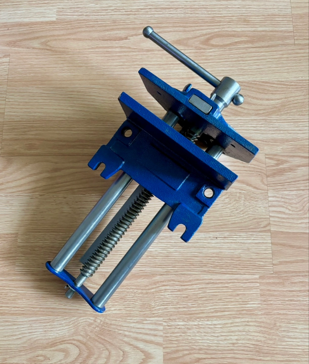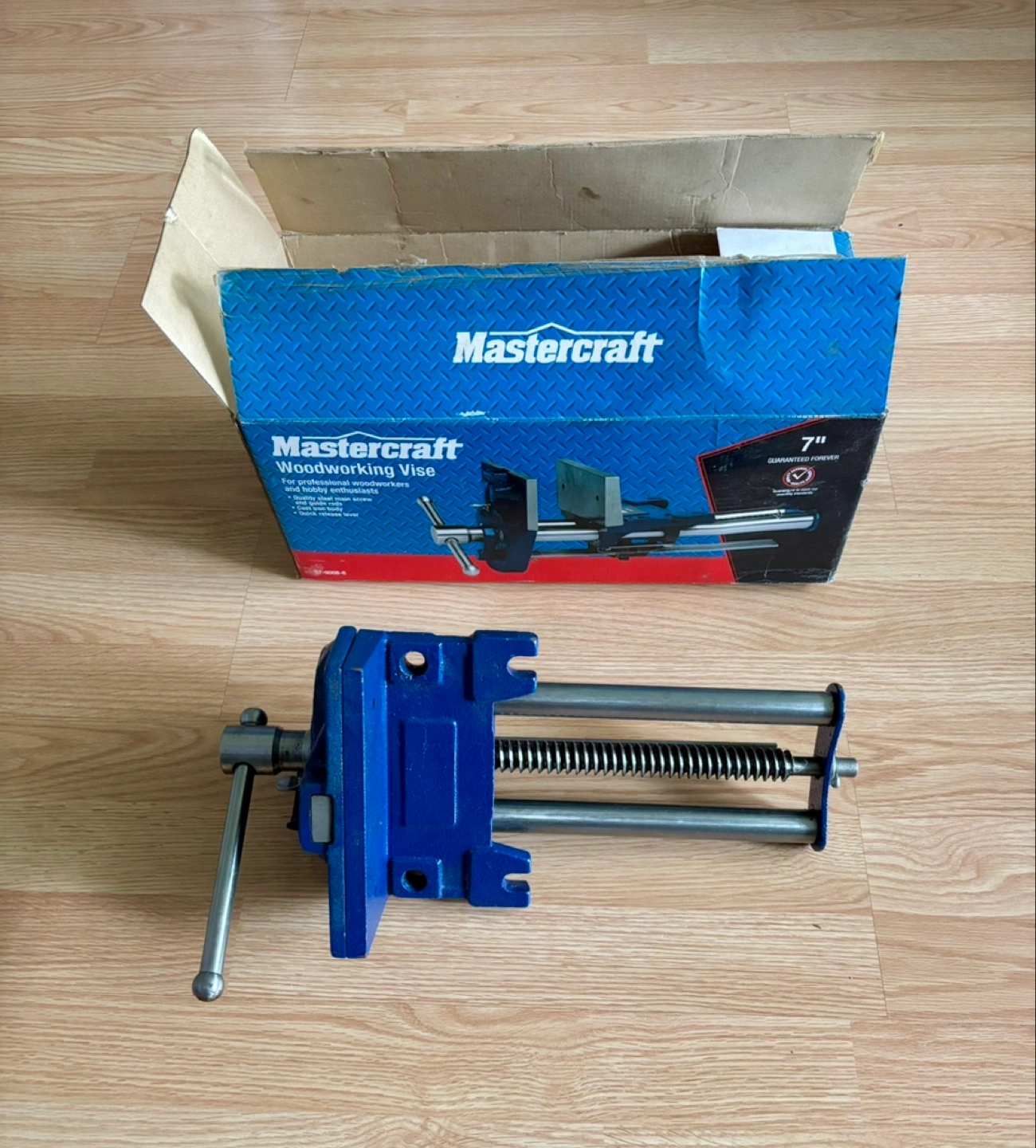 Woodworking vise in box. Cast iron body. Quality steel main screw and guide rods. Quick release lever. Seven inch.