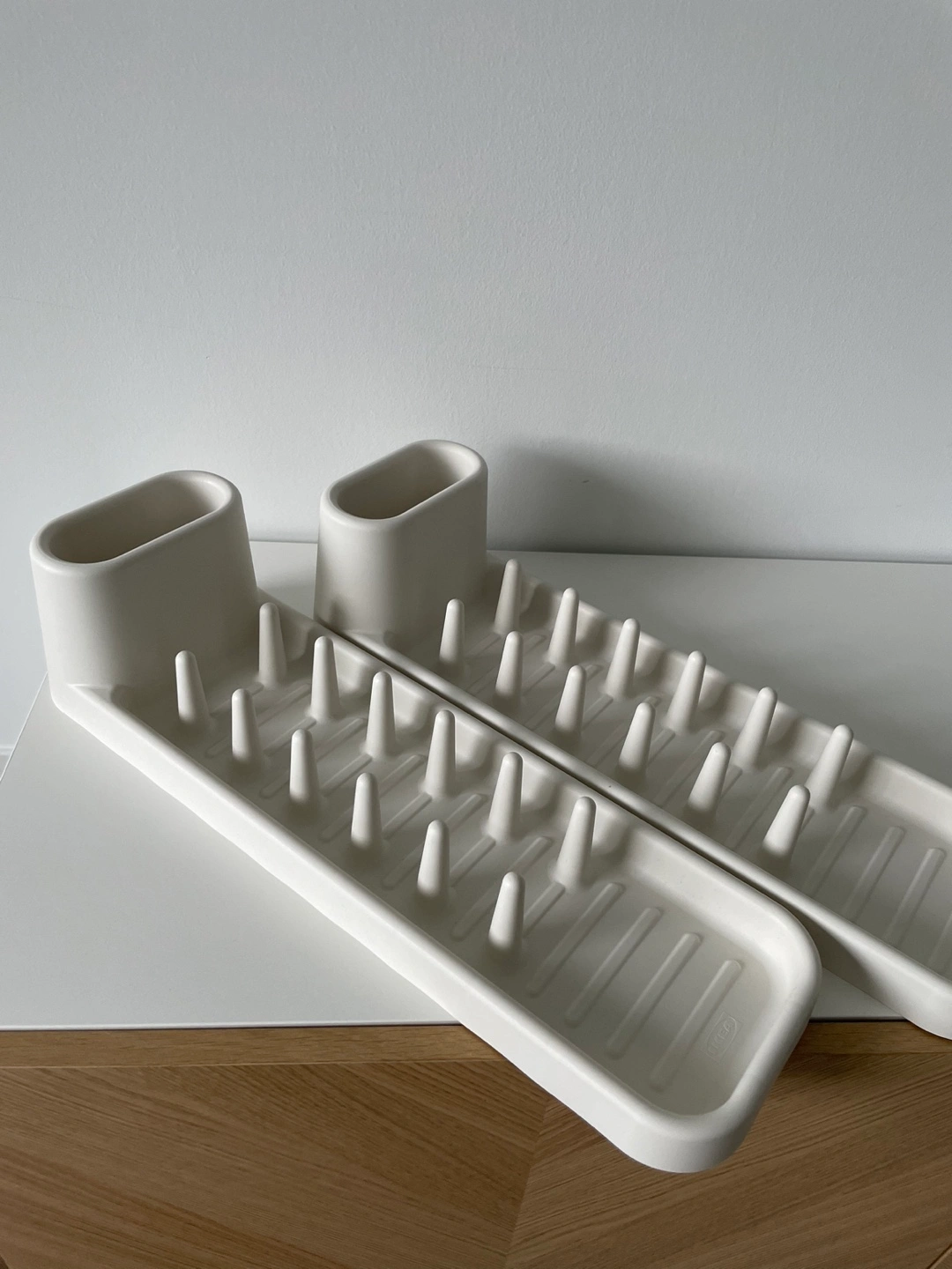 Two dish drying racks. Each features small pegs for drying dishes and a utensil holder. Minimalist design.