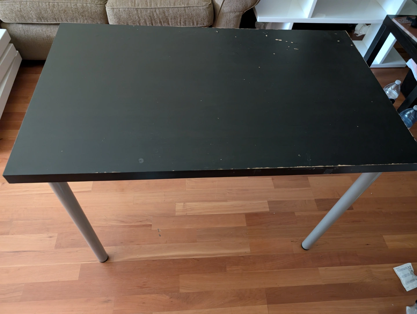 Small ikea black desk. Silver metal legs. Some minor wear and tear.