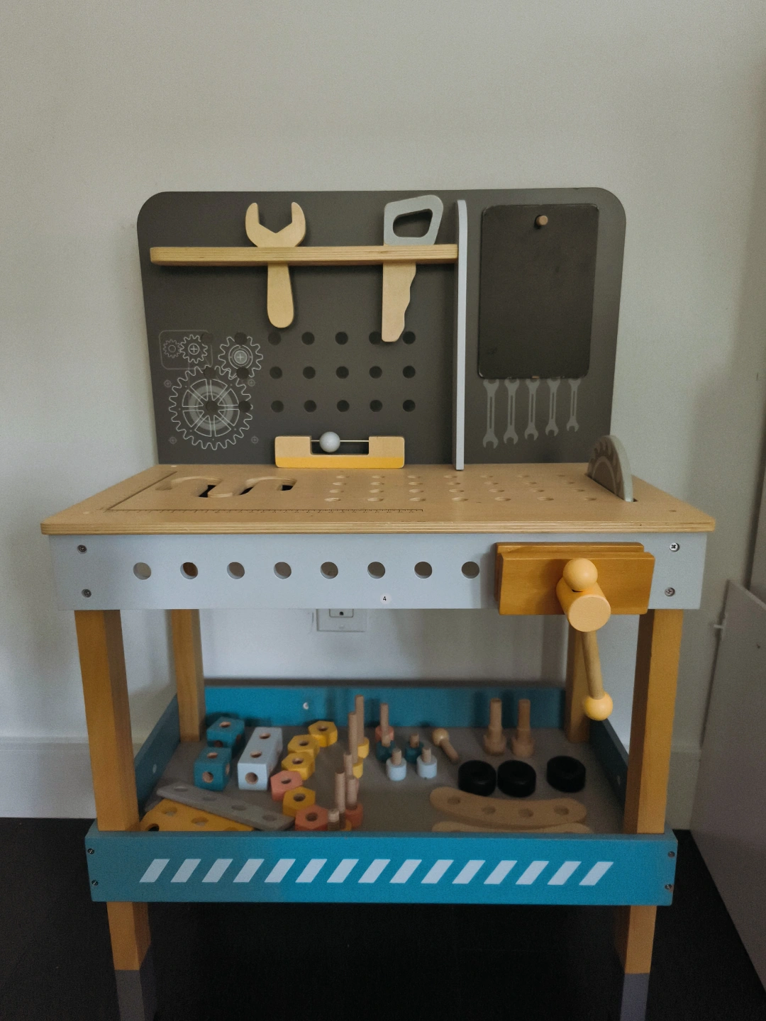 Features a pegboard, chalkboard, and various wooden tools and building pieces. Great for imaginative play.