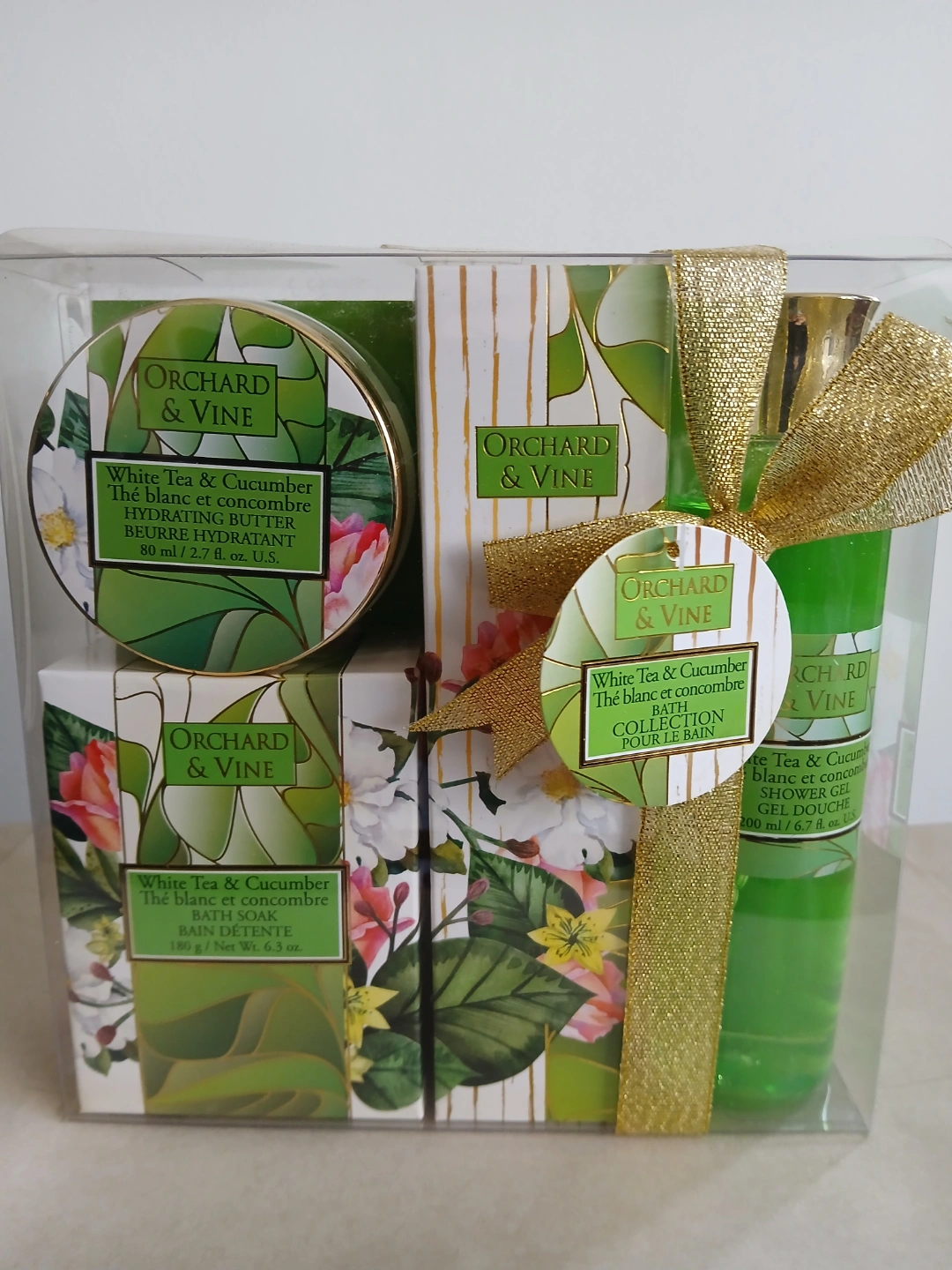 New Orchard & Vine bath collection gift set. Includes shower gel, bath soak, and hydrating butter. White tea and cucumber scent. Perfect gift!