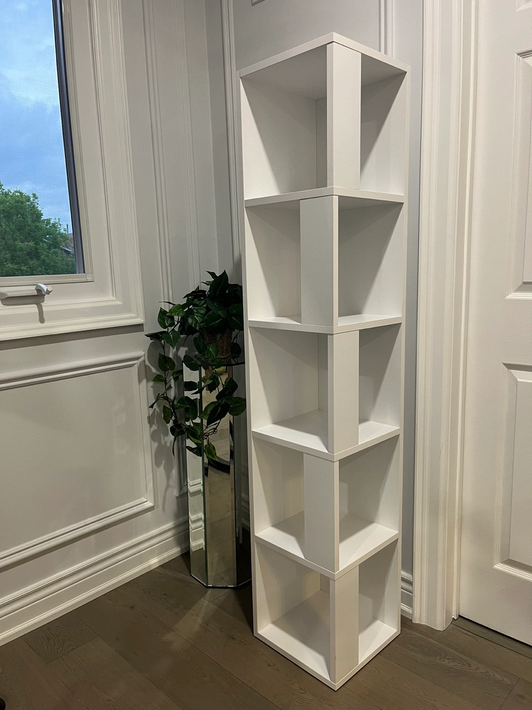 Decorative tall white cube shelving unit. Five shelves, smooth finish. Perfect for books, cosmetics , perfumes and decor. Pristine condition. Assembled.