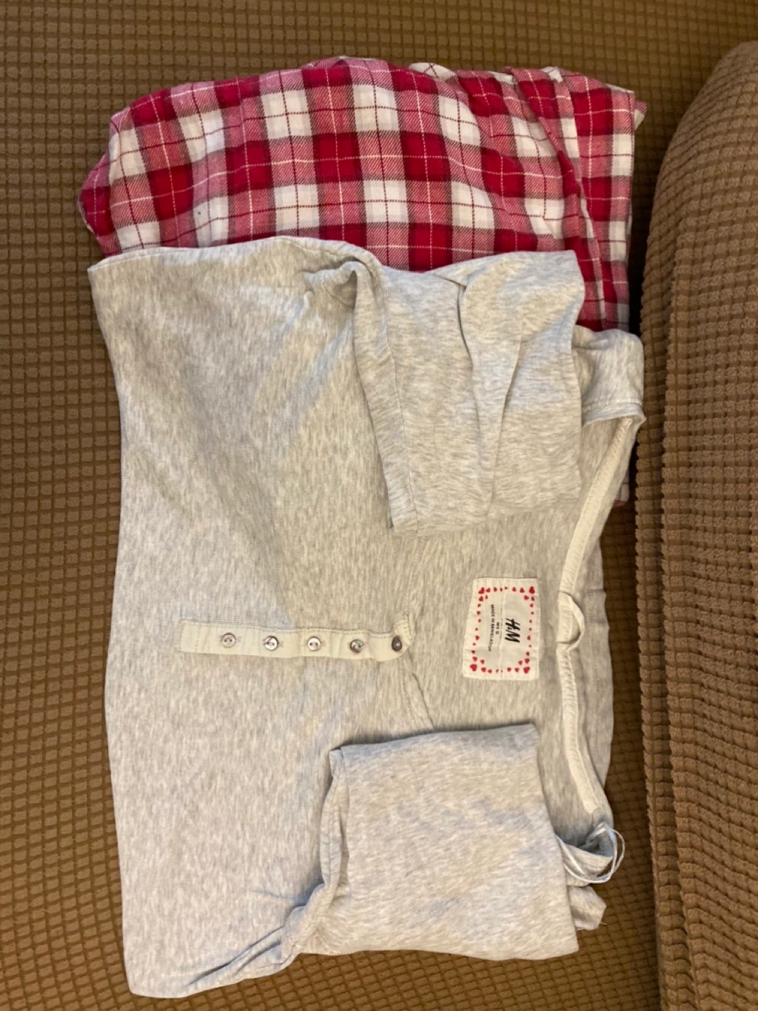 Grey henley top with button placket. Red and white plaid pajama bottoms. Cozy loungewear set. Excellent for sleeping or lounging.