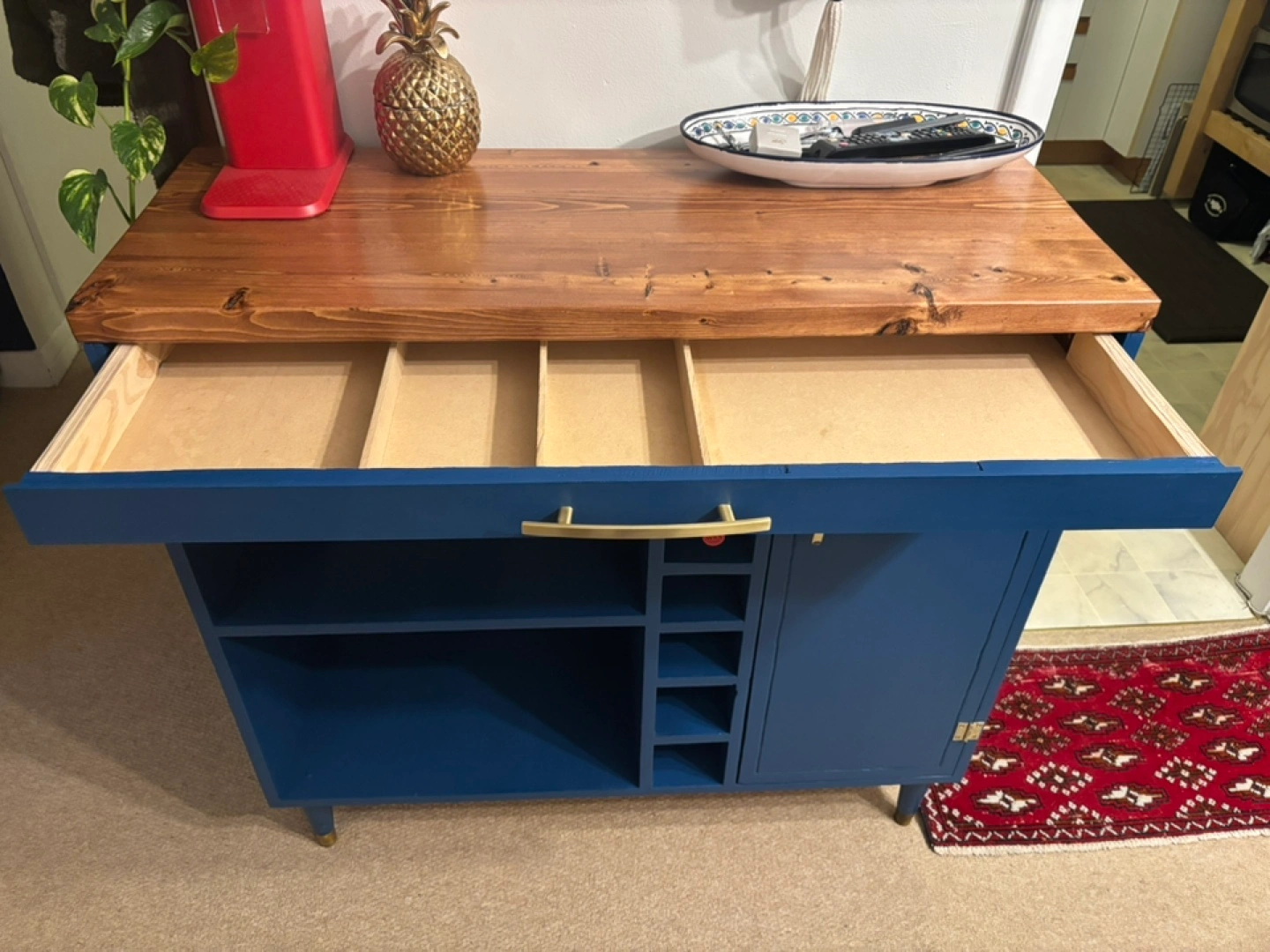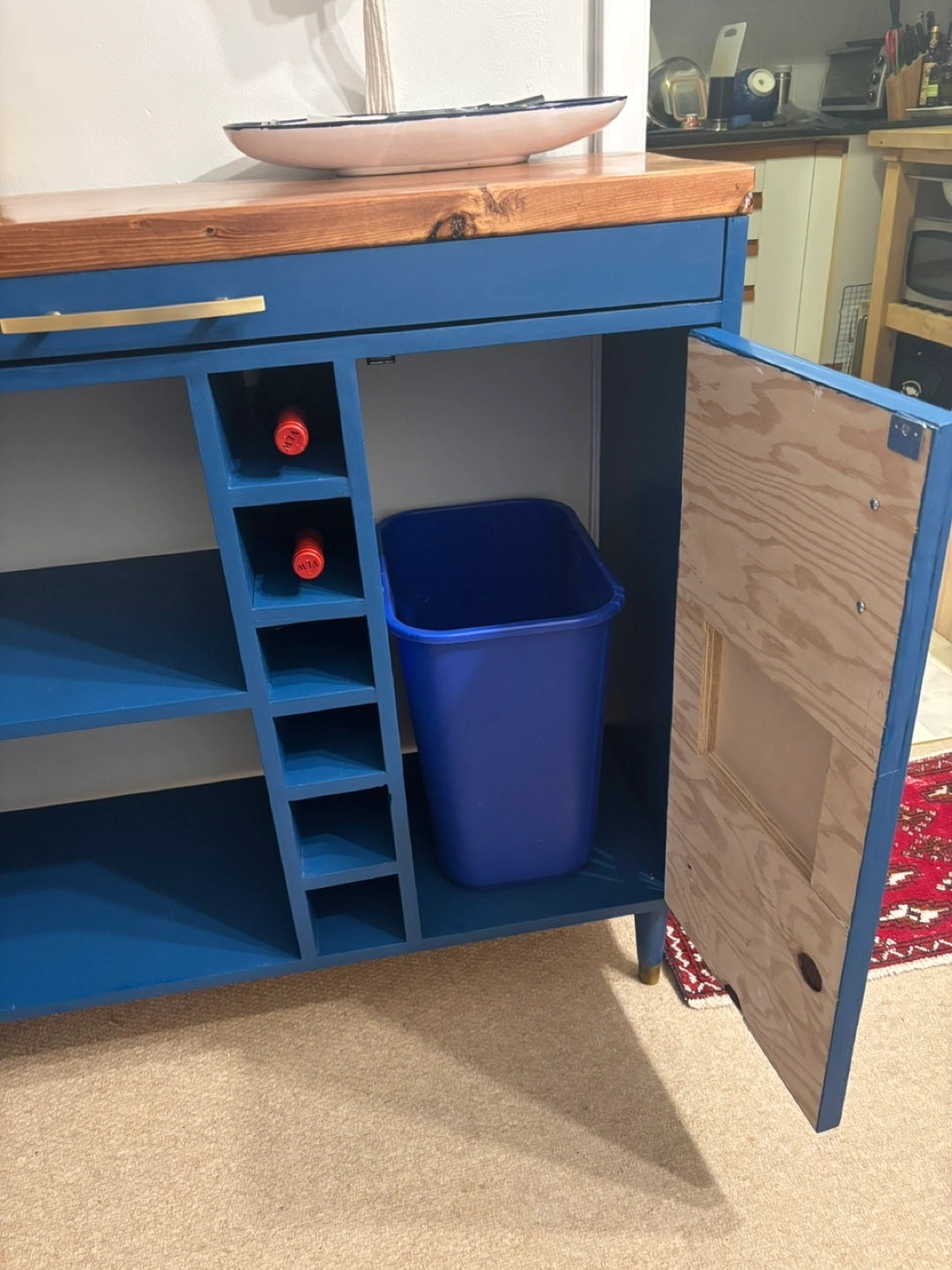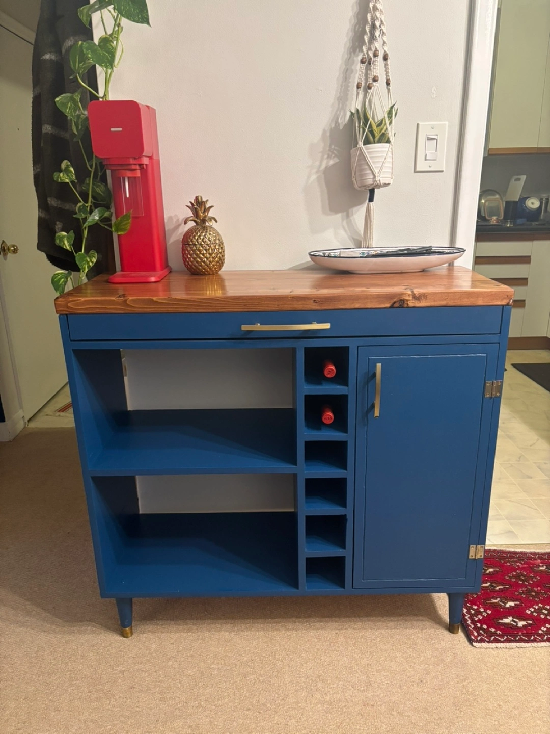 Unique, Hand-Made bar cart of microwave stand. Royal/navy blue finish, solid wood top, gold finishes. I made this to house a microwave in the middle shelf and a hidden recycling bin behind the door (bin included if you want it) Theres slots for a few bottles of wine and a shallow drawer for utensils and cutting boards. The detail on the door is a big wiggly (pictured) as it was hand carved to be “rustic”