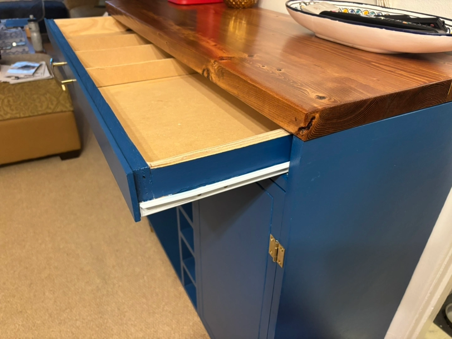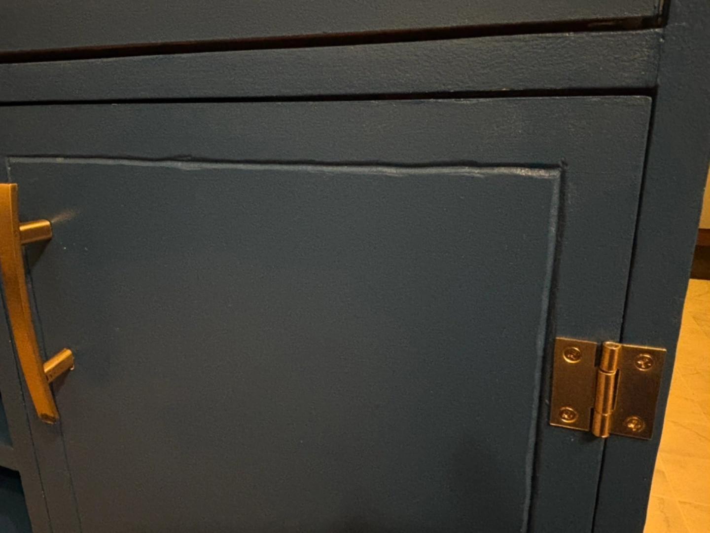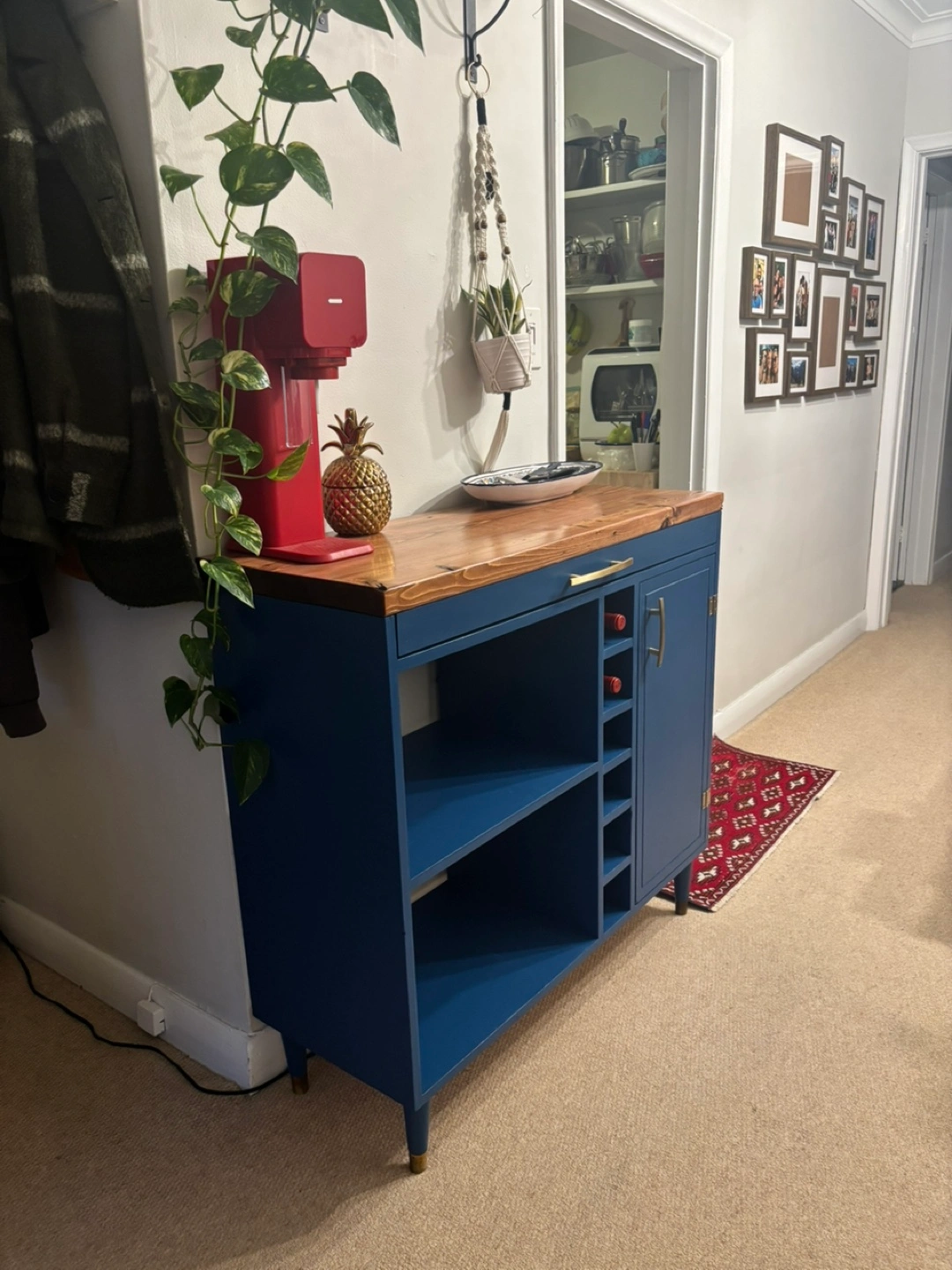 Unique, Hand-Made bar cart of microwave stand. Royal/navy blue finish, solid wood top, gold finishes. I made this to house a microwave in the middle shelf and a hidden recycling bin behind the door (bin included if you want it) Theres slots for a few bottles of wine and a shallow drawer for utensils and cutting boards. The detail on the door is a big wiggly (pictured) as it was hand carved to be “rustic”