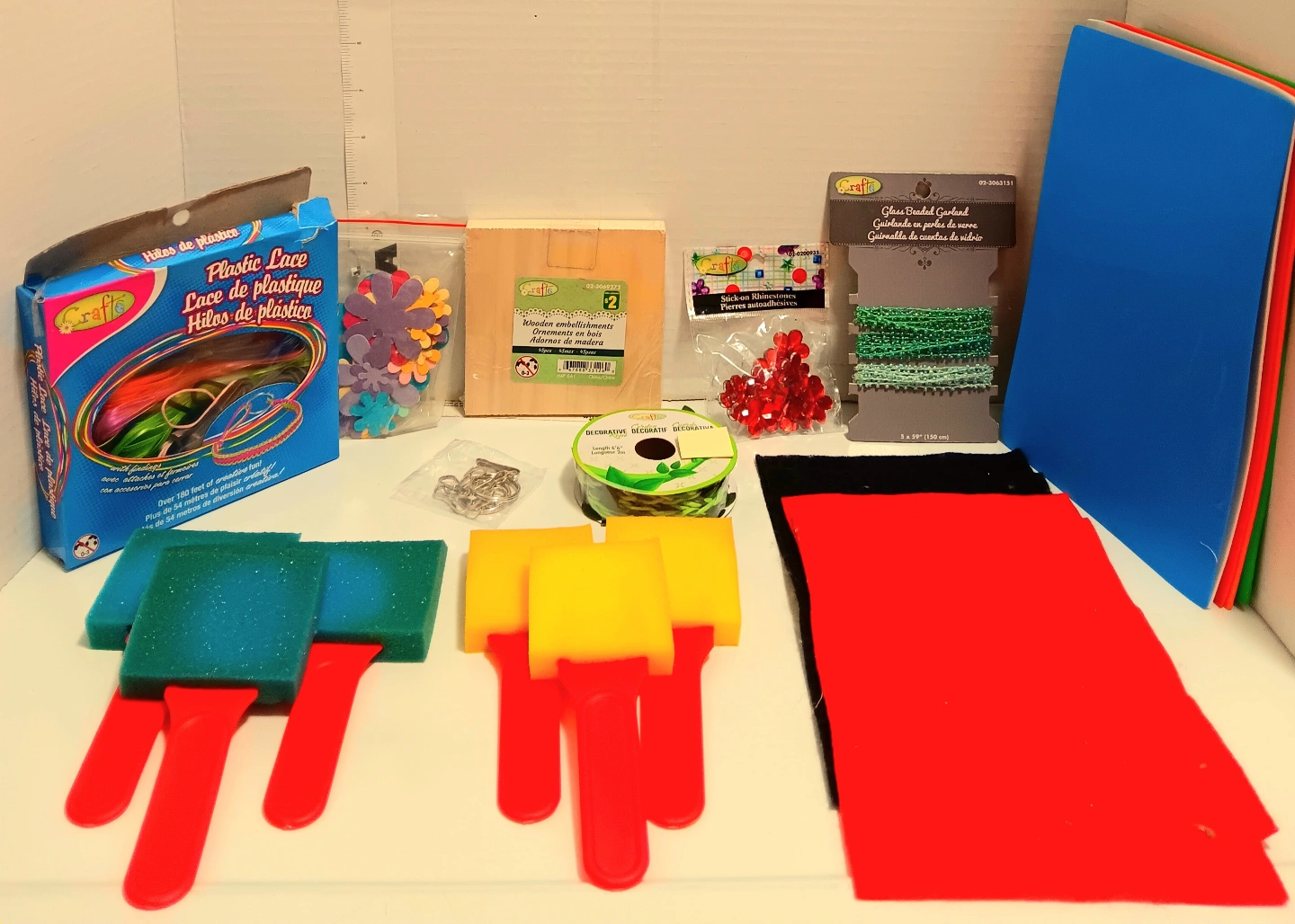 Assorted crafting supplies. Includes wooden flower shapes, colourful plastic lacing, various beads, felt sheets, and foam applicators. Great for kids or adults. Perfect for jewellery making, scrapbooking or other craft projects.