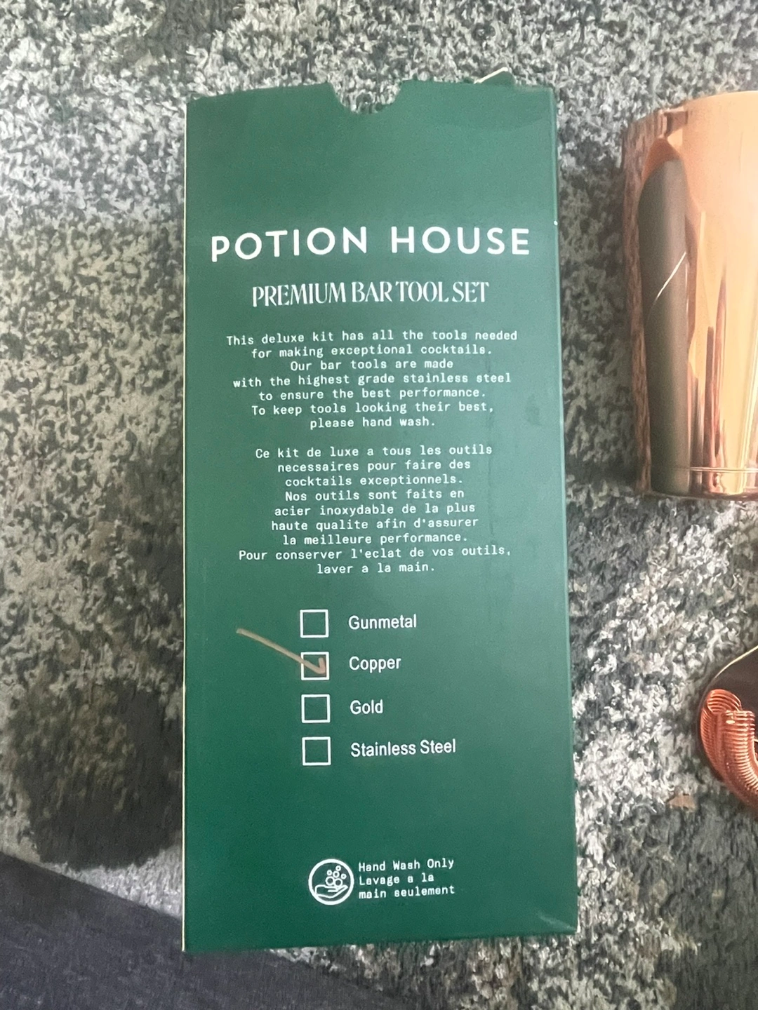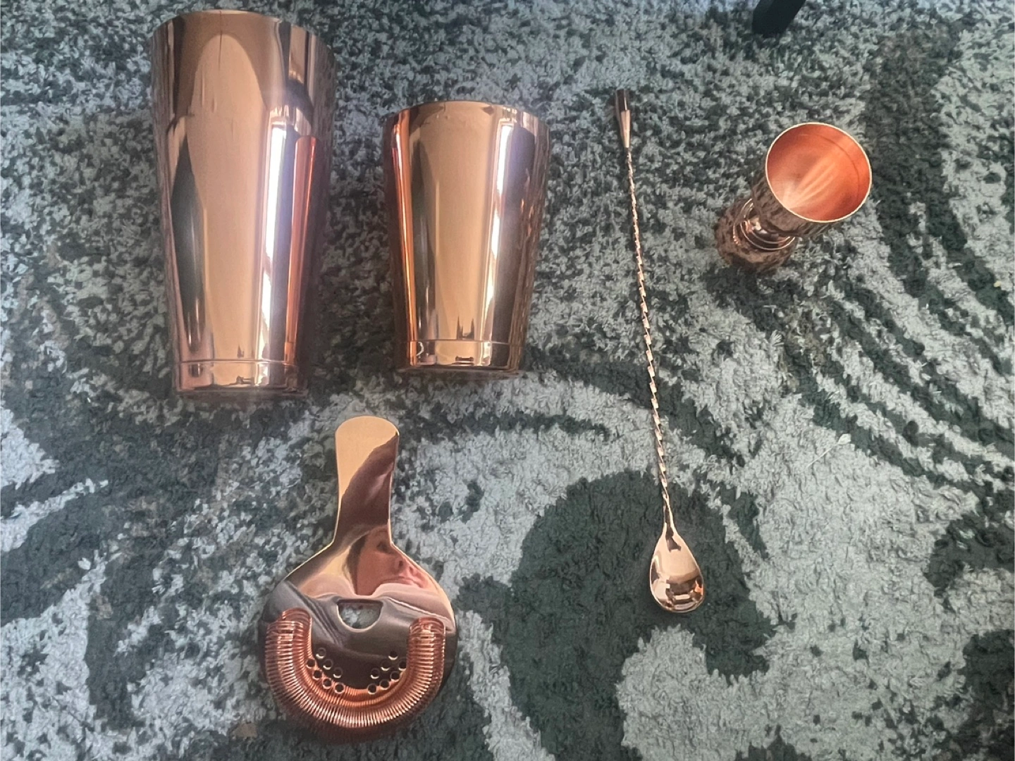 Rose gold cocktail shaker set. Includes cocktail shaker, jigger, Hawthorne strainer, and bar spoon. Premium quality. Brand new, in box. Perfect for home bartending.