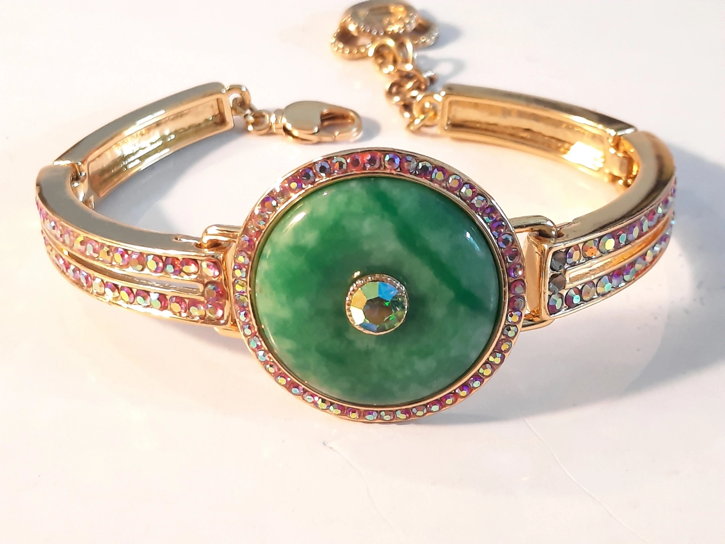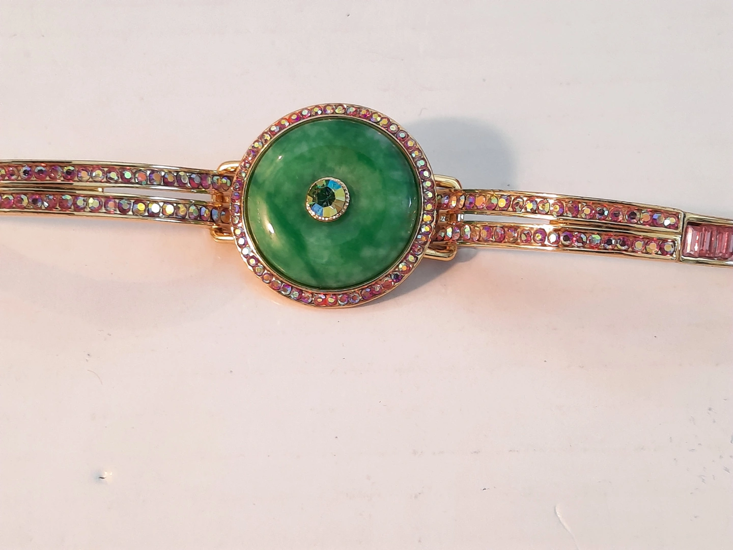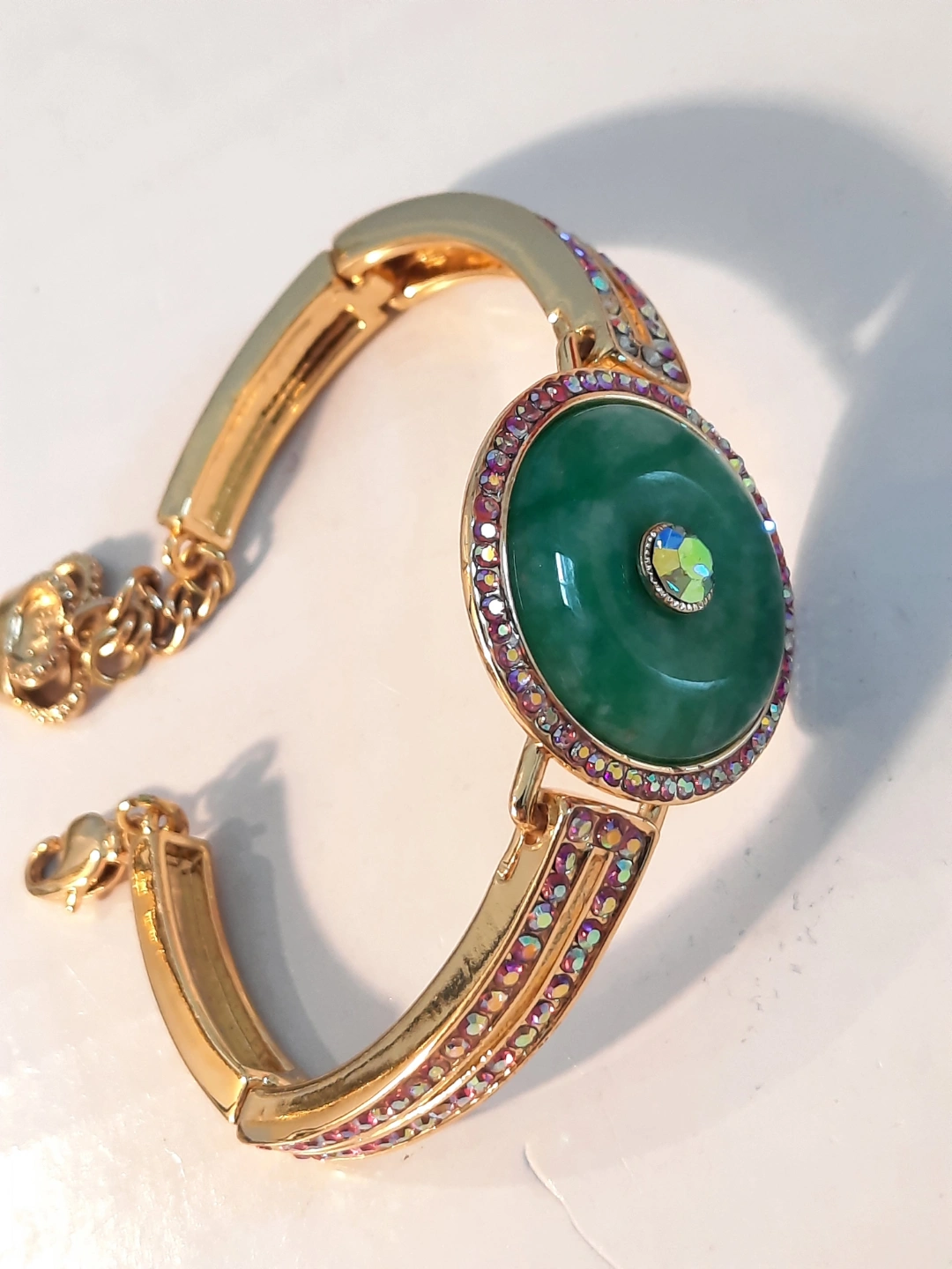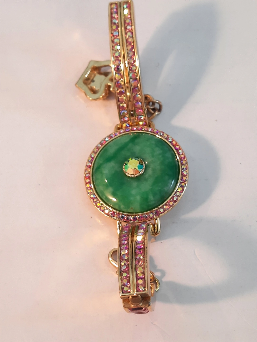 Beautiful gold-toned bracelet. Features a large green cabochon stone green jade surrounded by iridescent crystals. Gold-toned metal band adorned with pink and clear crystals. Adjustable clasp. Unique statement piece.