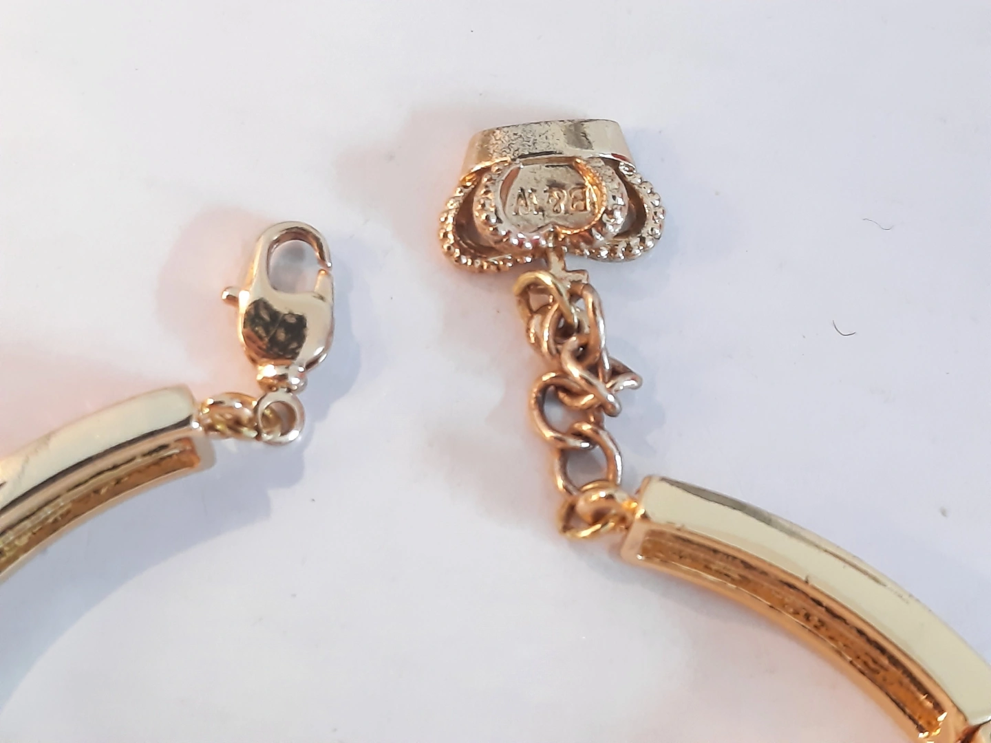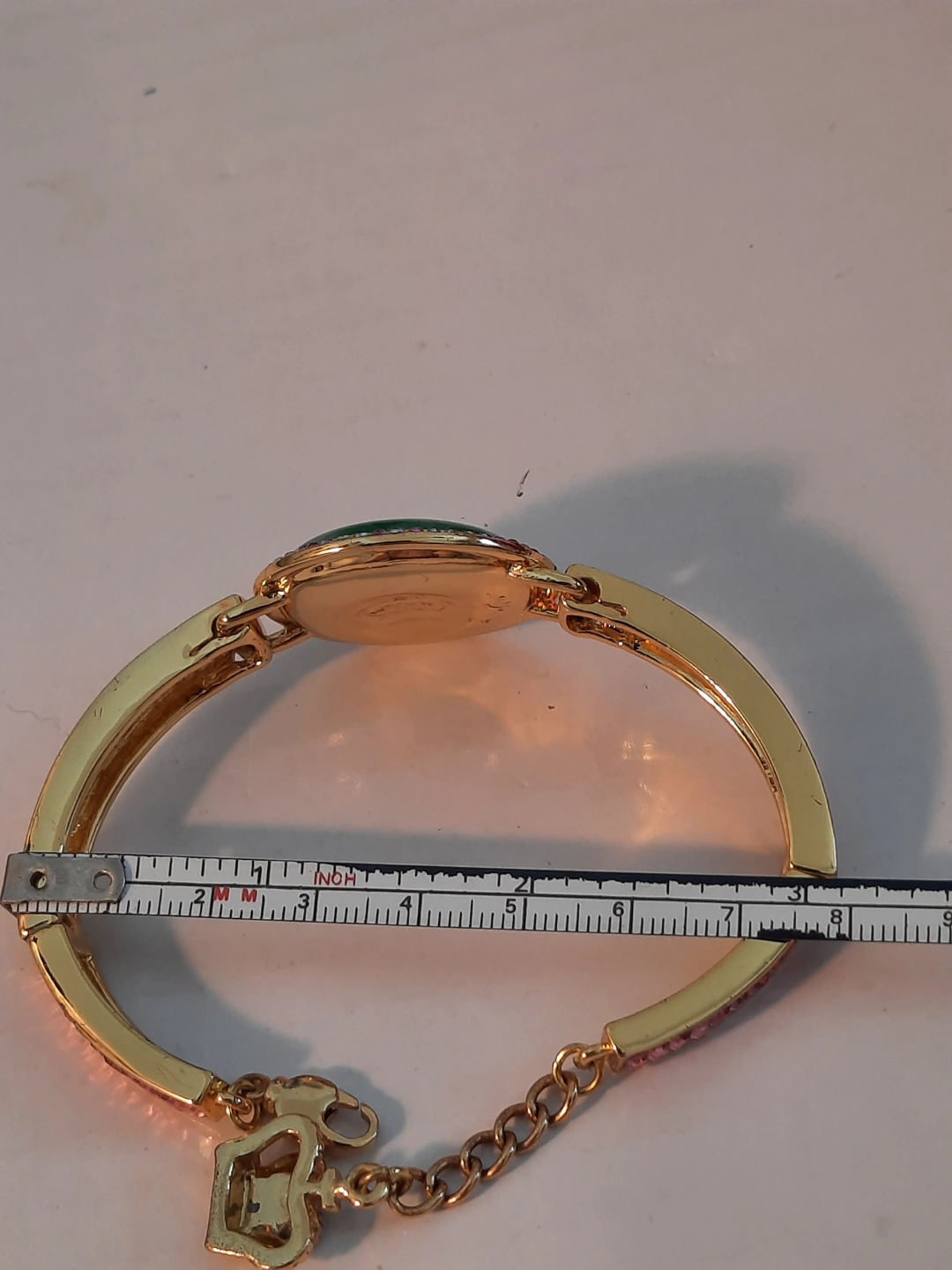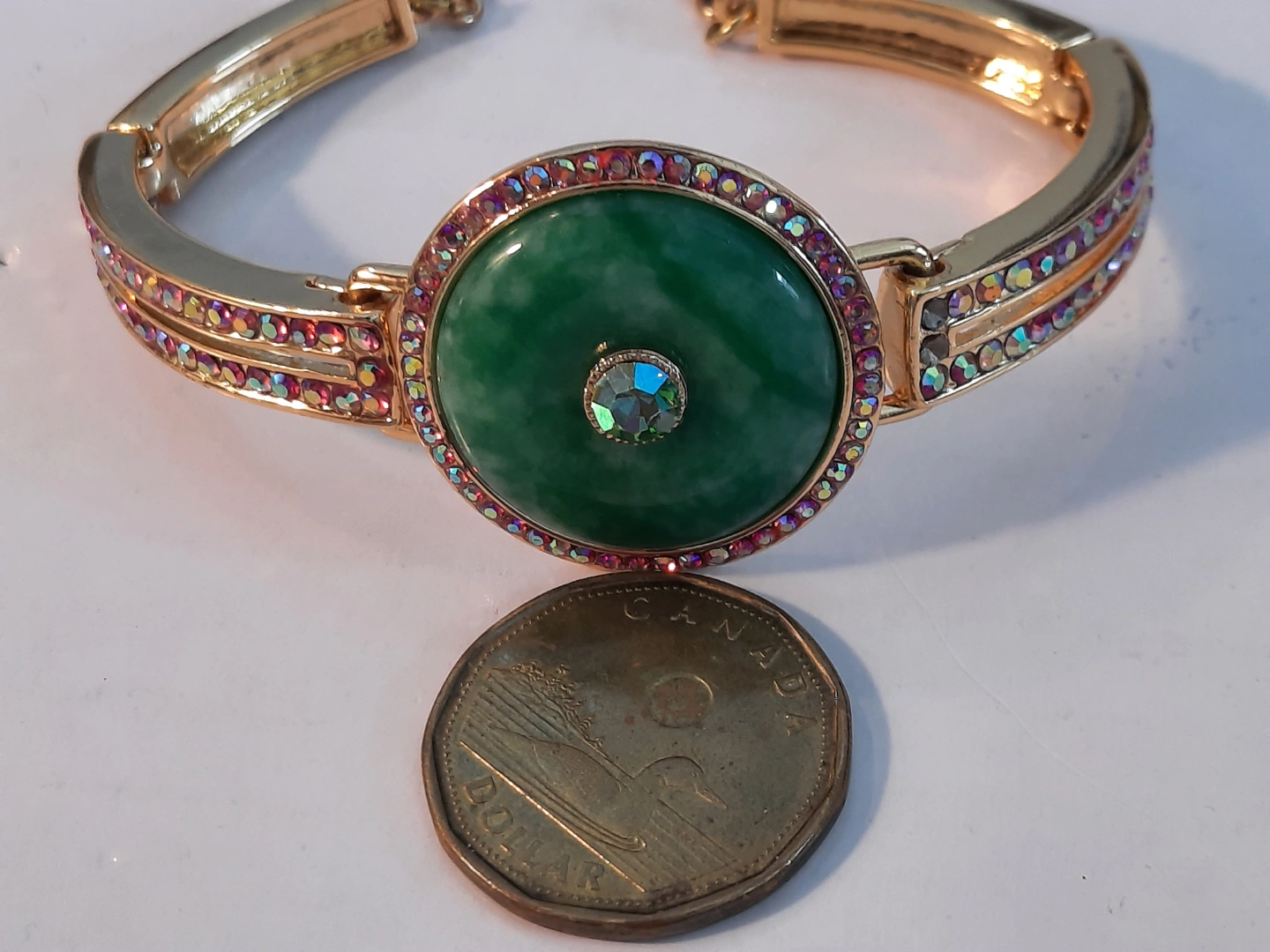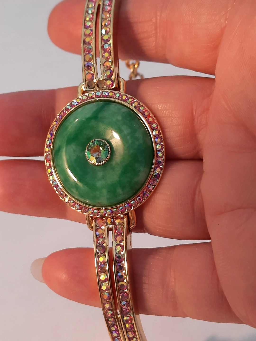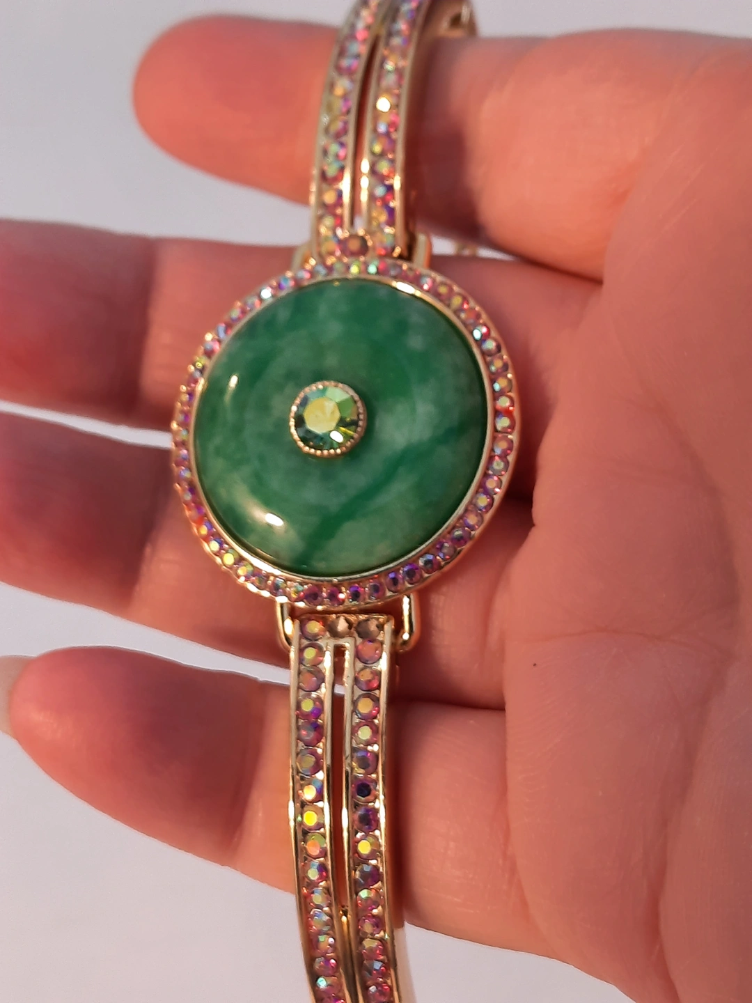 Beautiful gold-toned bracelet. Features a large green cabochon stone green jade surrounded by iridescent crystals. Gold-toned metal band adorned with pink and clear crystals. Adjustable clasp. Unique statement piece.