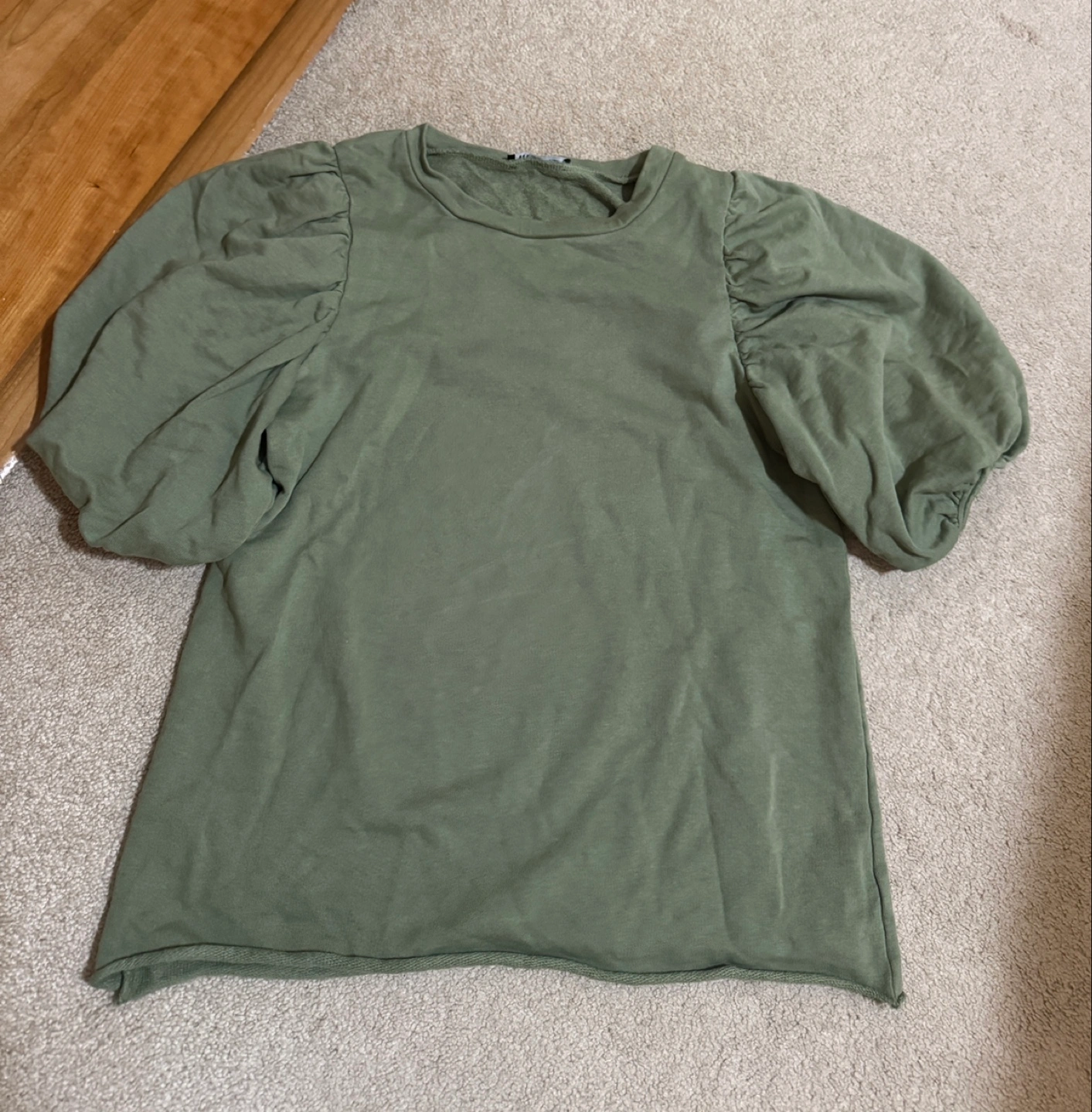 Women's olive green puff sleeve top. Short sleeves. Relaxed fit. Crew neck. Soft material. Casual style. Great for spring or summer.