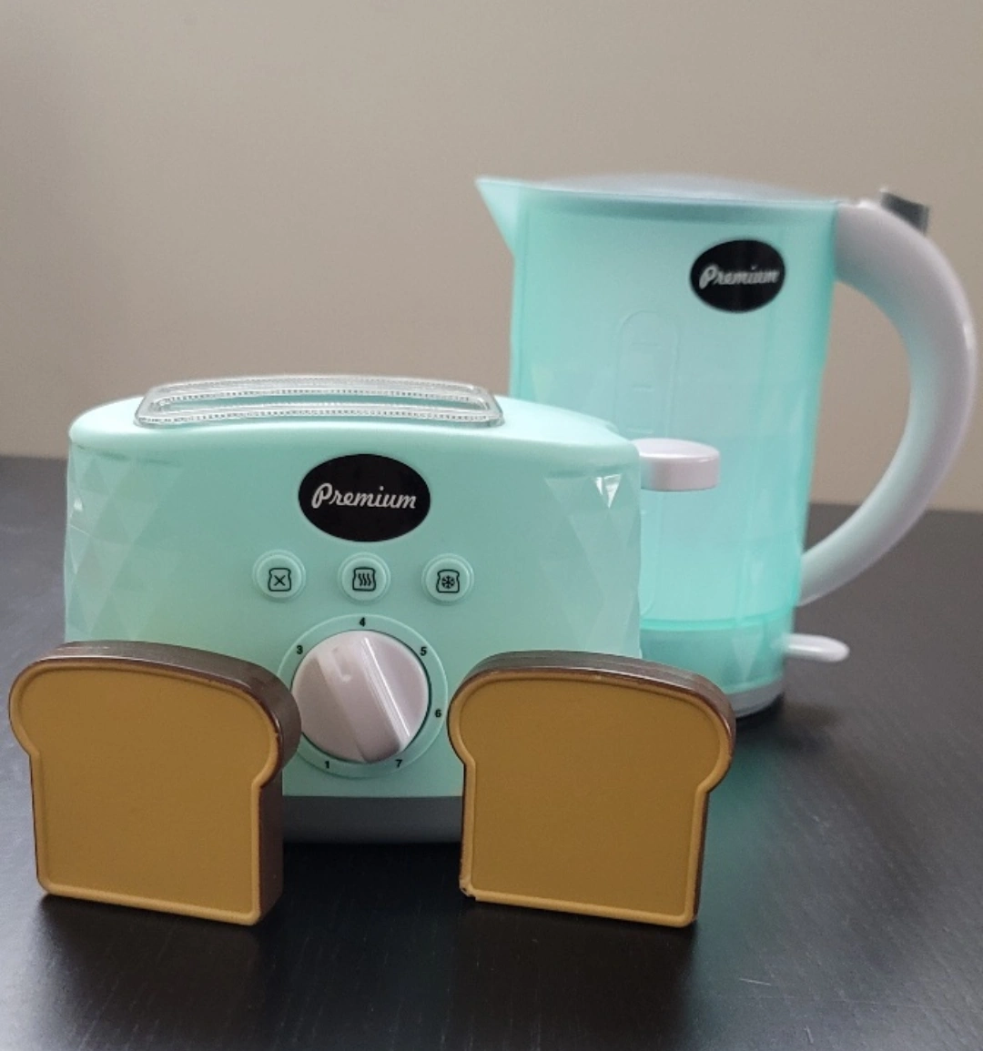 Adorable light teal children's pretend play kitchen set. Includes a kettle and toaster. Features lights and sounds. Requires 2x AAA batteries (included).