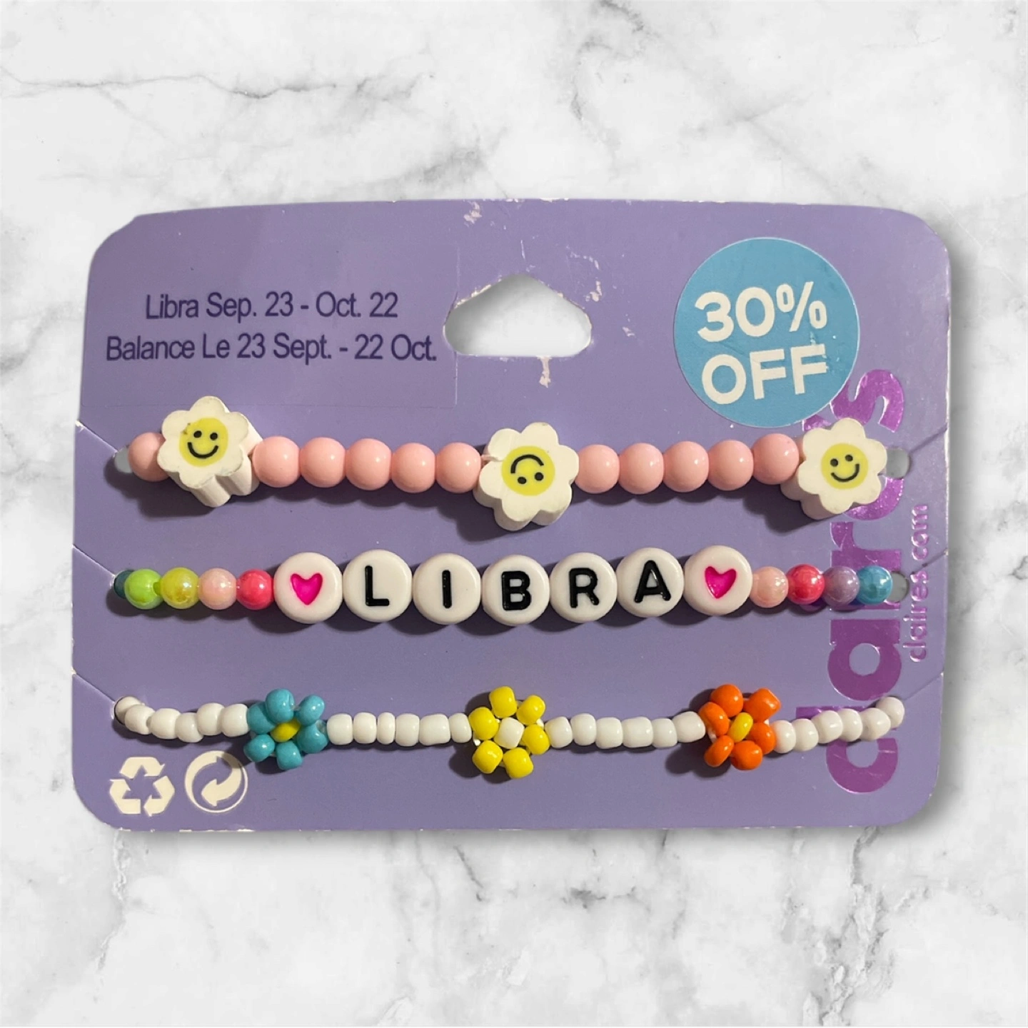 Three cute beaded bracelets. Pink beads with smiley face charms, rainbow beads with Libra lettering, and white beads with colourful flower charms. New without tags. Retail $12.50