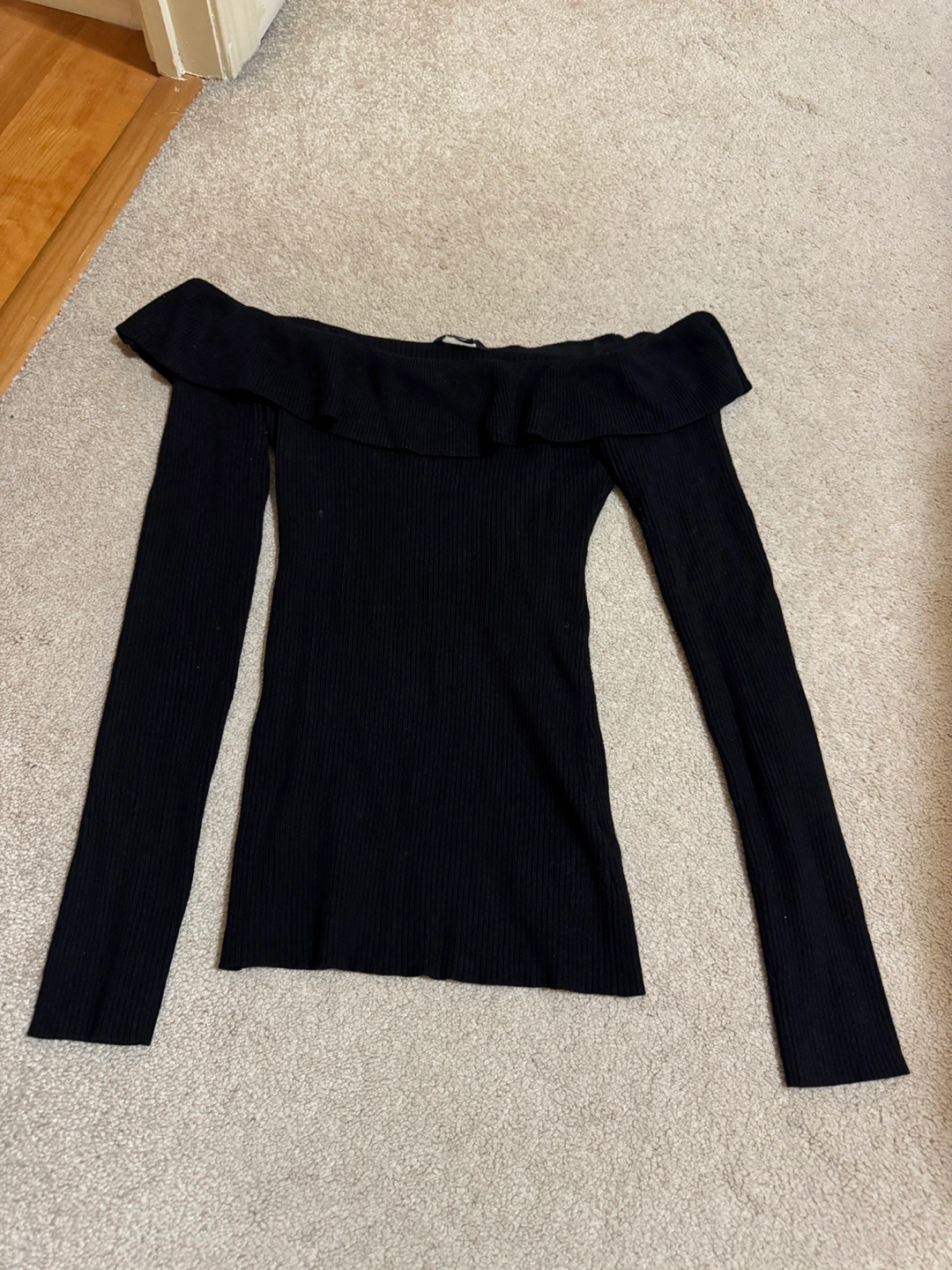 Long sleeve, off-the-shoulder black sweater. Ribbed knit material. Great for fall and winter.
