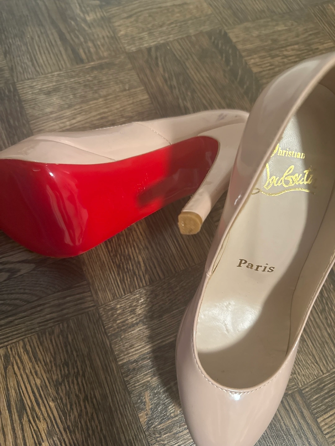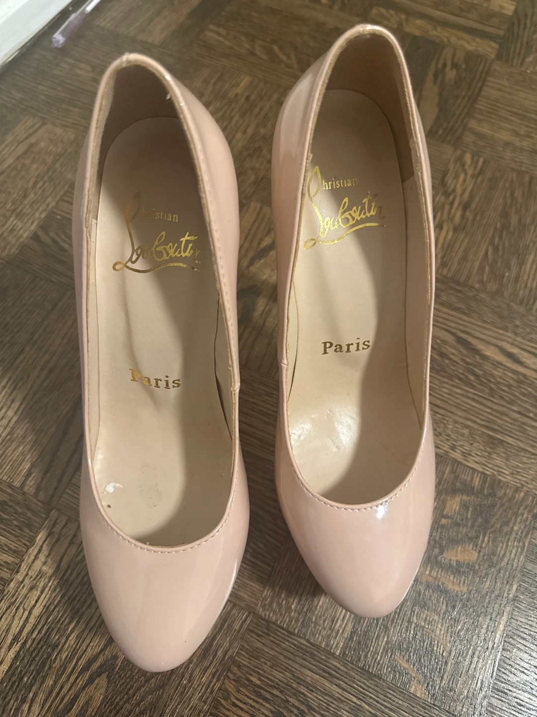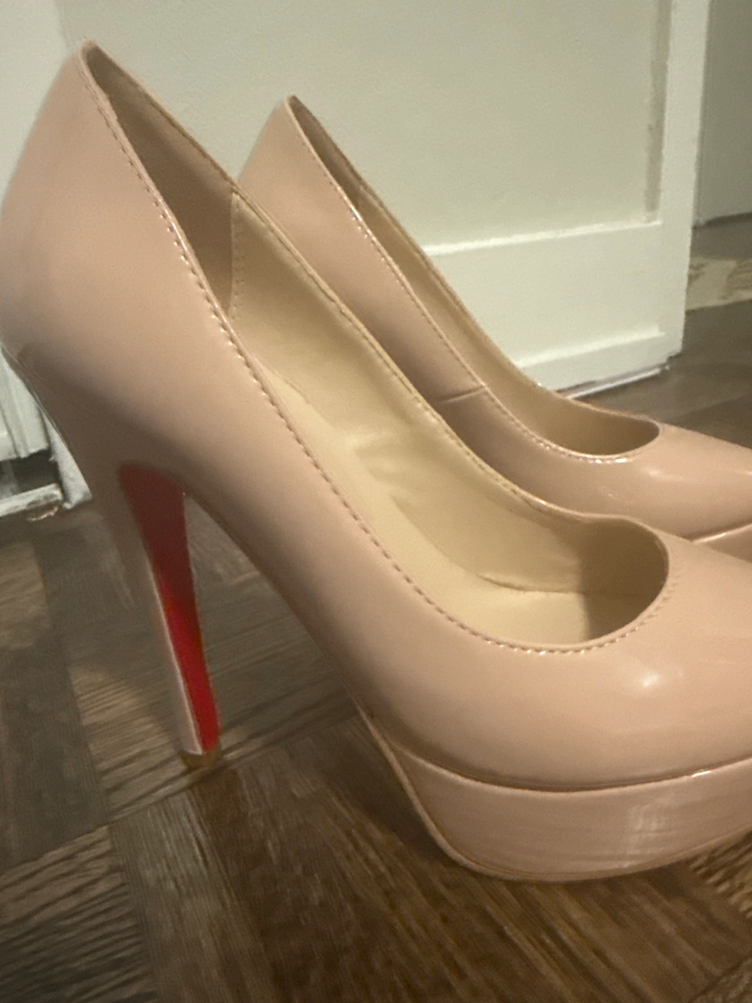 20Beautiful nude patent leather platform pumps. Red soles. Slight wear. Size not specified.
