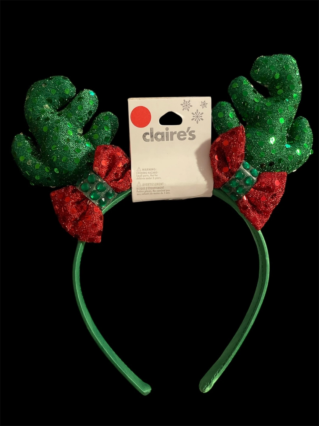 Christmas headband. Features green glitter antlers and red bows. Green plastic headband. New with tags. Retail $16.50