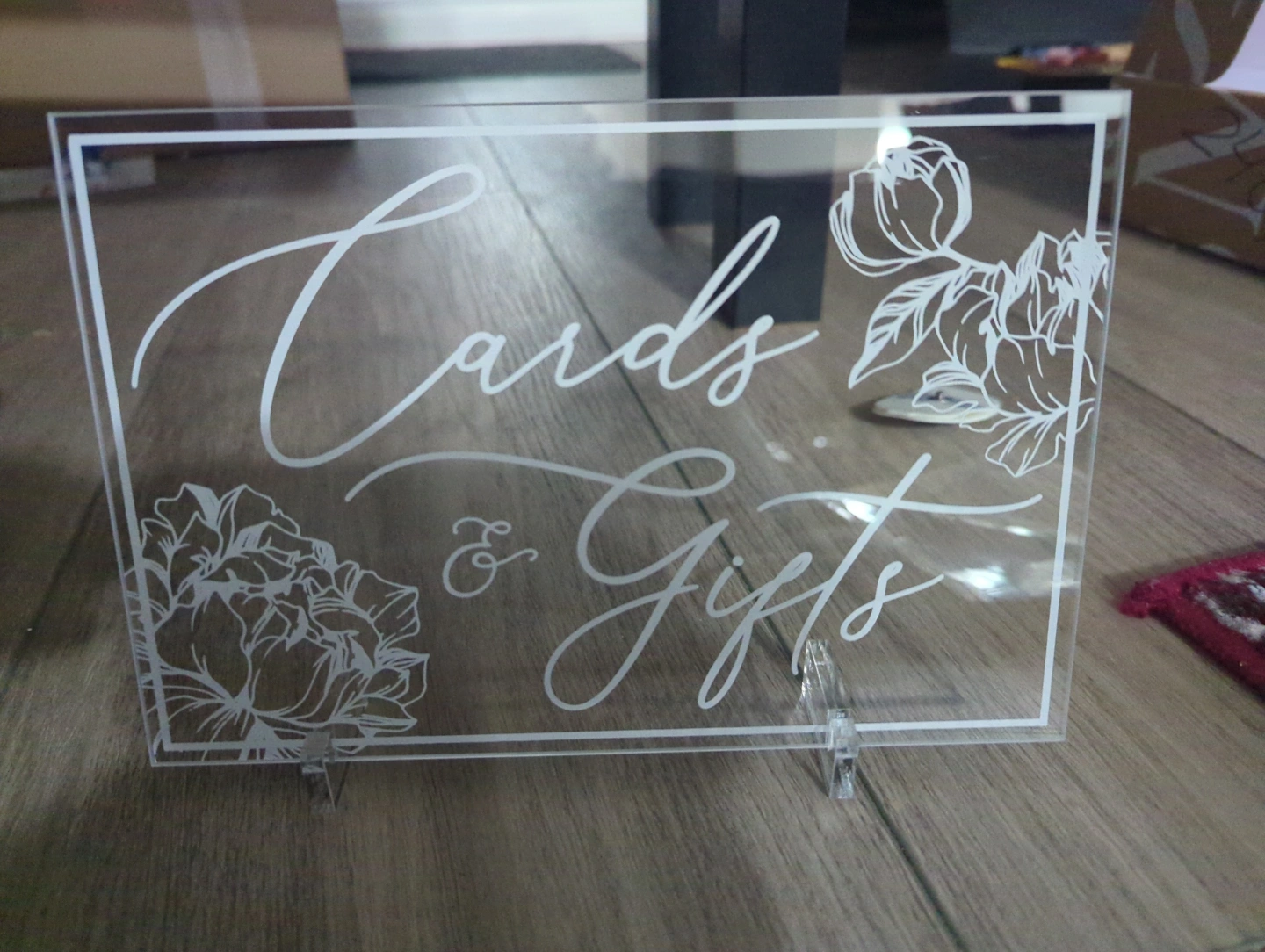Wedding sign, clear acrylic material. Features white floral design and calligraphy. Cards & Gifts text. Includes stand. Perfect for wedding reception.