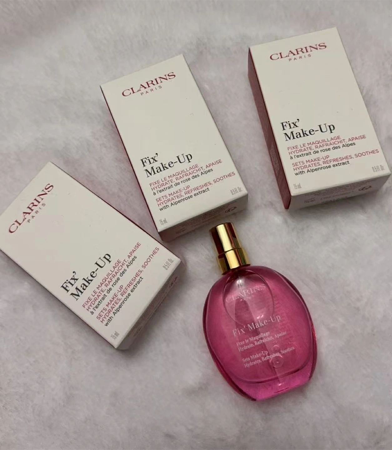 Three 15ml bottles of Clarins Fix' Make-Up setting spray. Hydrates, refreshes, and soothes skin. Sets makeup.$7 each . 3 together for $20.