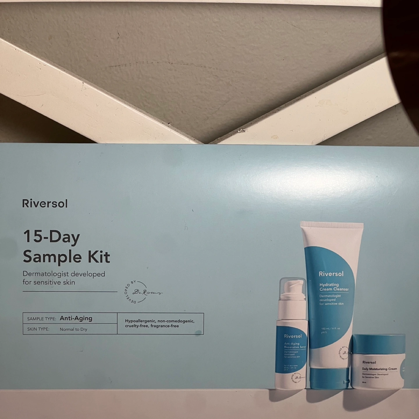 New, unopened Riversol 15-day sample kit. Includes cleanser, serum, moisturizer, and exfoliating peel. Dermatologist-developed for sensitive skin. Anti-aging formula.