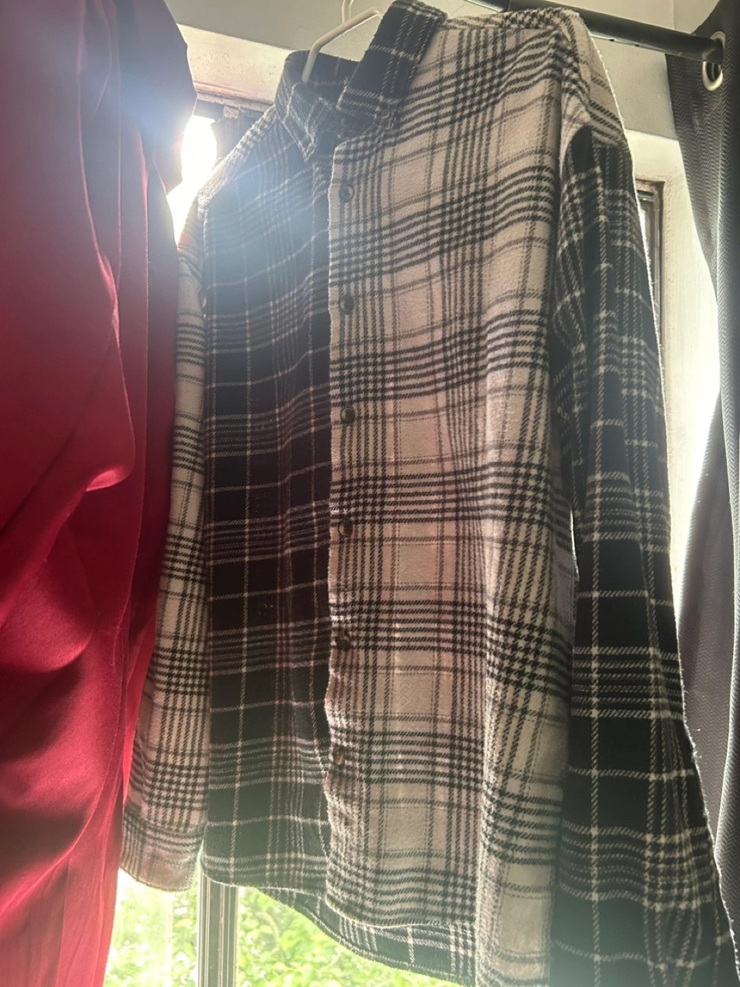 Men's long-sleeve button-up flannel shirt. Black and white plaid pattern. Two-toned design. Great for layering.