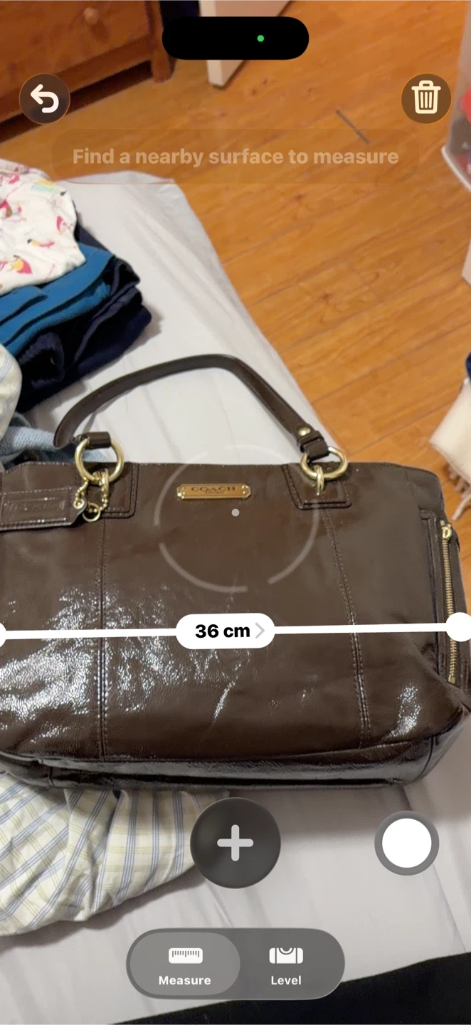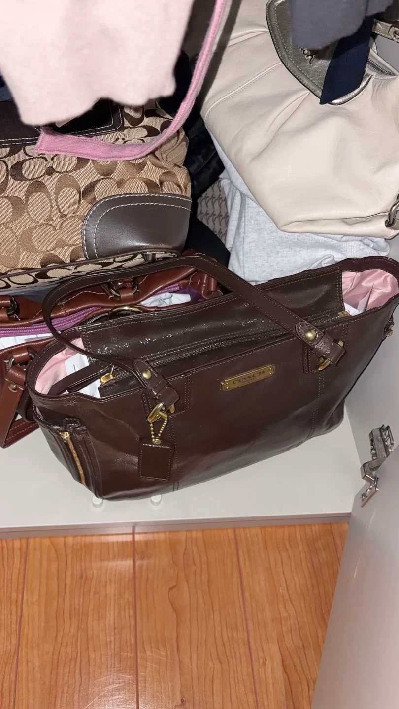 Shiny brown leather Coach tote bag. It has a zippered top closure and gold-tone hardware. Interior lining is a soft pink.