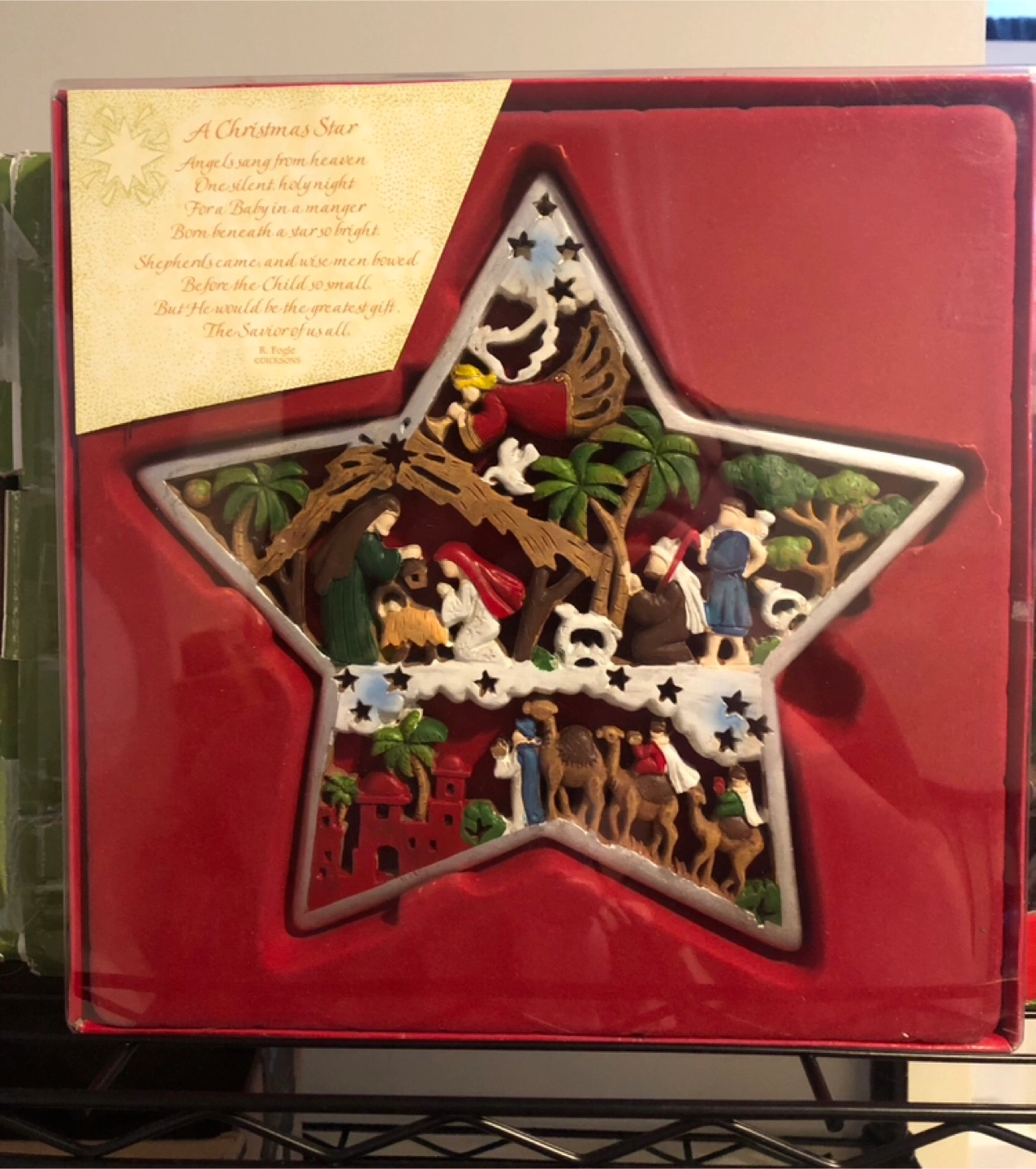 Beautiful star-shaped wall decoration. Features a nativity scene with the three wise men and shepherds. Comes in original packaging. Perfect for holiday decorating. Was used a few times; but has mostly been stored away, so it’s in like new condition. Price is firm. Pick up in Newton. Can meet some locations. Cash only please.