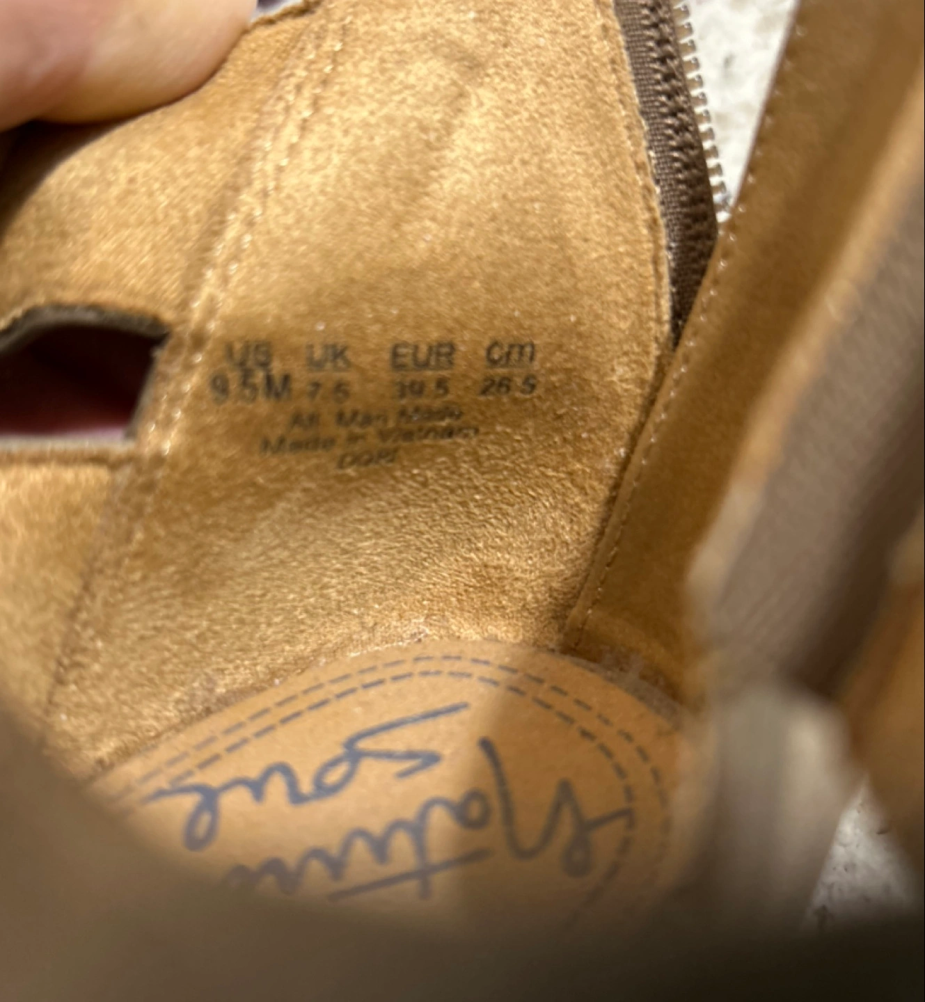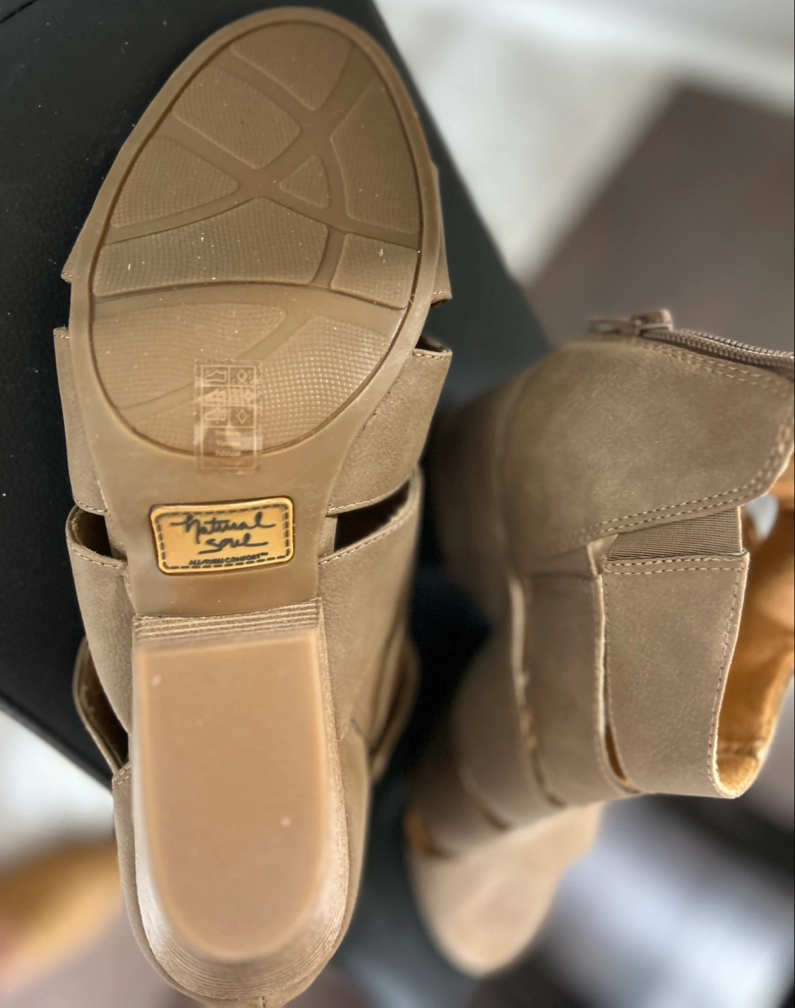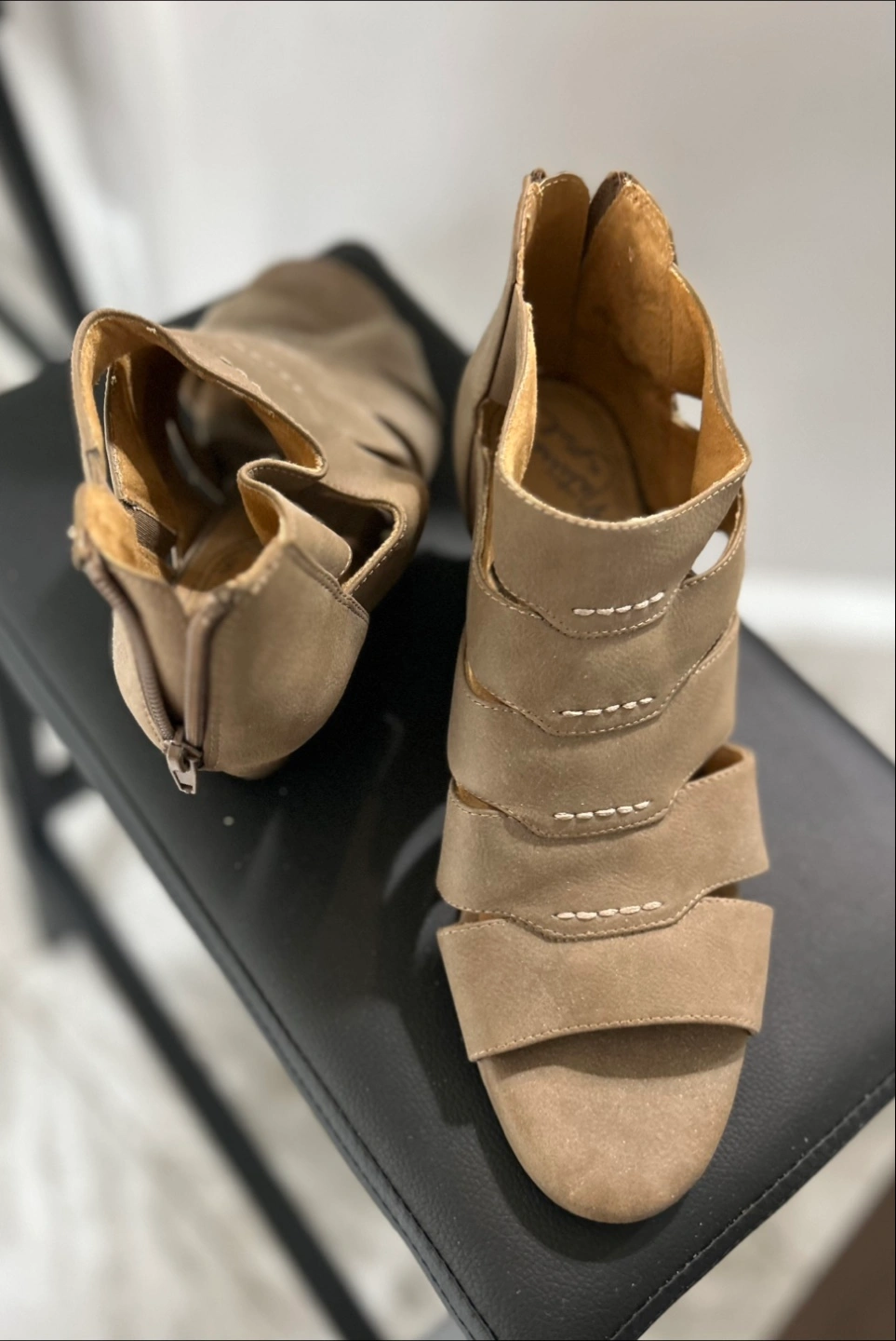 Stylish taupe-coloured wedge sandals. Features cut-out detailing and a back zip closure. Comfortable and perfect for warmer weather. Size 9.5M.