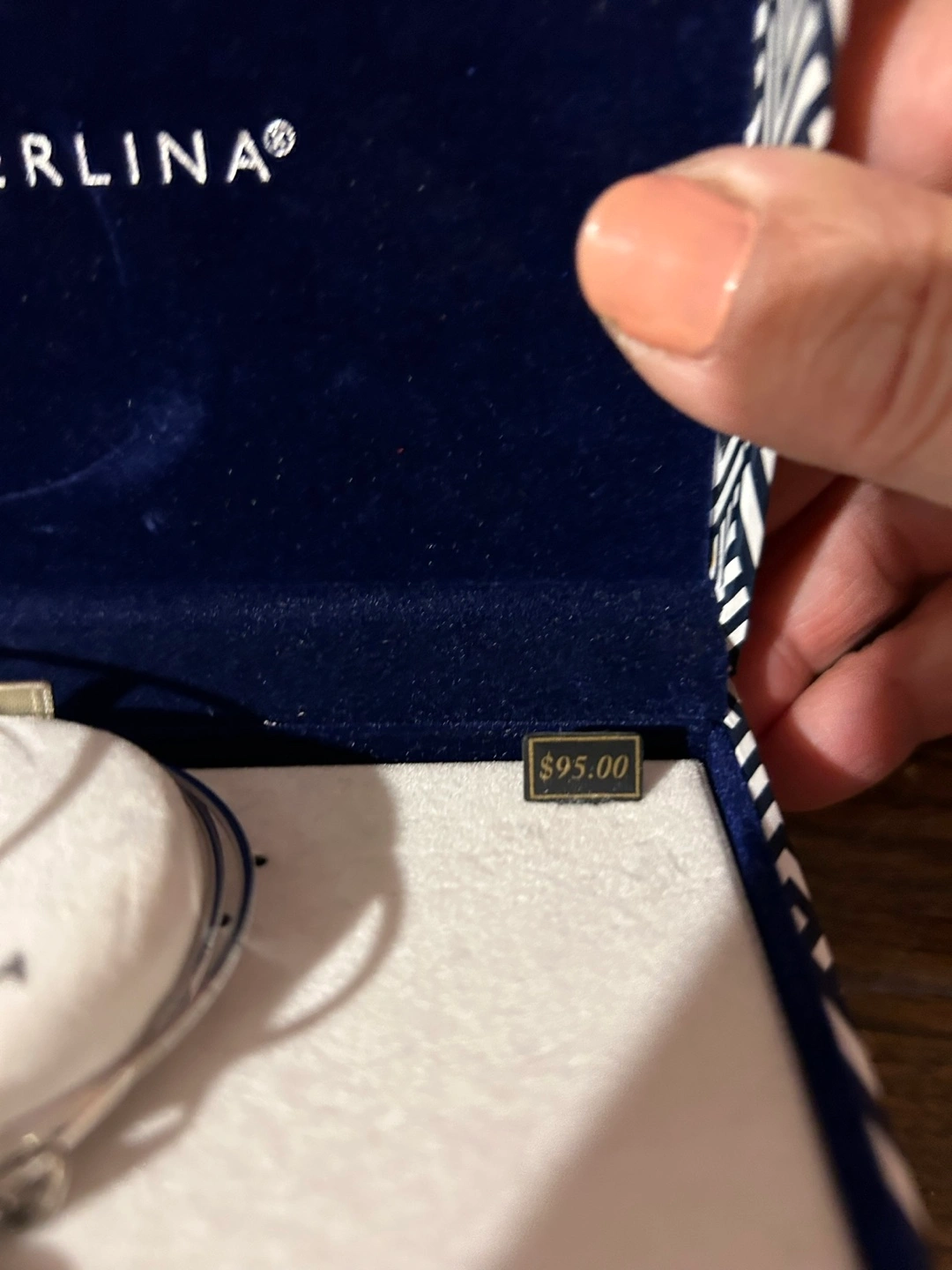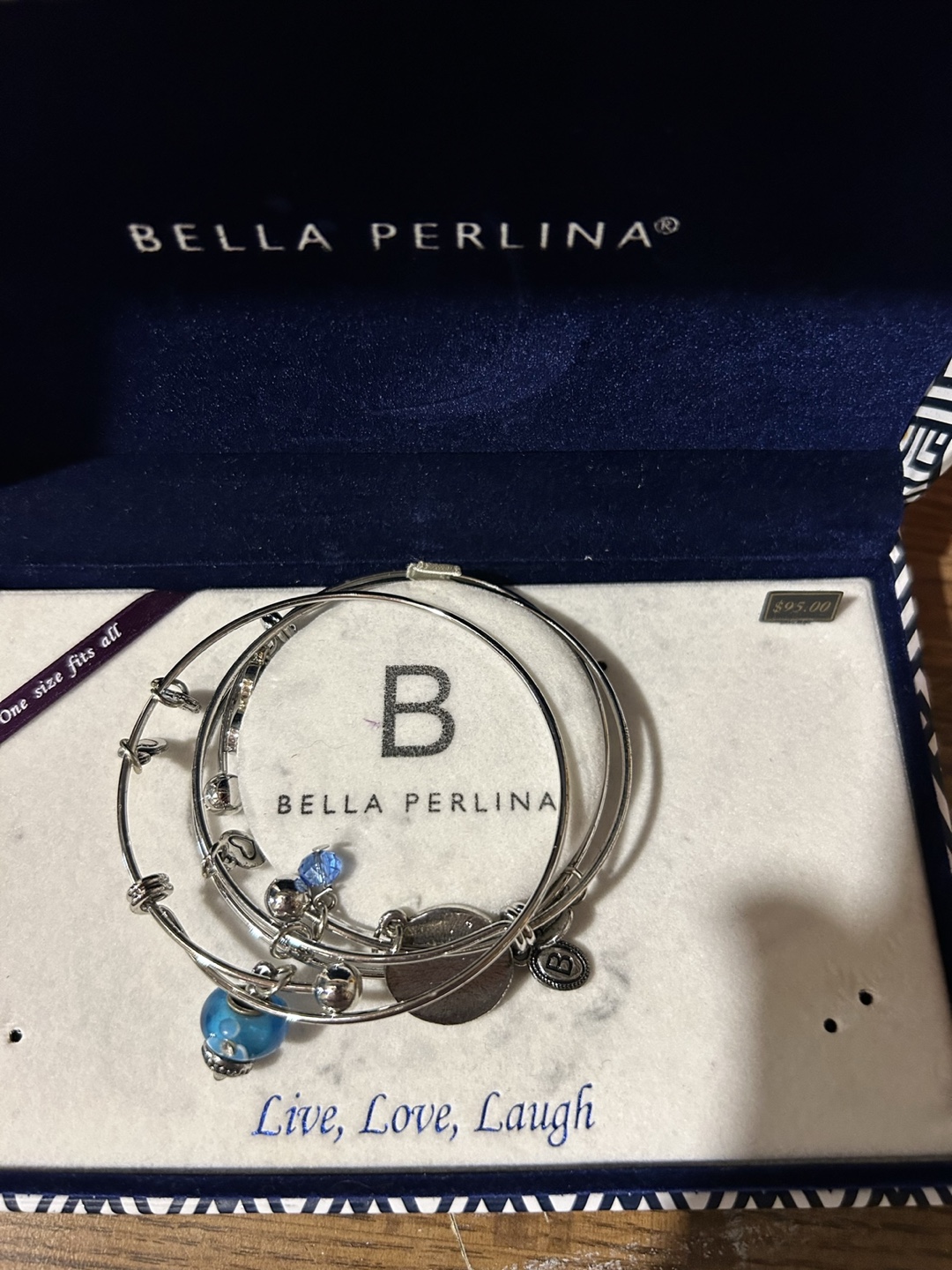 New Bella Perlina bracelet set. Three silver bangles, blue and silver charm accents. Live, Love, Laugh inscription. One size fits all. Comes in original packaging.