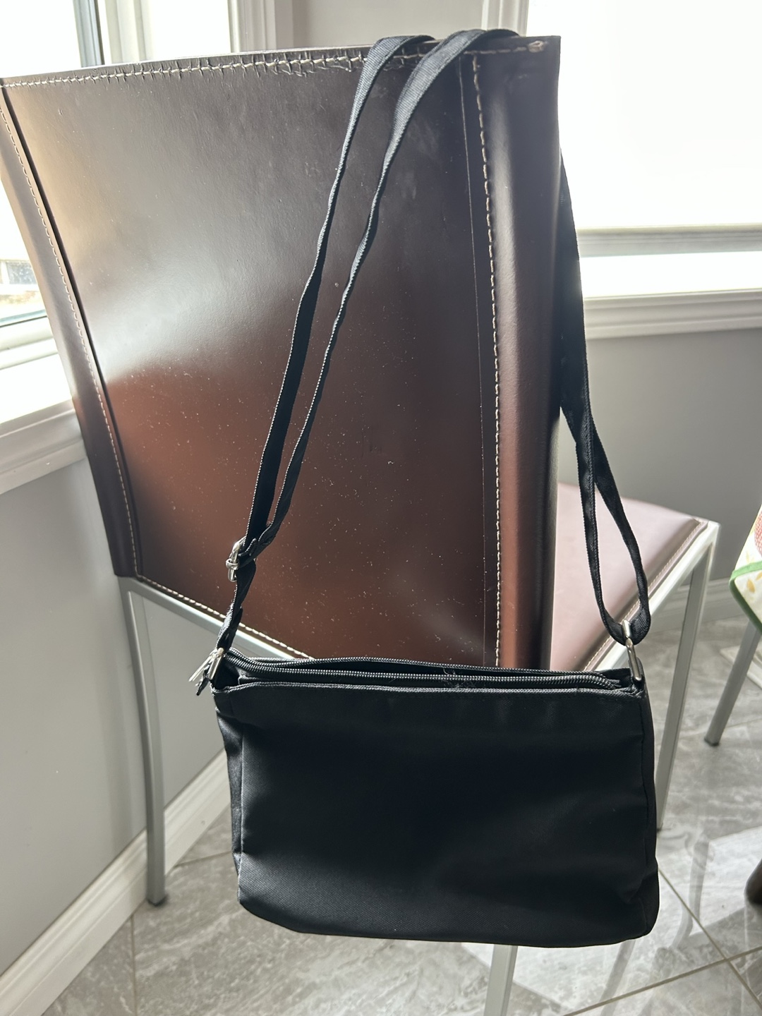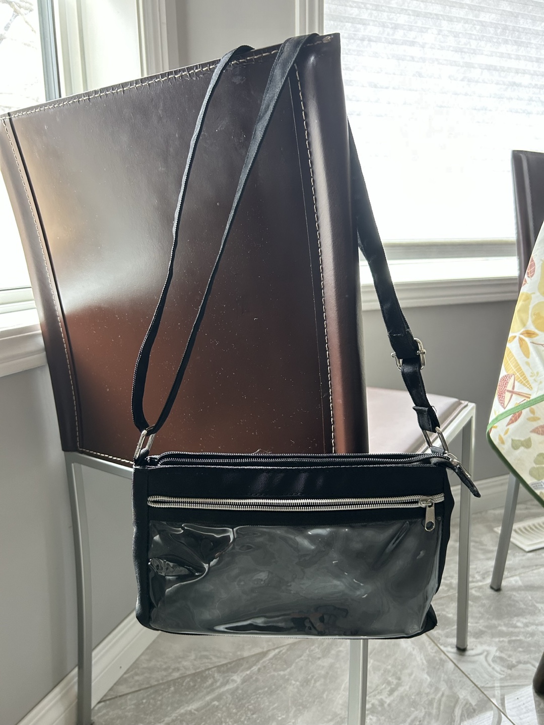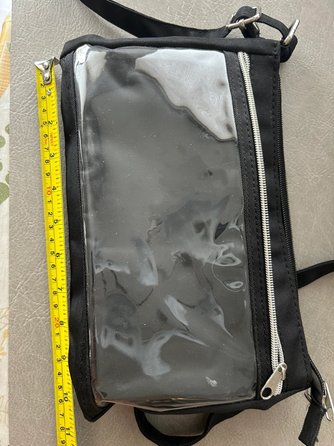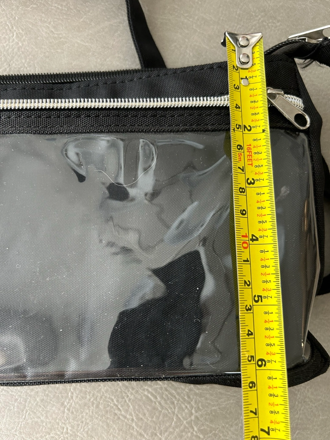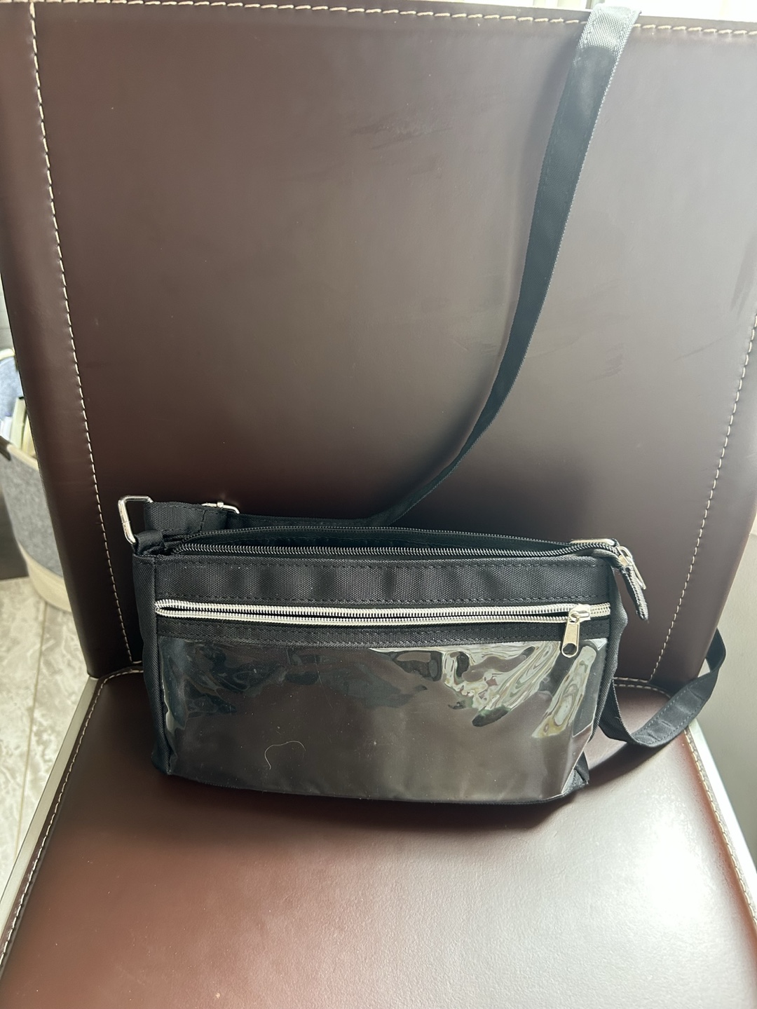 Small black nylon crossbody bag. Features two zippered compartments and a clear plastic ID window. Adjustable strap. Approximately 10 inches wide.