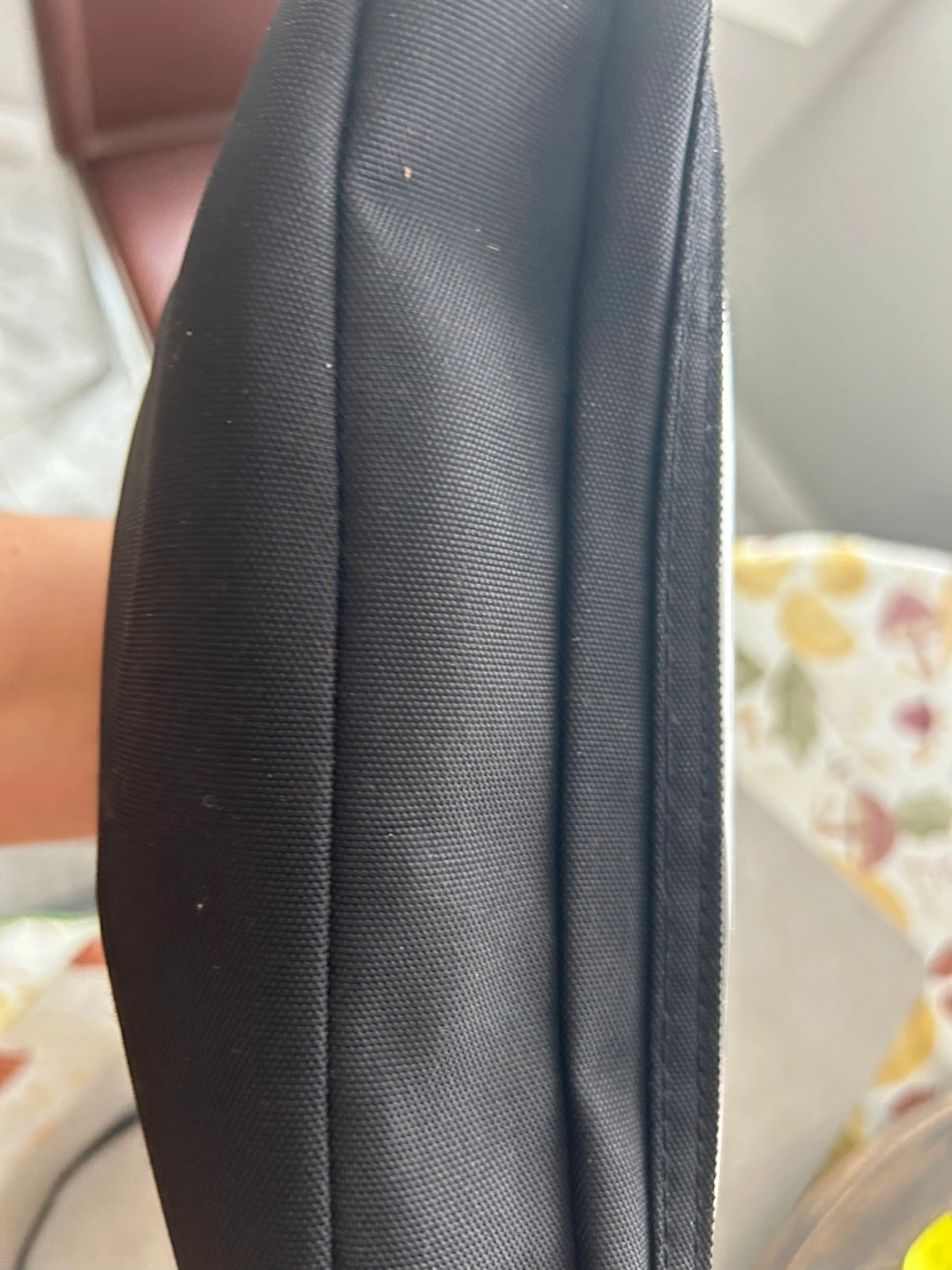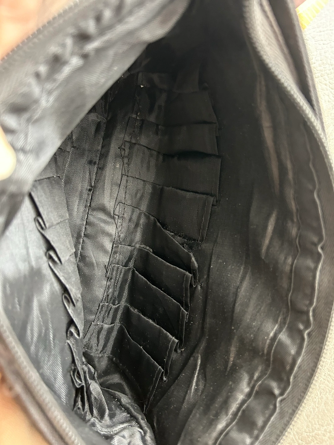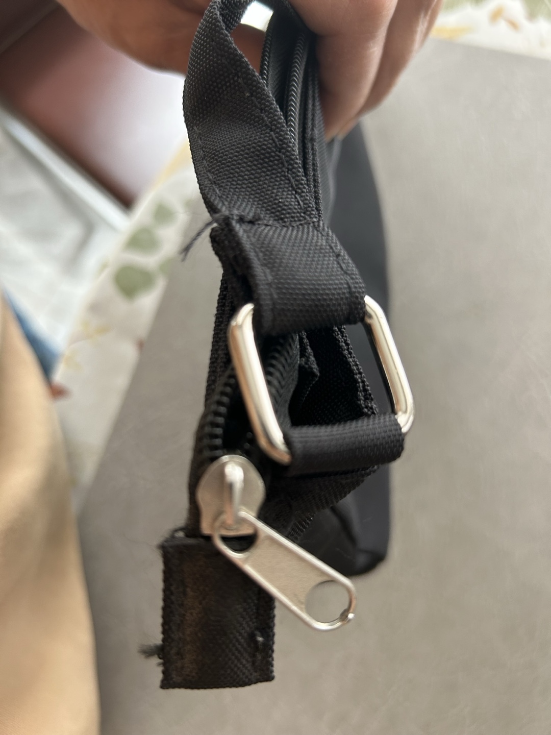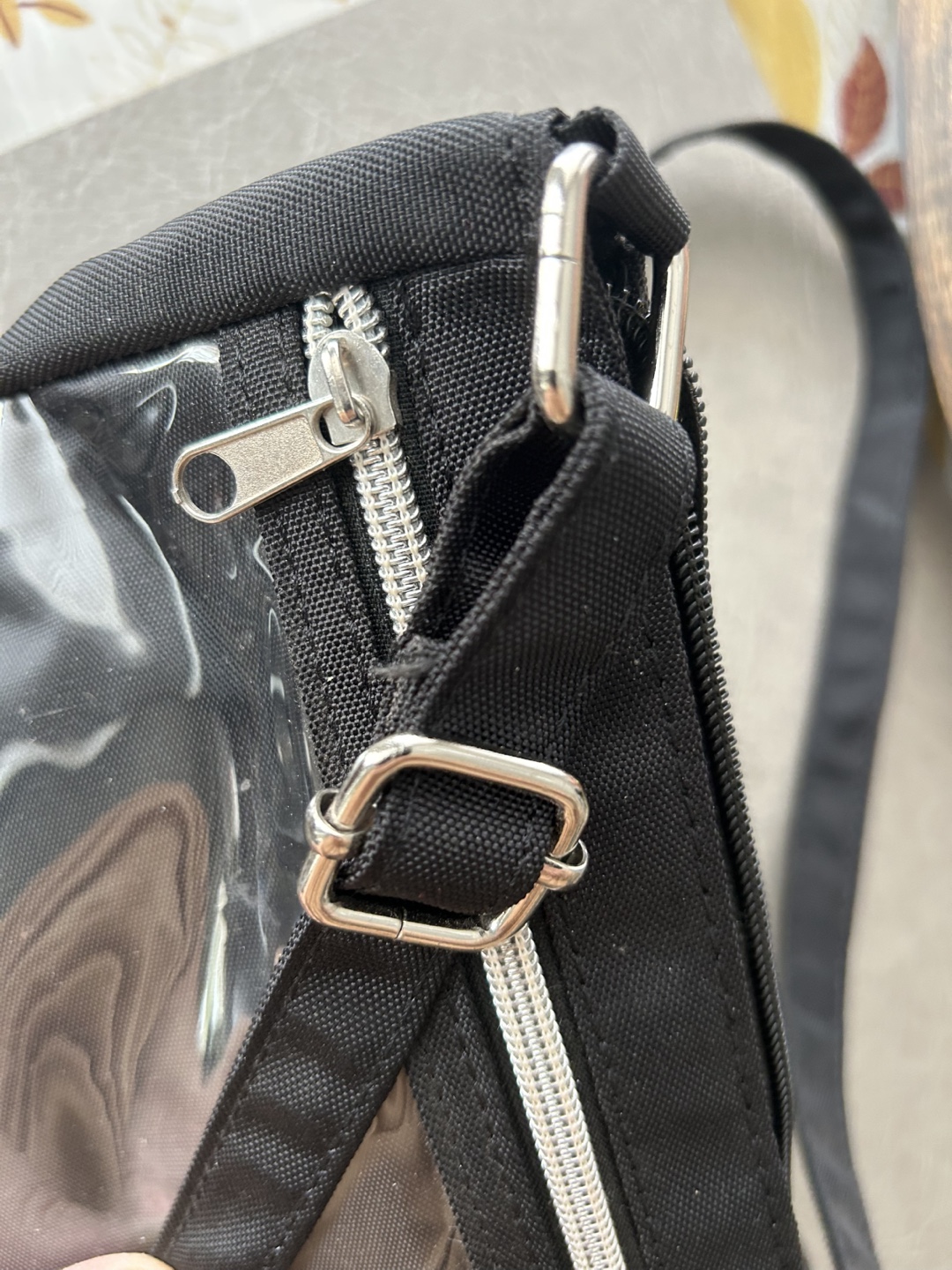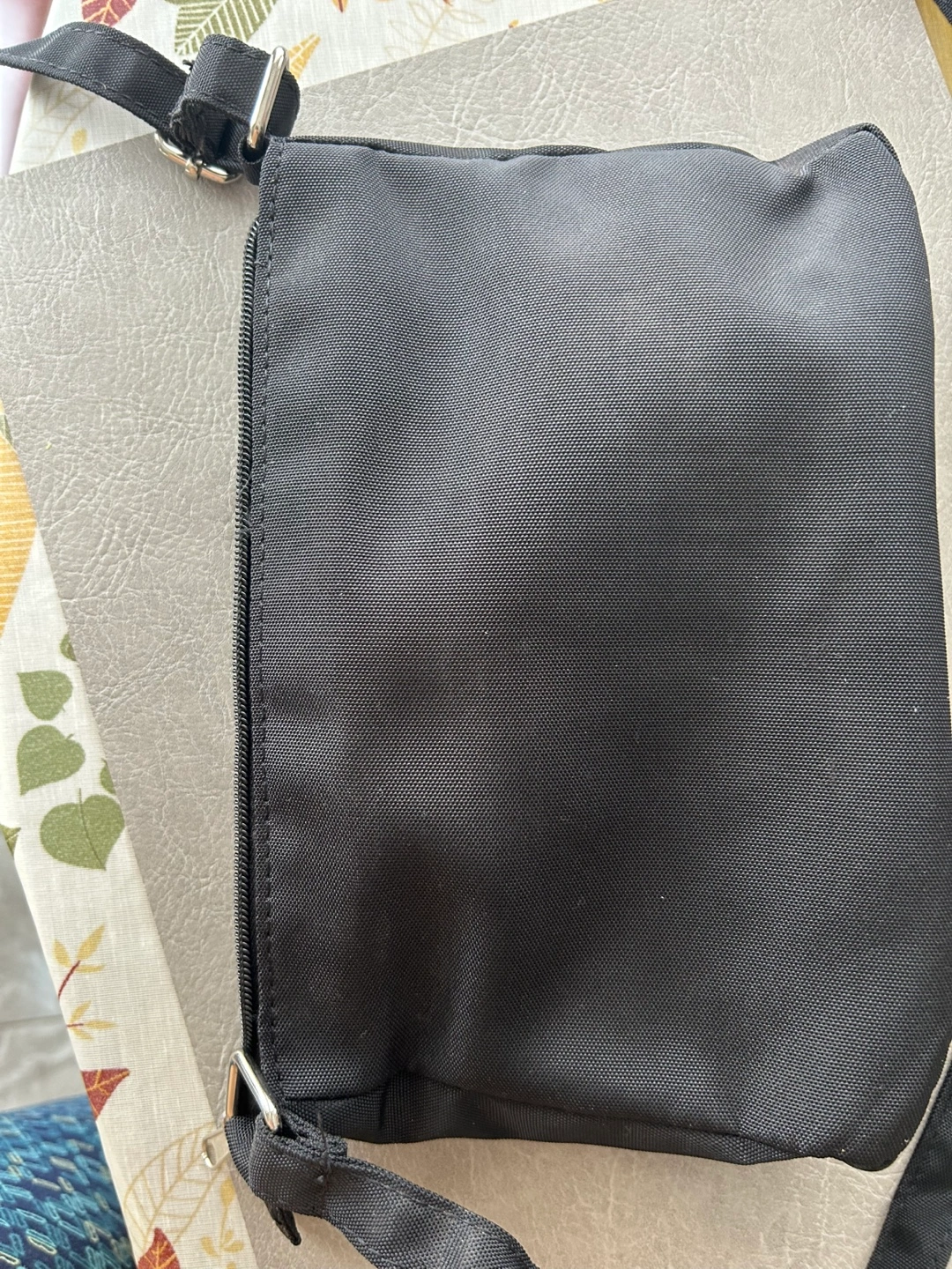 Small black nylon crossbody bag. Features two zippered compartments and a clear plastic ID window. Adjustable strap. Approximately 10 inches wide.