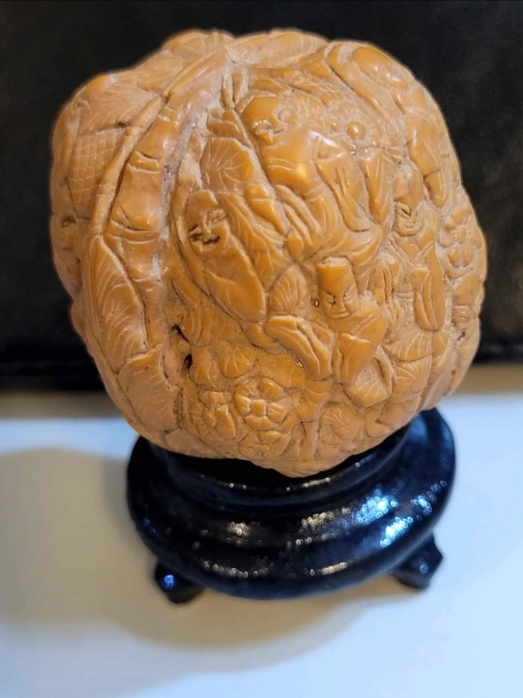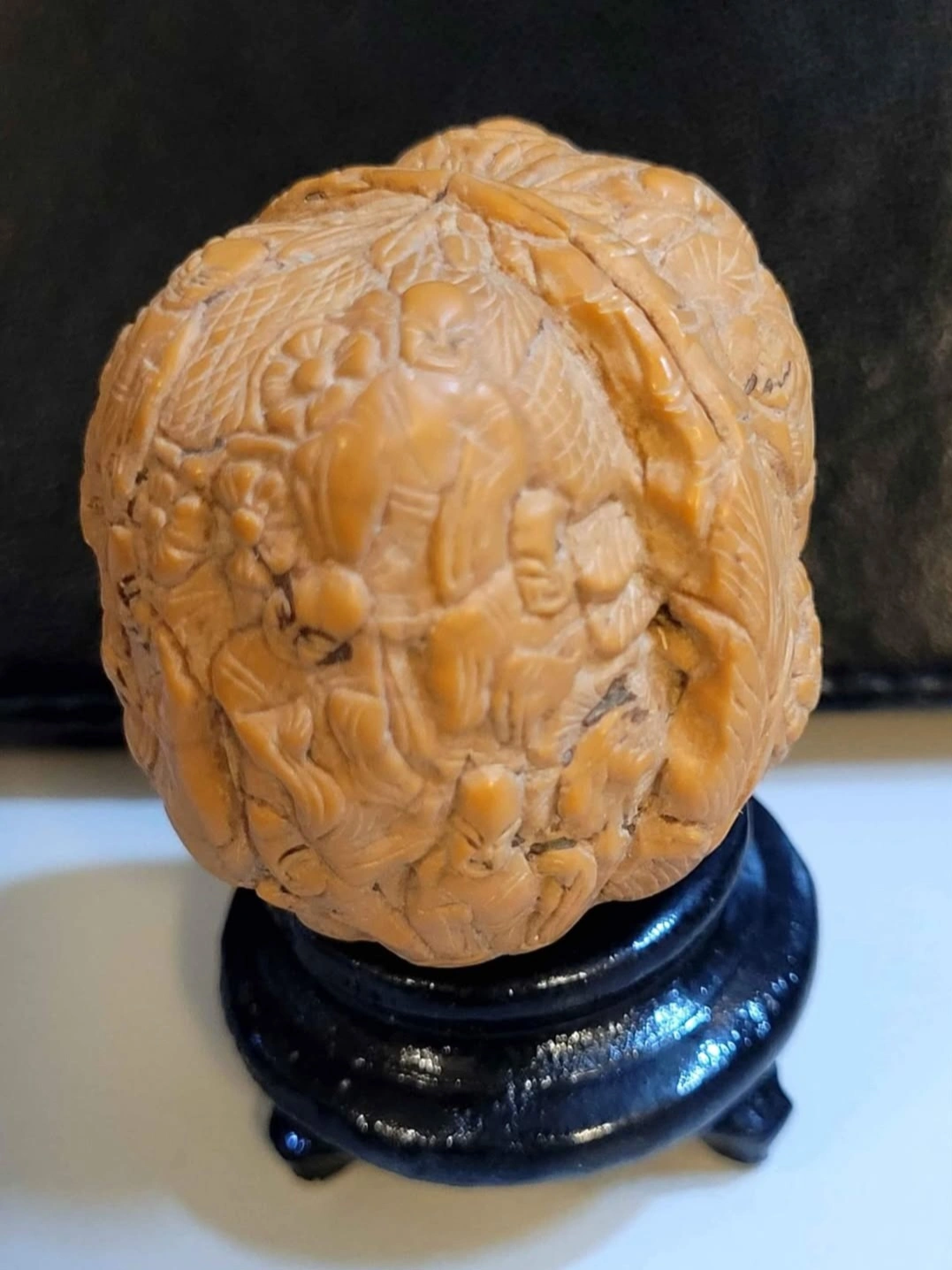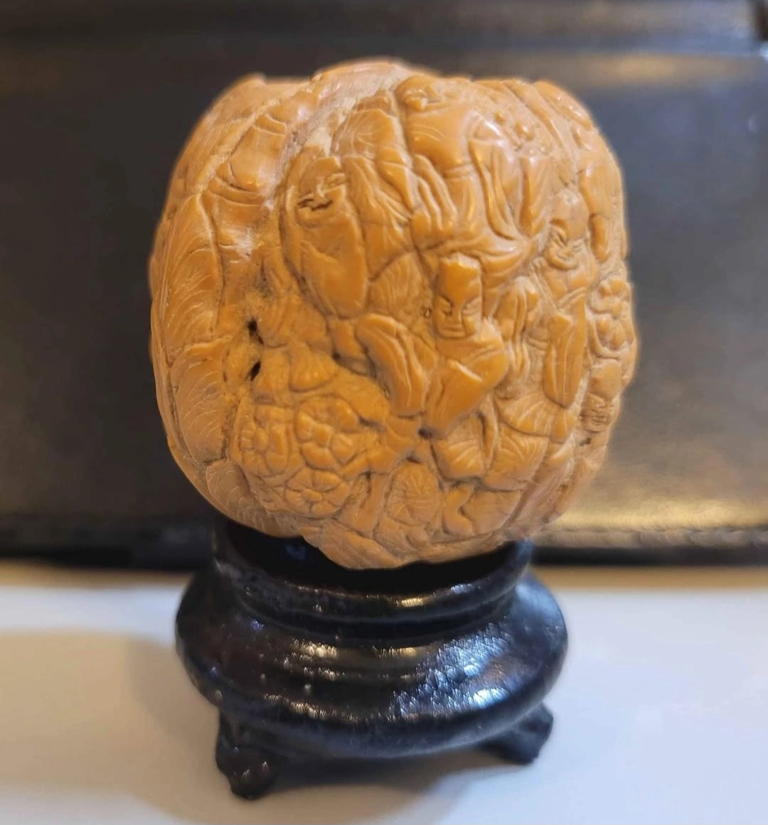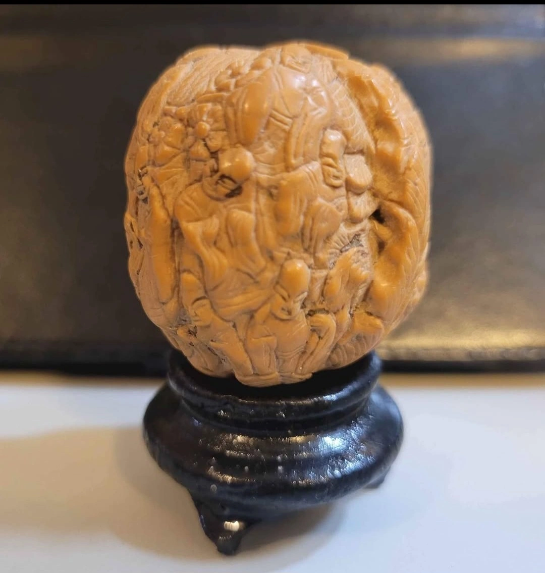 18 Monks Hand-carved walnut ball featuring detailed figurines and floral designs. Rests on a small, dark stand. Unique collectible or decorative piece.