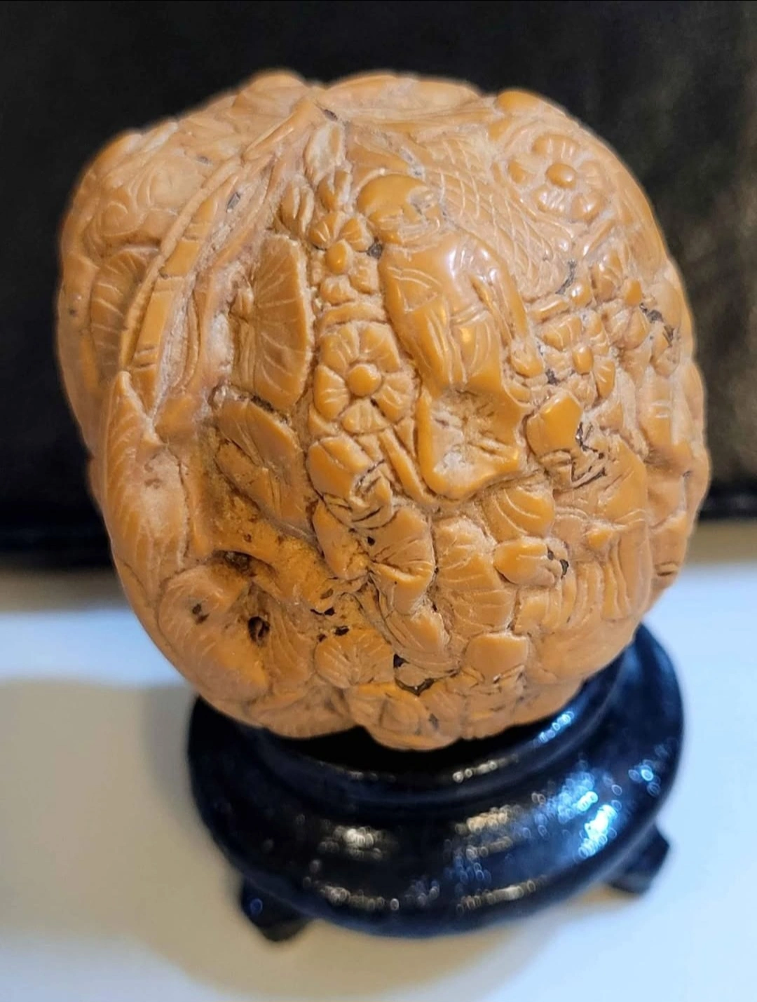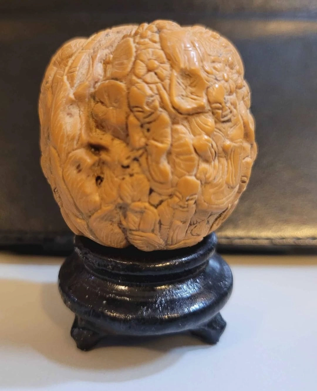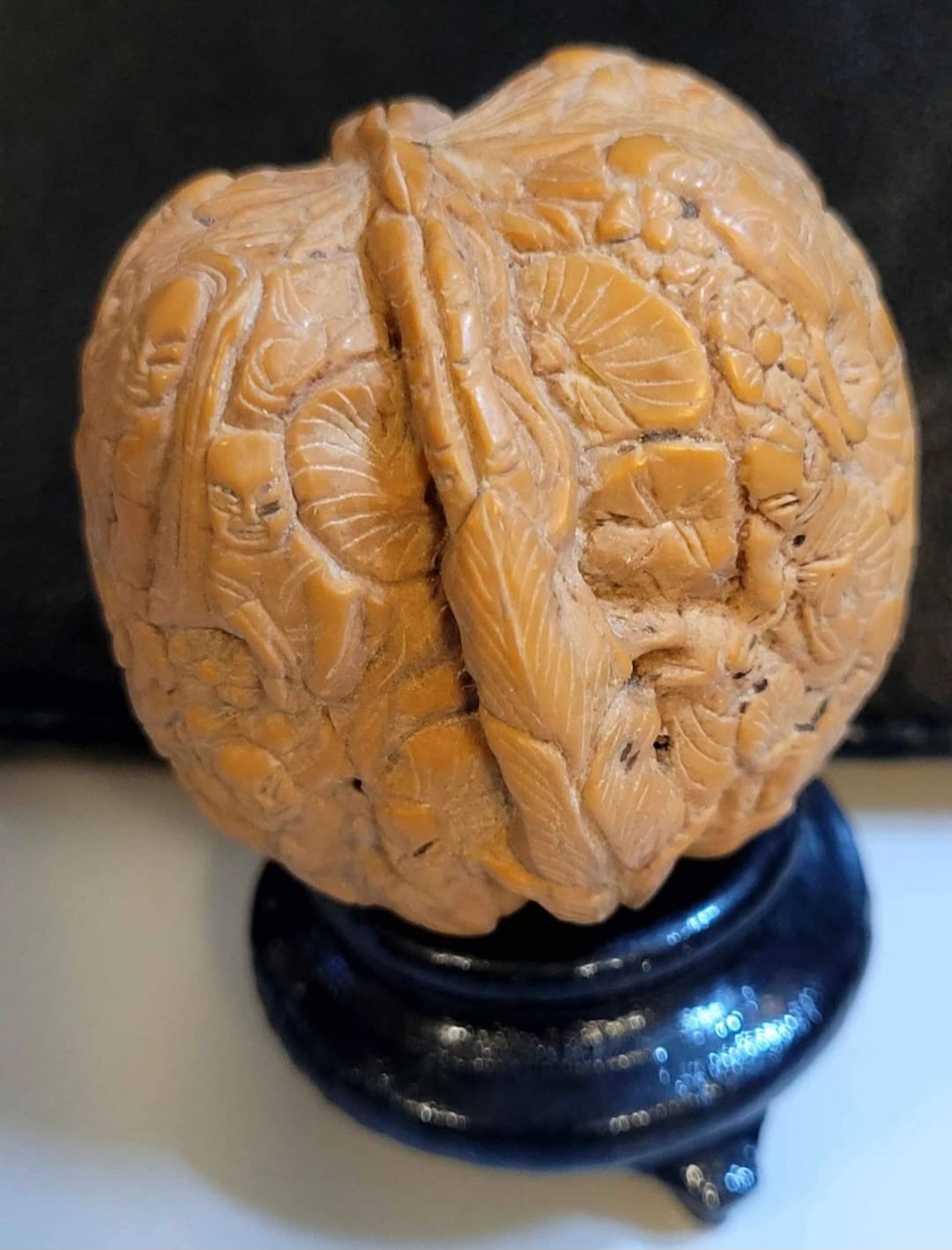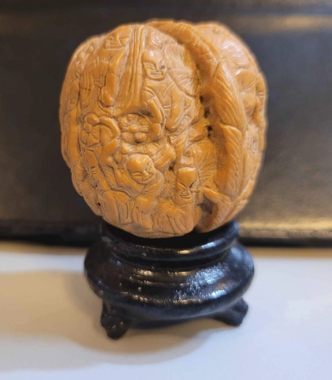 18 Monks Hand-carved walnut ball featuring detailed figurines and floral designs. Rests on a small, dark stand. Unique collectible or decorative piece.