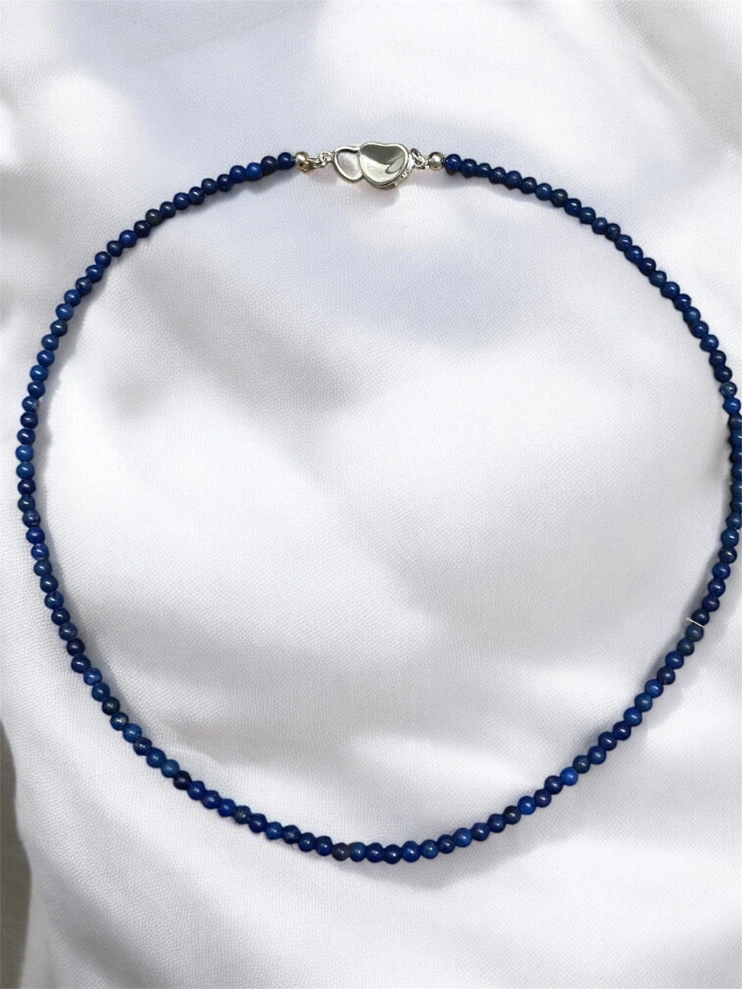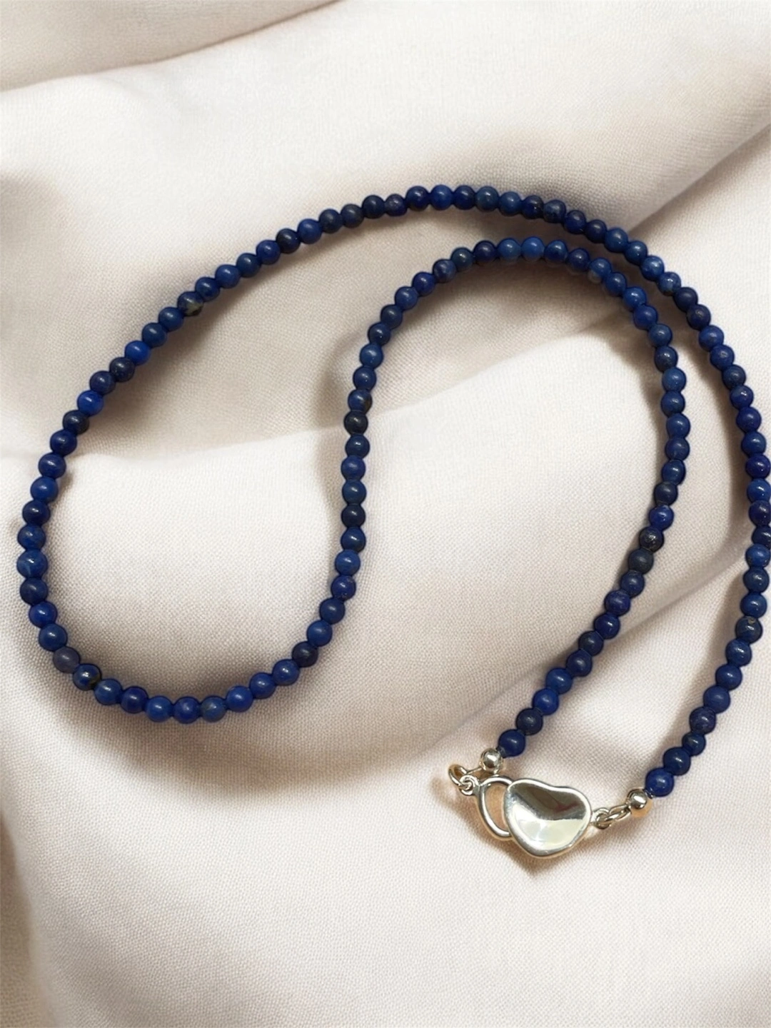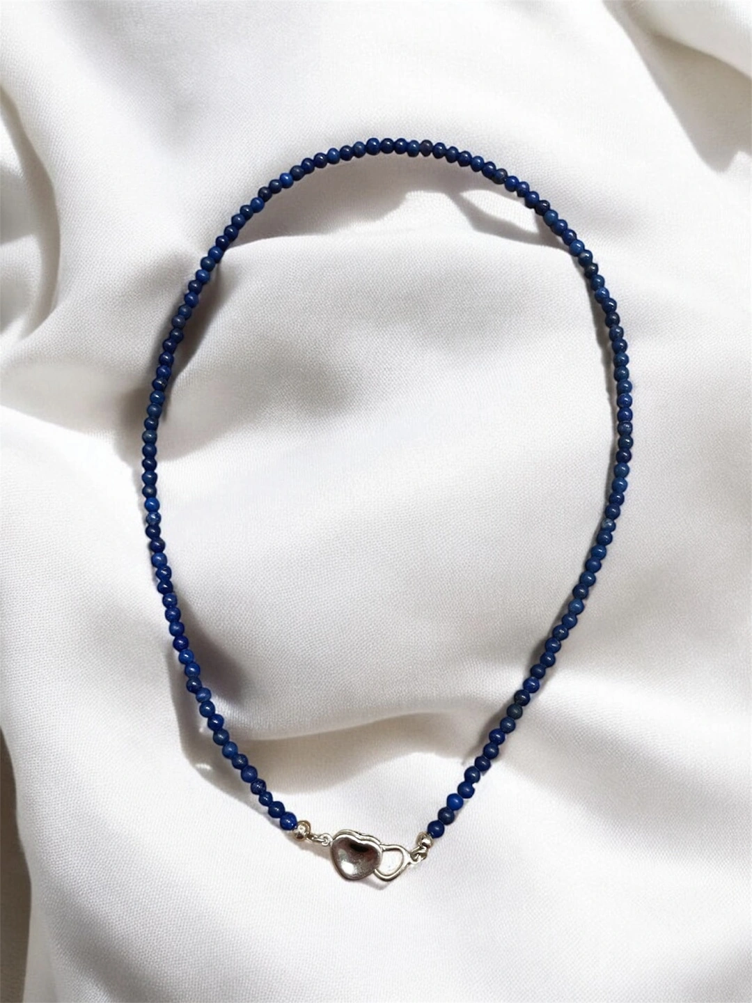 Dainty lapis lazuli beaded necklace. Features a 925 silver heart clasp. Beautiful and delicate.